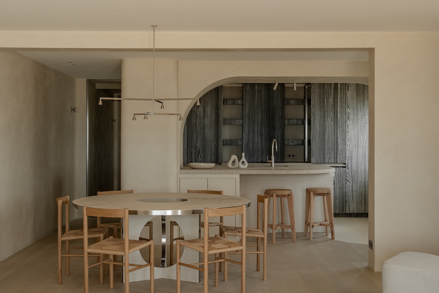 Stainless steel threads through the project as both material anchor and conceptual binding agent. From door detailing to the custom dining table, its brushed surface maintains consistency while avoiding the cold sterility often associated with the material. The steel here possesses what might be called tactile intelligence – surfaces that invite touch rather than repel it, edges that guide the hand rather than cut it.