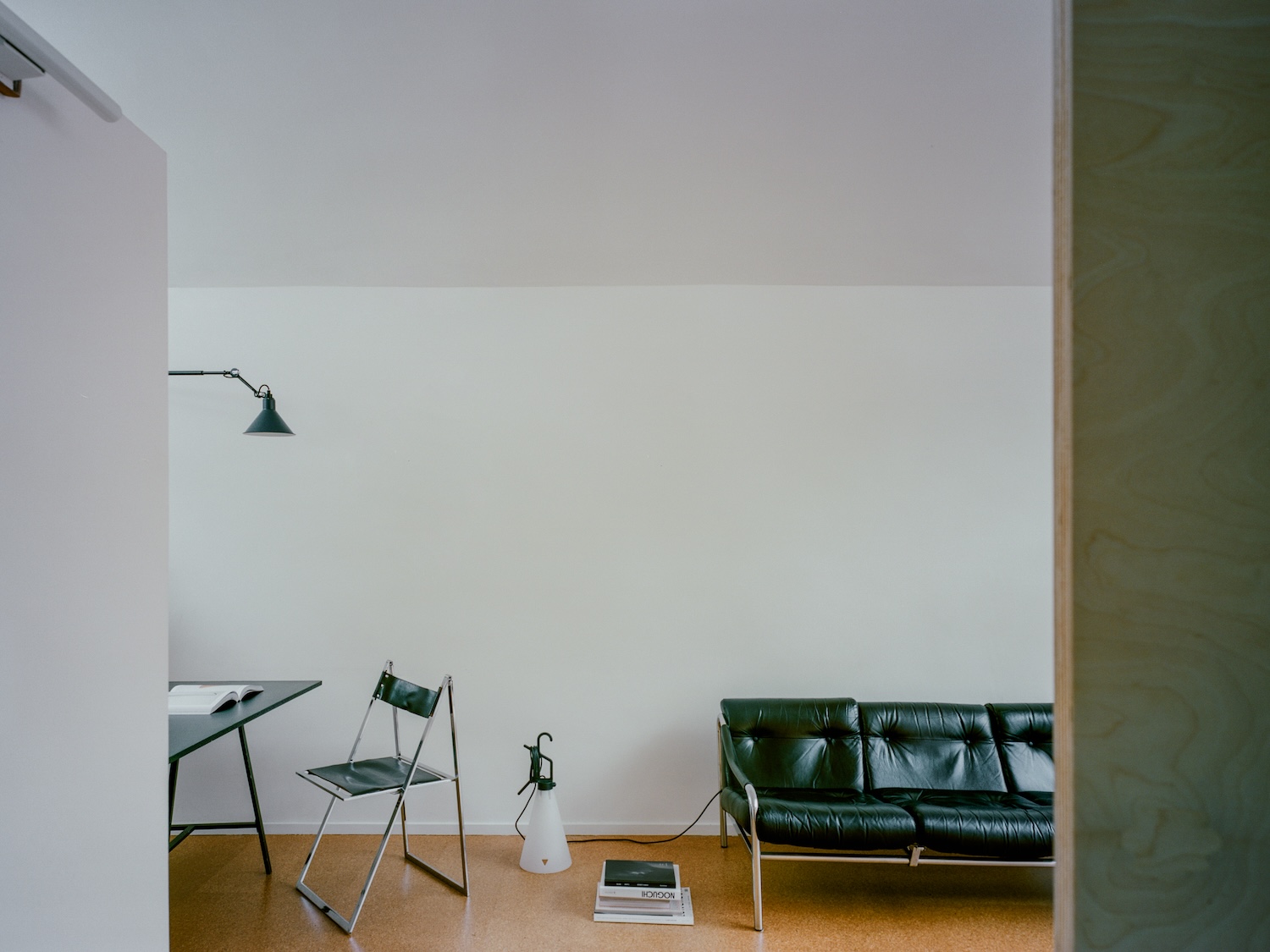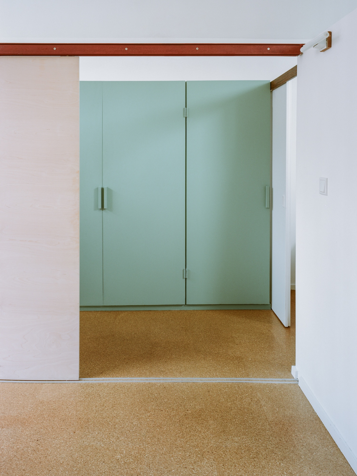 The space greets you first with its cork flooring—an inspired choice that does more than simply cover the ground beneath your feet. Like a warm handshake, it introduces the project’s guiding philosophy: that sustainable materials need not whisper their presence but can instead amplify the inherent dignity of modernist design. The cork, naturally insulating and remarkably durable, creates an acoustic softness that beautifully counterpoints the apartment’s restored concrete vault.