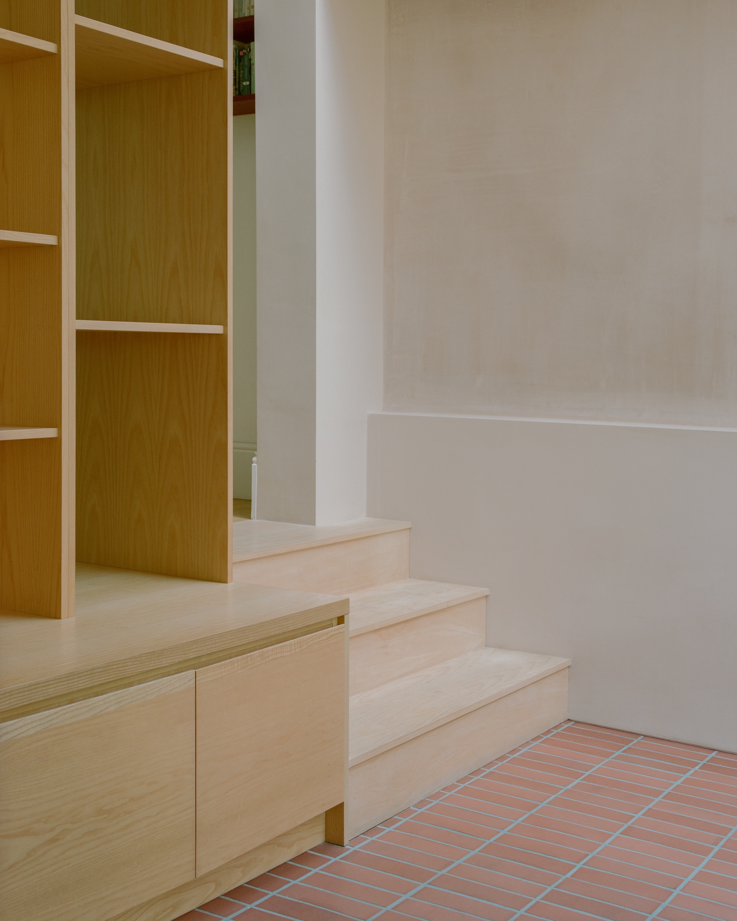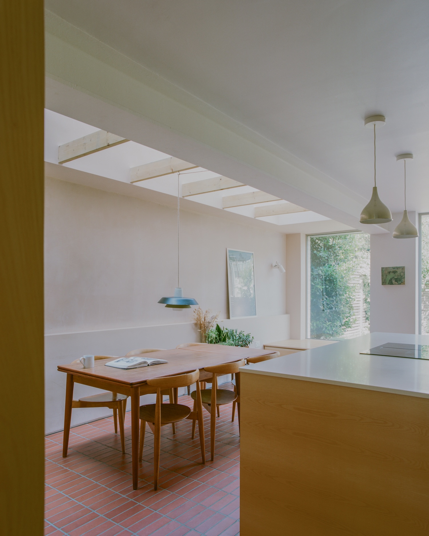 Denmark Hill is a minimalist residence located in London, United Kingdom, designed by TYPE. Tactility, craftsmanship, and a feeling of warmth inspired the construction of a new kitchen and dining space, rooftop extension, and refurbishment of a Victorian terrace for a young family. Materials include hand-moulded bricks in a subtle two-tone layout, clay-fired floor tiles, cork, unpainted plaster, and bespoke ash joinery, with these simple, affordable, and durable materials giving the project distinct character while reflecting the historic construction of the original house.