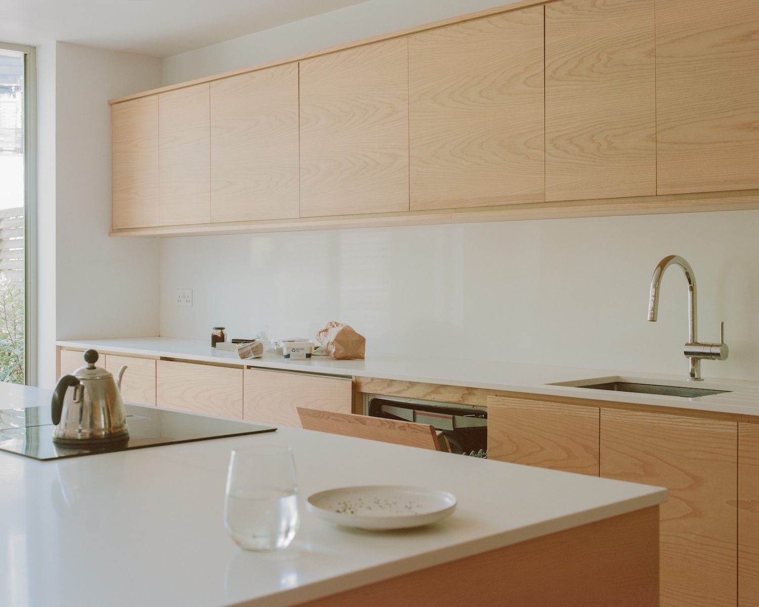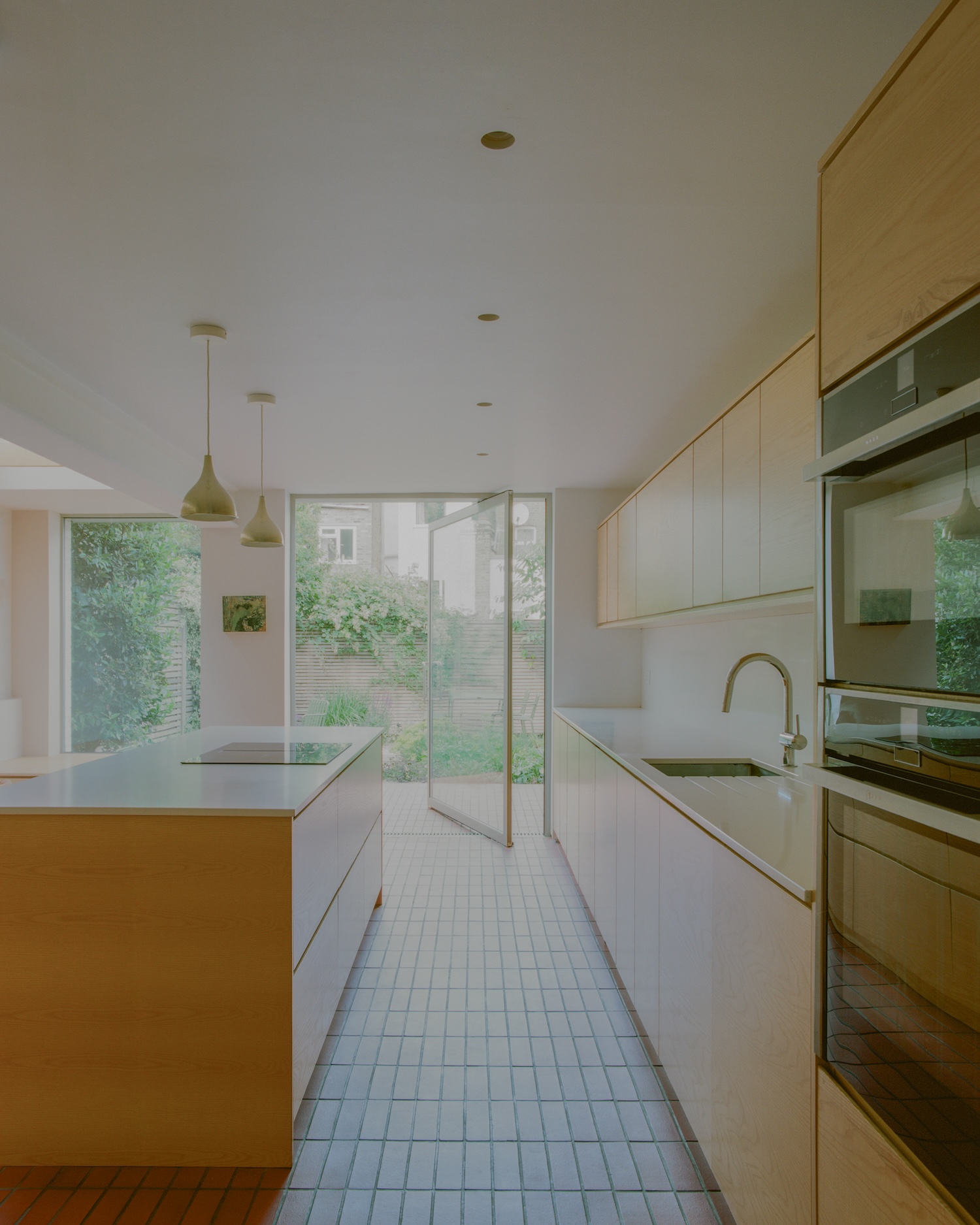 In the ground-floor extension, a frameless corner window, built-in bench seat, and large pivot door create a stronger connection between the house and newly landscaped garden. A large rooflight defines the dining area and allows light deep into the existing floor plan, which is separated by open shelving and a change in floor level. The design transforms the previous kitchen which was small, dark, and offered little room for meals or socializing while the garden was also neglected and overgrown, being cut off from the principle living spaces.