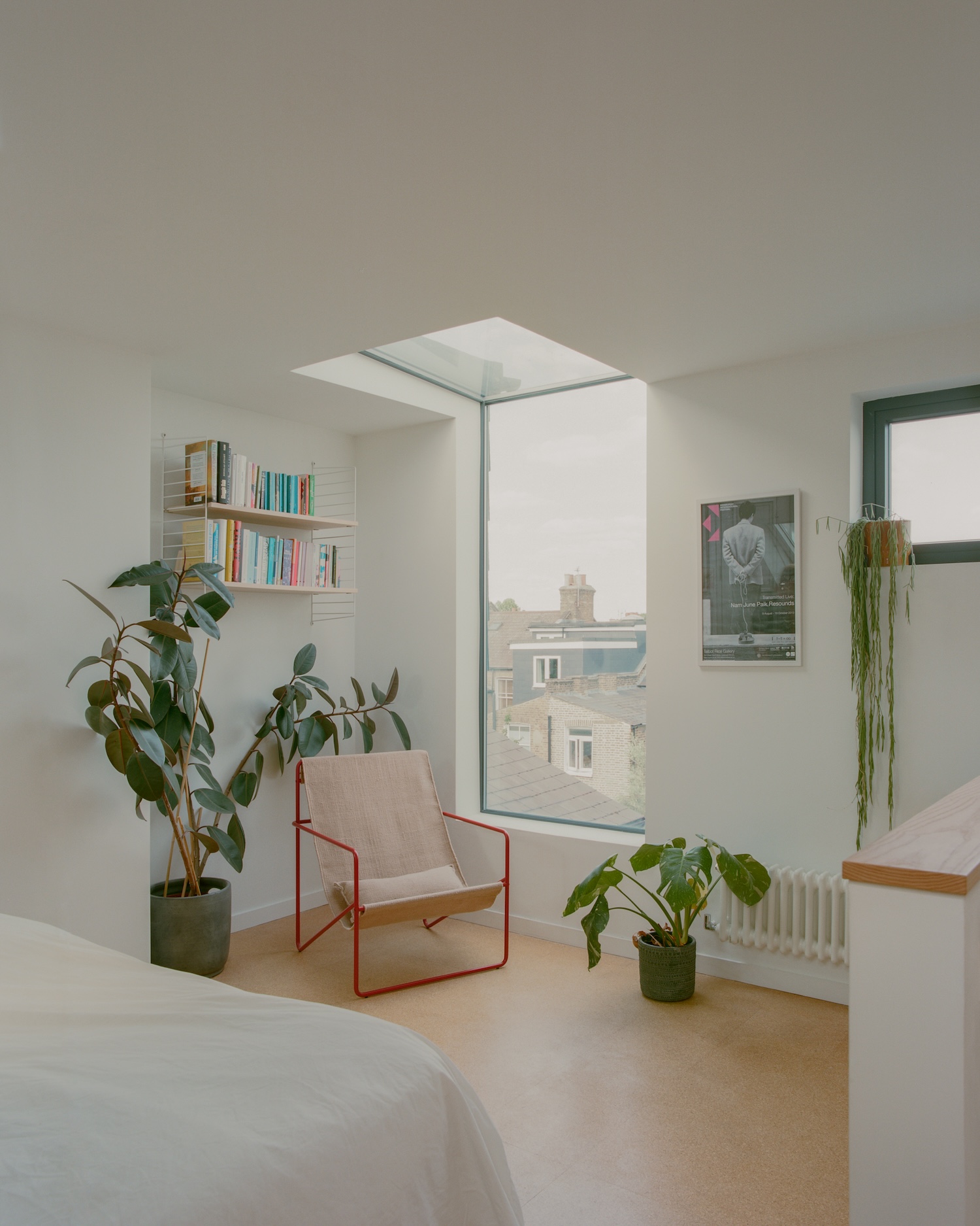 Alongside the ground-floor extension and refurbishment, a loft conversion adds a new bedroom, shared bathroom, and home office. The architects wanted the new second floor to feel spacious, light, and generous, like being on top of the roof and not restricted underneath it like many loft spaces. With this in mind, the bedroom includes a large vertical panoramic window which frames views of the city and sky while a rooflight above the shower floods the bathroom with light giving a feeling of being outside, underneath the sky.