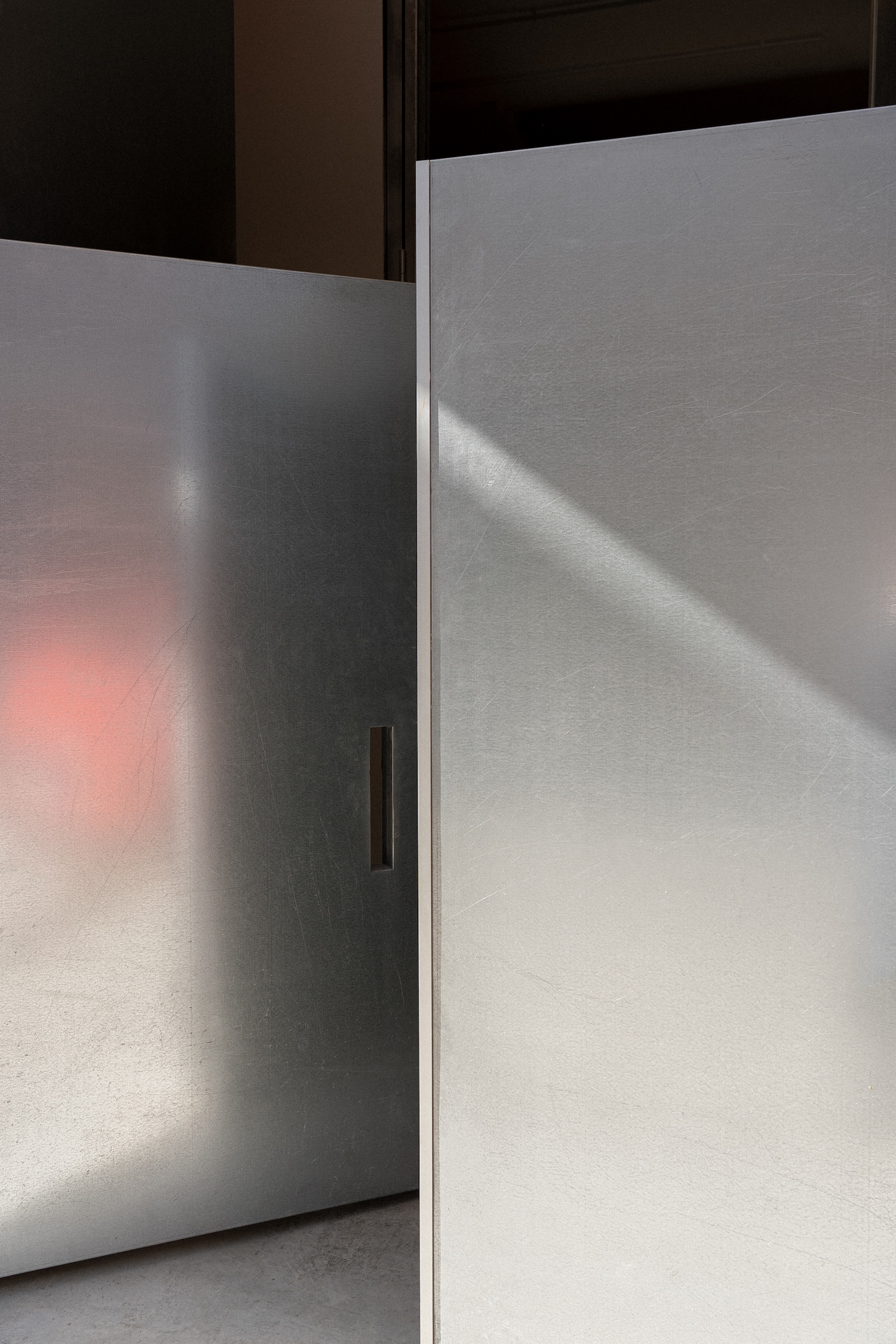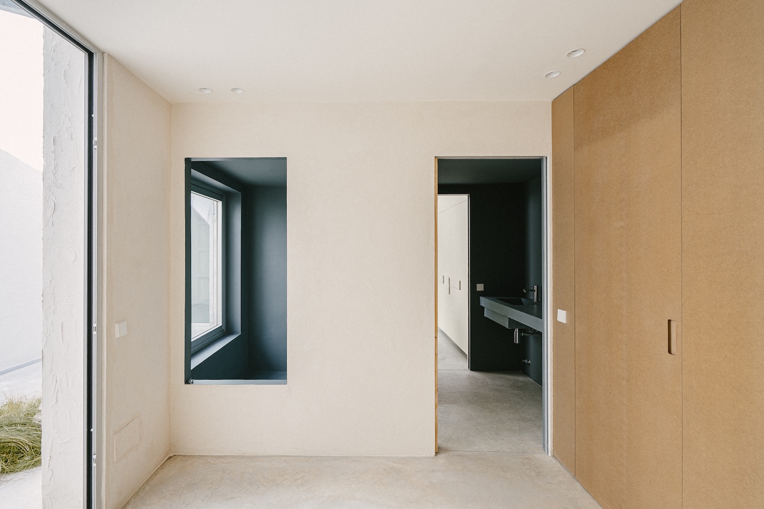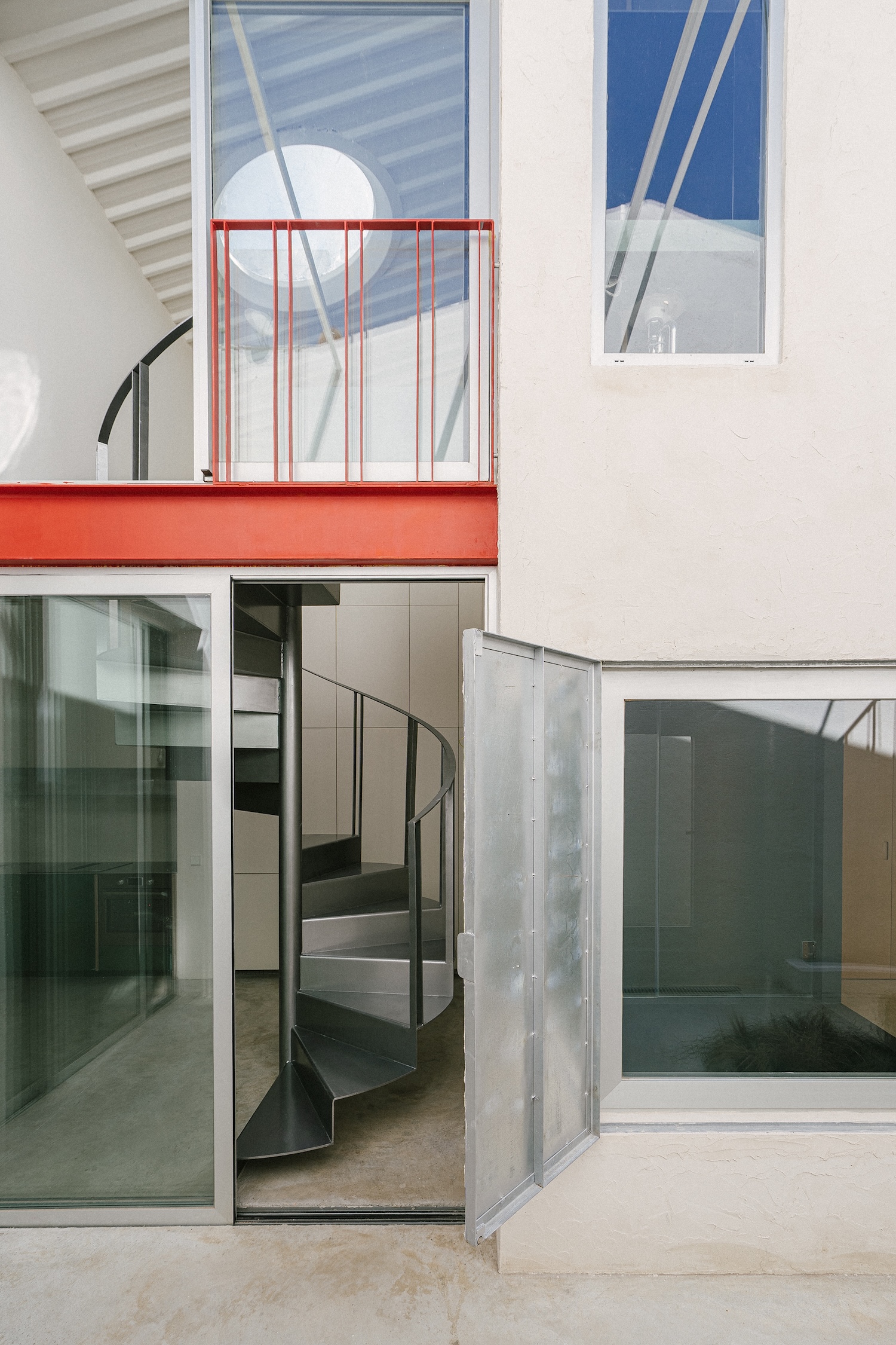 The building’s relationship to the street reveals the project’s most provocative proposition. Rather than the conventional window that frames a view while maintaining separation, ba-rro installs what they term an “ephemeral façade” – a metal door salvaged from the surrounding neighborhood that folds entirely open or closes back on itself. This industrial element, familiar to the street’s existing material vocabulary, becomes a calibrated instrument for regulating exposure. Behind it sits a glass door, creating a layered epidermis through which the dwelling negotiates its visibility. The façade can open completely to urban life or close its lower portion to admit only light, transforming the threshold into an adjustable membrane rather than a fixed barrier.