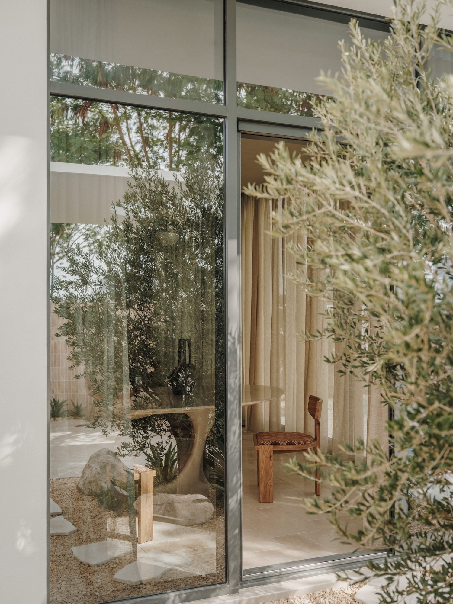 Interior cultural references appear through subtle material choices rather than obvious decoration. Warm beige wall finishes and ceilings evoke sunlight on sand, responding to regional color preferences. Rough natural stone walls suggest desert rock formations, bringing indigenous textural character that anchors the space in local landscape. The combination of light brown rough stone and beige limestone creates a gentle foundation that feels suffused with desert sunlight warmth.