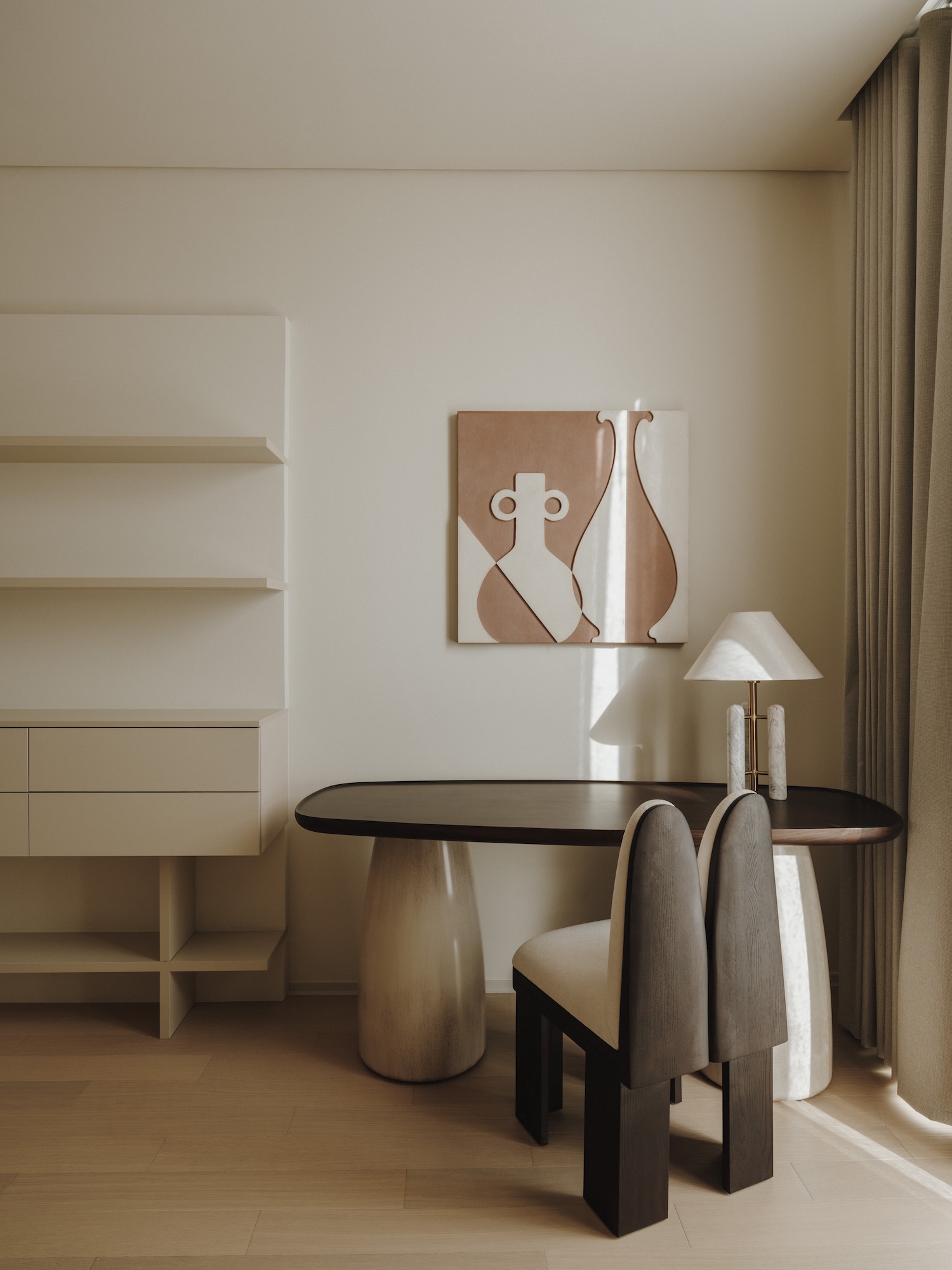 The renovation strategy focuses on targeted modifications combined with careful furnishing rather than complete reconstruction. This approach preserves the existing structural framework while introducing warmth and character to address the quality and aesthetic shortcomings typical of overseas standardized developer finishes. By working within the existing shell, the design balances efficiency and cost control with personalized customization that reflects the owners’ lifestyle and taste.