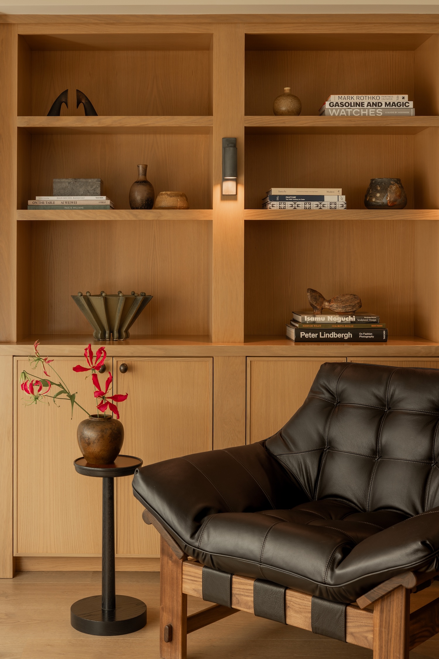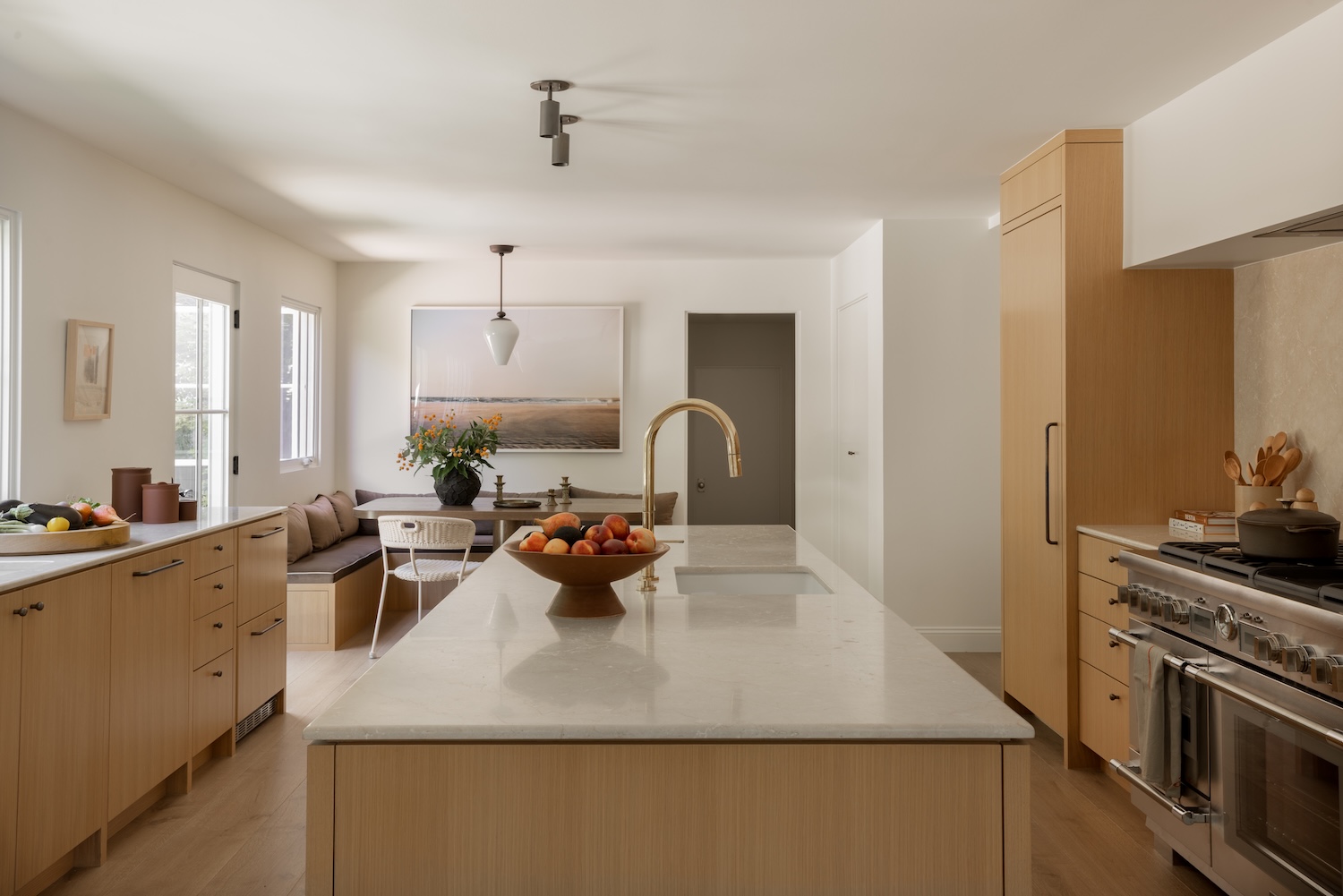 Removing an interior balcony opened sightlines between levels, while raised ceilings and floor-to-ceiling windows dissolve the barriers between interior rooms and the surrounding landscape. These moves echo the spatial strategies of midcentury California modernism, where the home becomes a transparent membrane rather than an enclosure. The expanded glazing does not simply admit more daylight – it establishes a reciprocal relationship between inside and outside, allowing the property’s natural features to inform the experience of inhabiting the rooms.