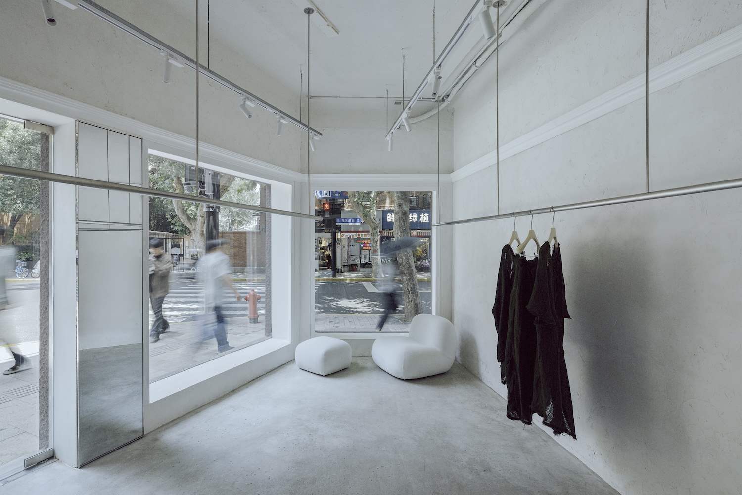The site itself is an asset. Positioned at a high-traffic intersection along South Maoming Road, the corner location offers three full-height glass facades that dissolve the boundary between sidewalk and interior. Rather than competing for attention with oversized branding, the storefront carries only a handwritten note on the glass – erasable, impermanent, closer to a studio sketch than a corporate identity. It is a gesture that recalls the provisional signage of early Comme des Garçons guerrilla shops, where absence of branding became the brand signal itself. Here, the clothing does the communicating.
