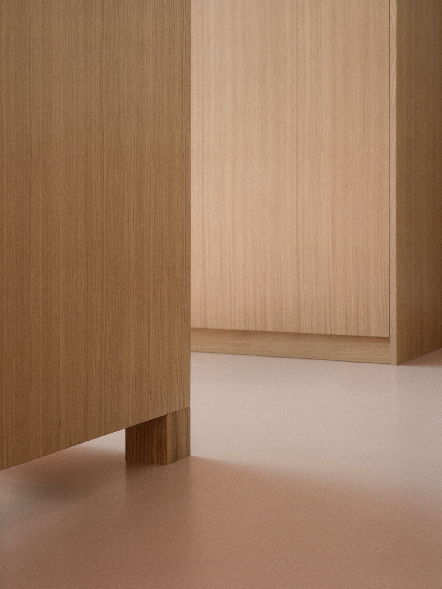 Material choices establish thermal and tonal counterpoints. Oak cabinetry and exposed timber beams provide haptic warmth and visual continuity with the surrounding meadows, their grain patterns introducing organic irregularity. Against this, pale-pink biopolymer resin flooring introduces an unexpected chromatic note – neither purely natural nor overtly synthetic, the material occupies ambiguous territory. Its slight sheen catches changing daylight, creating subtle tonal shifts across the open plan while offering durability suited to family life.