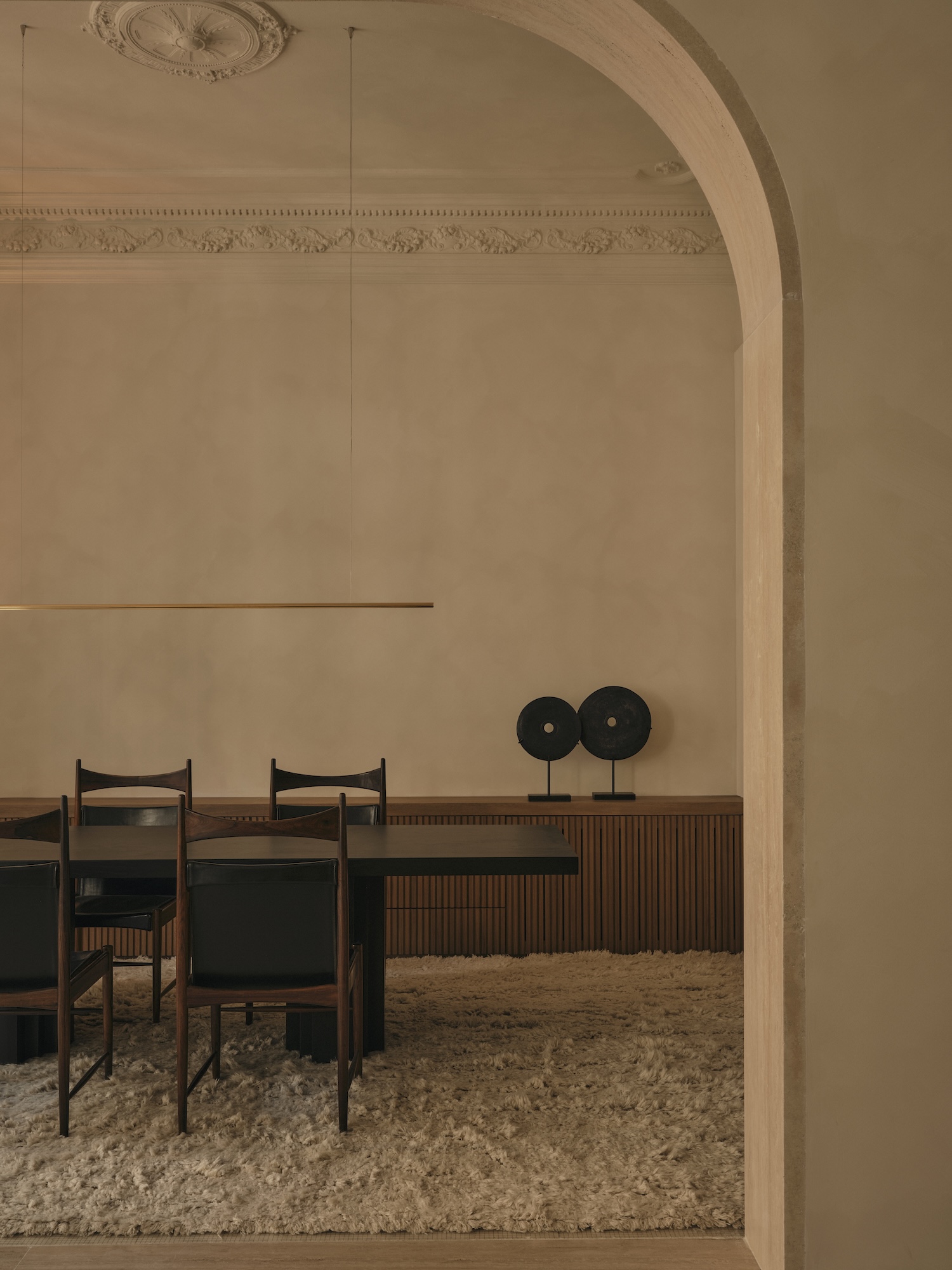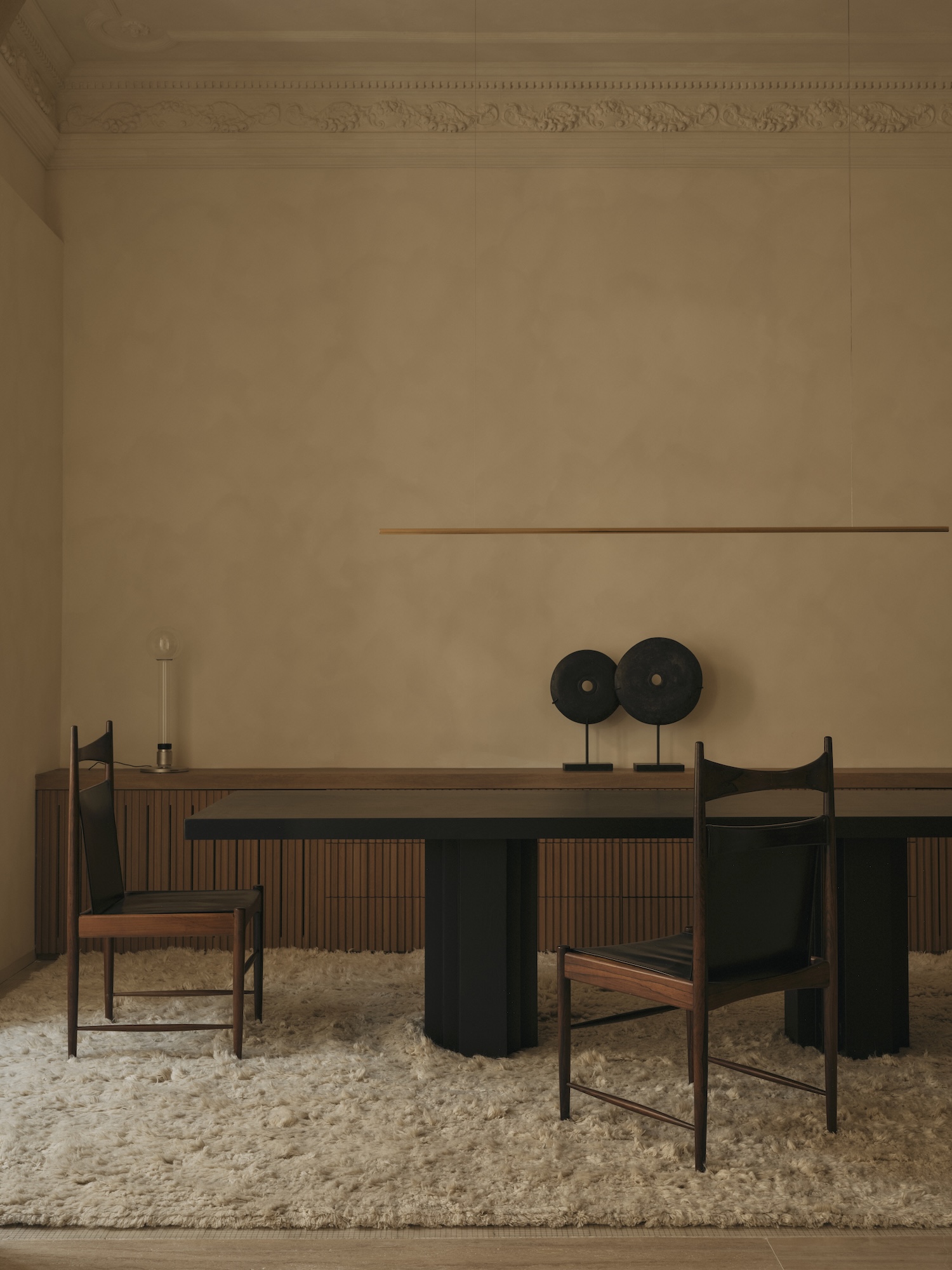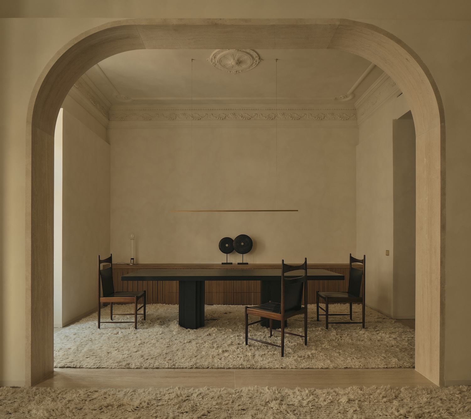 Joining this conversation are bespoke pieces conceived as natural extension of the architecture where material, form, and function merge in harmony. A collection that does not seek to dominate but to accompany with subtlety and balance, demonstrating how custom furniture can establish spatial relationships with both historic architectural elements and curated vintage pieces creating layered temporal narrative where multiple design periods coordinate through shared material and tonal sensibilities.
