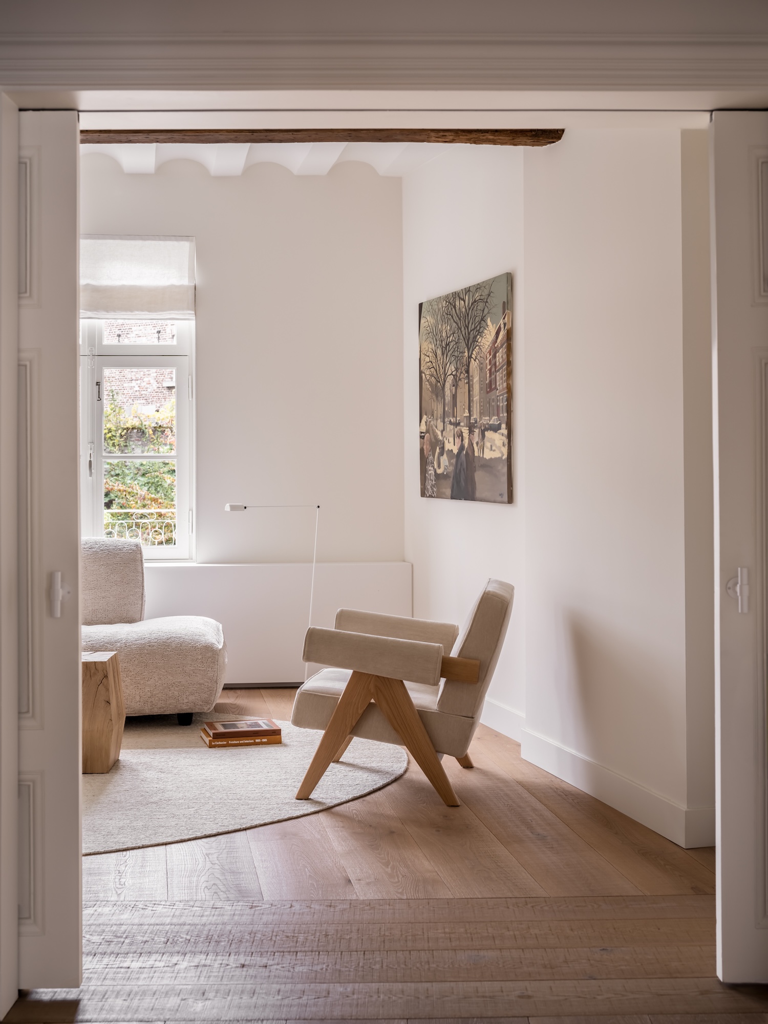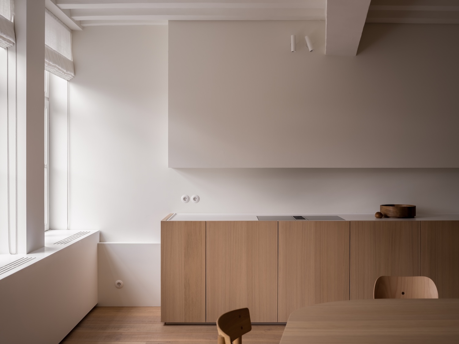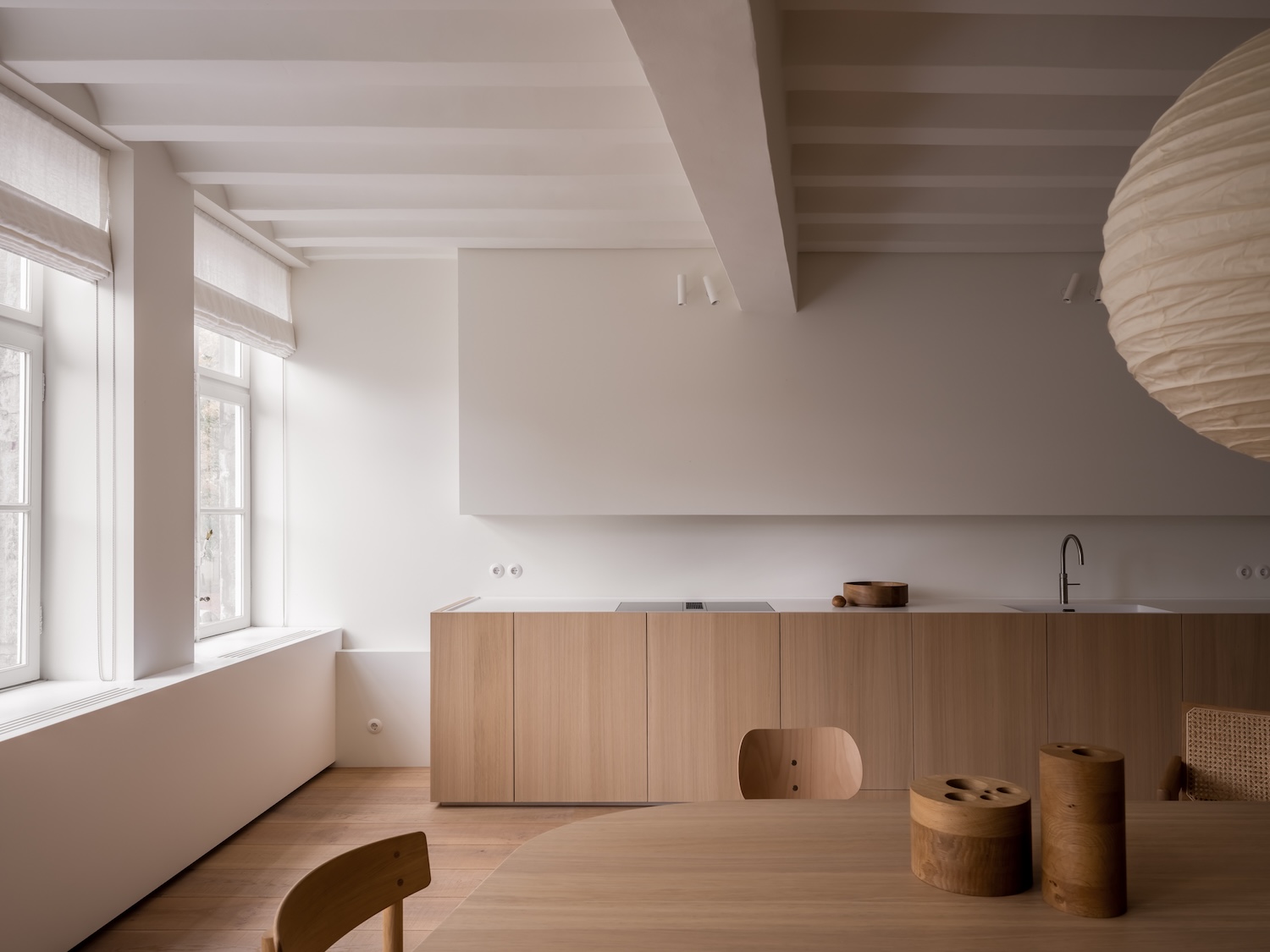 Throughout the residence, a restrained material palette of natural oak flooring, white-painted walls and ceilings, and light wood cabinetry creates calm neutral backdrop allowing architectural details and curated furnishings to establish spatial character. The soft cream and beige tones prevent stark contrast with the darker aged ceiling beams, establishing harmonious relationship between historic and contemporary elements. This chromatic restraint reflects Niels Maier’s clear focus on delivering quality and fresh concepts through material selection rather than decorative elaboration.