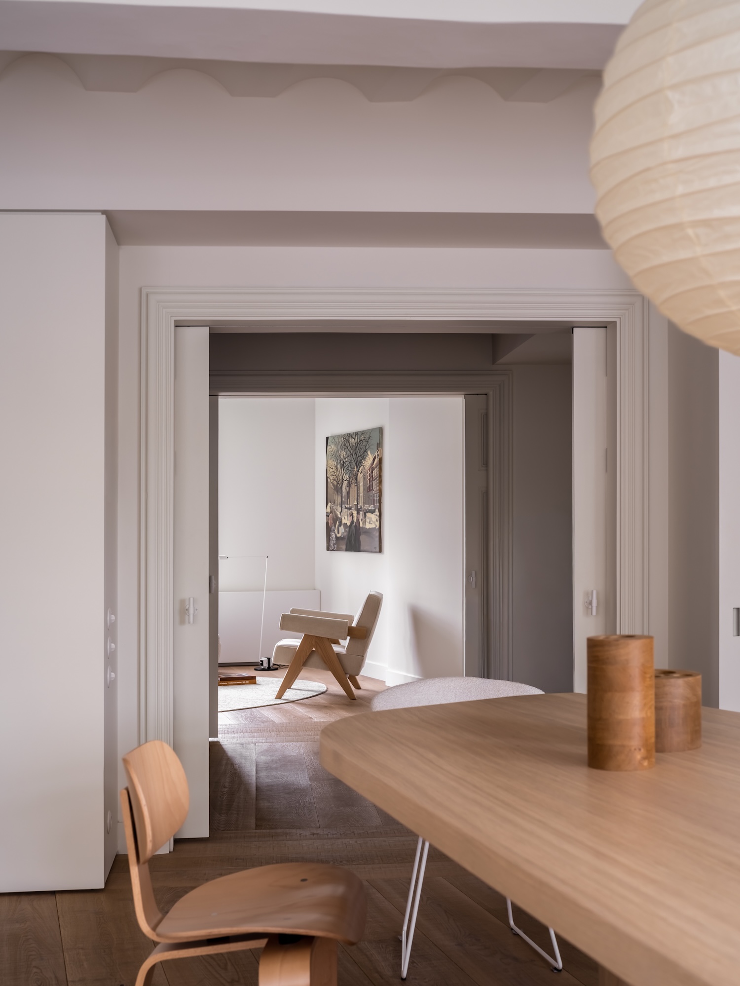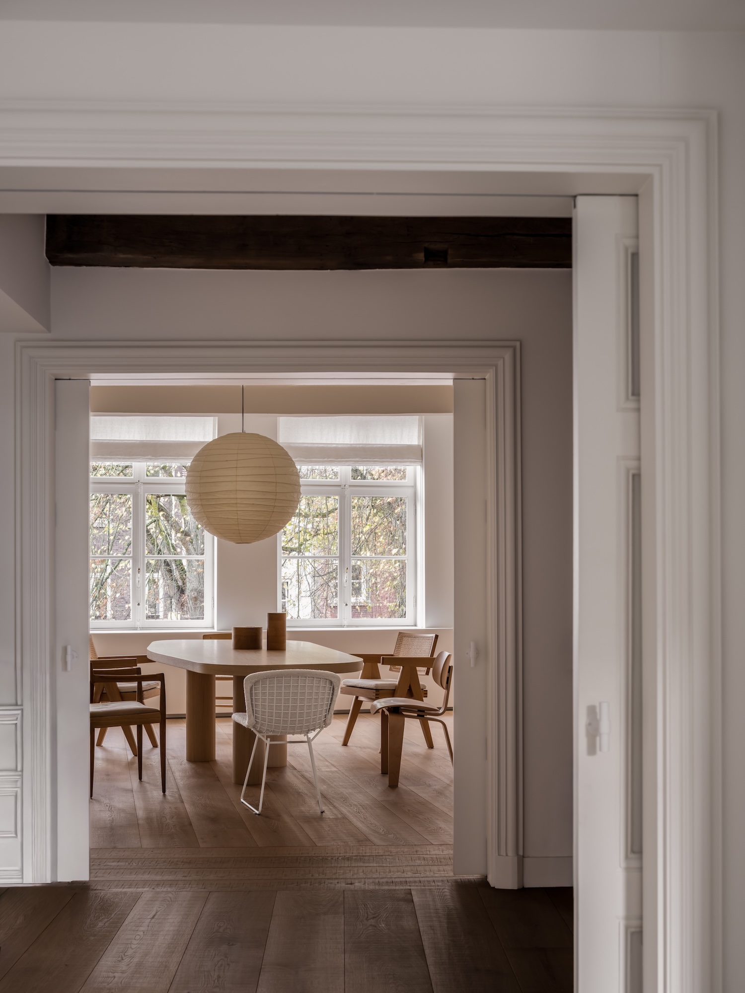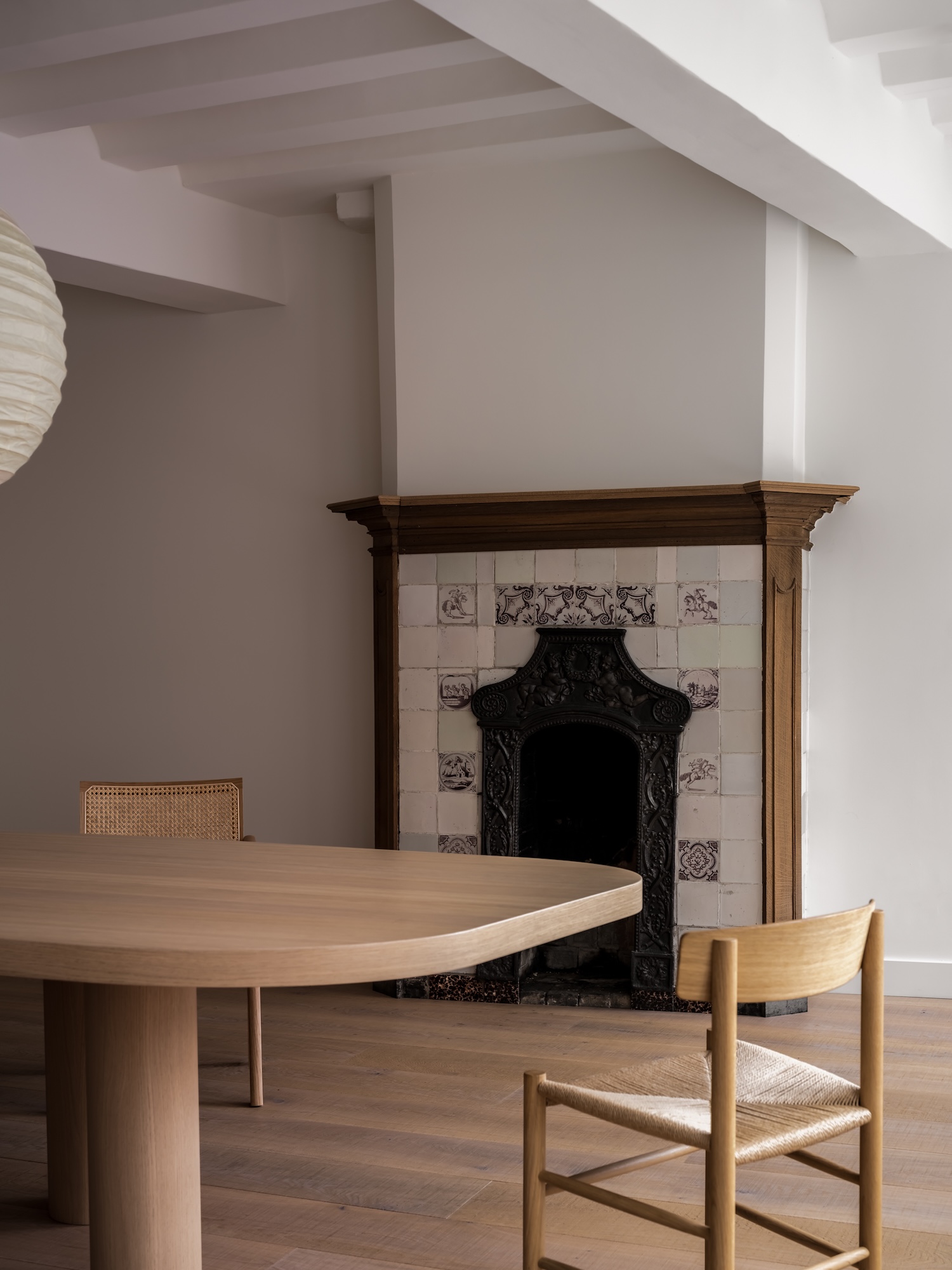 Throughout the residence, a restrained material palette of natural oak flooring, white-painted walls and ceilings, and light wood cabinetry creates calm neutral backdrop allowing architectural details and curated furnishings to establish spatial character. The soft cream and beige tones prevent stark contrast with the darker aged ceiling beams, establishing harmonious relationship between historic and contemporary elements. This chromatic restraint reflects Niels Maier’s clear focus on delivering quality and fresh concepts through material selection rather than decorative elaboration.