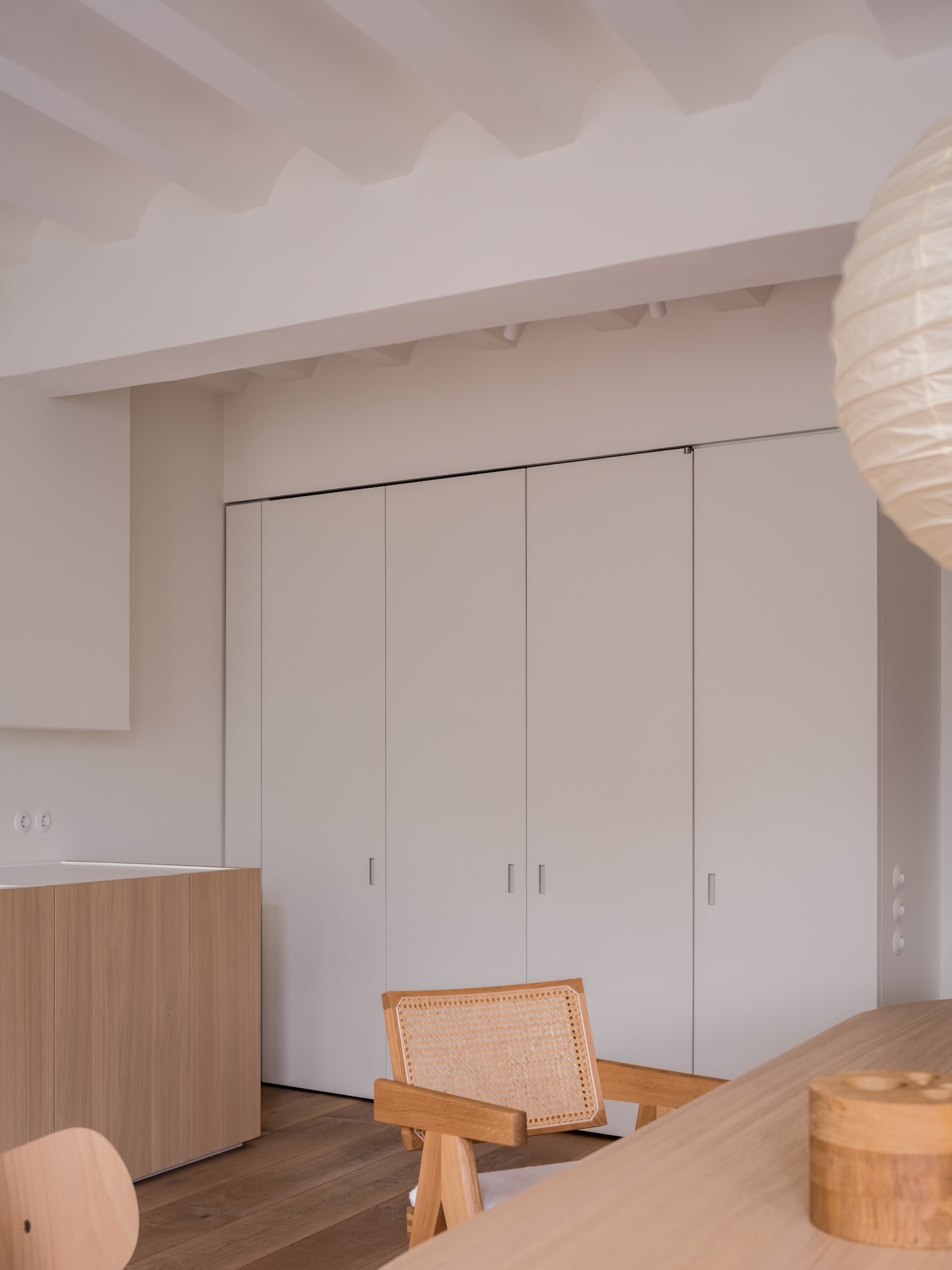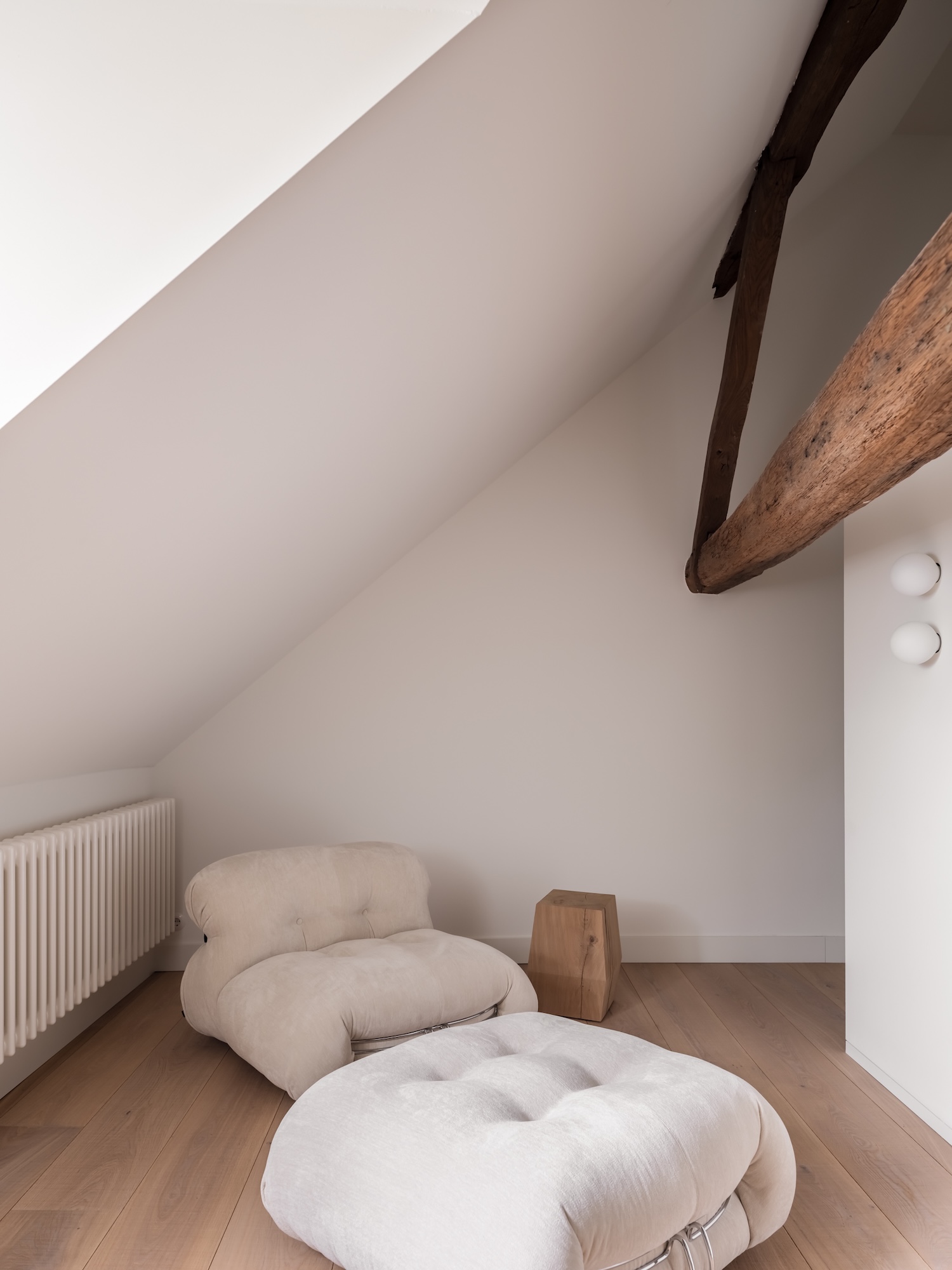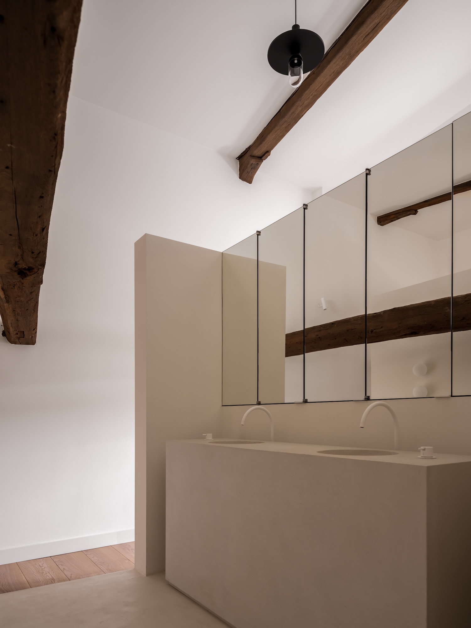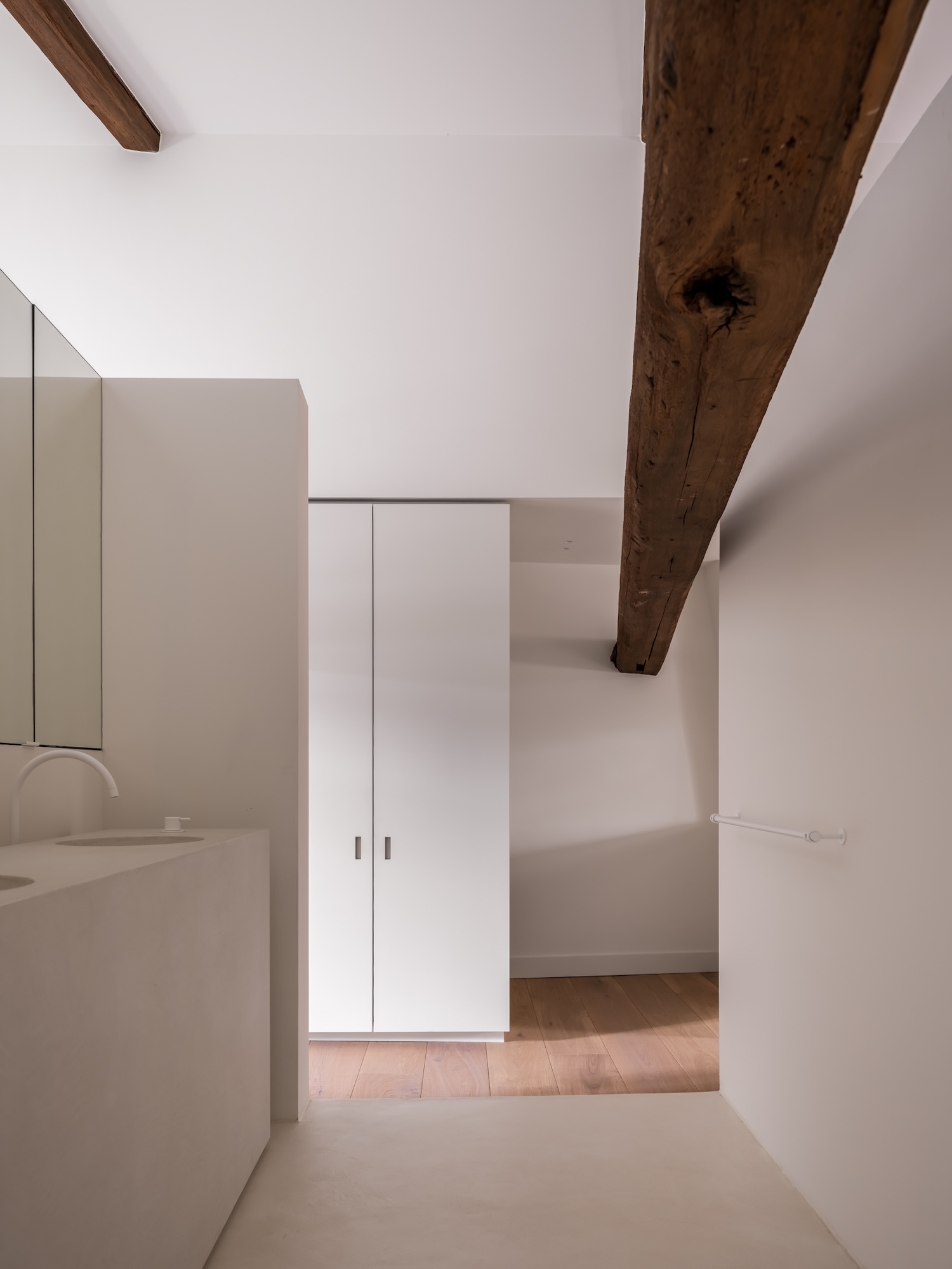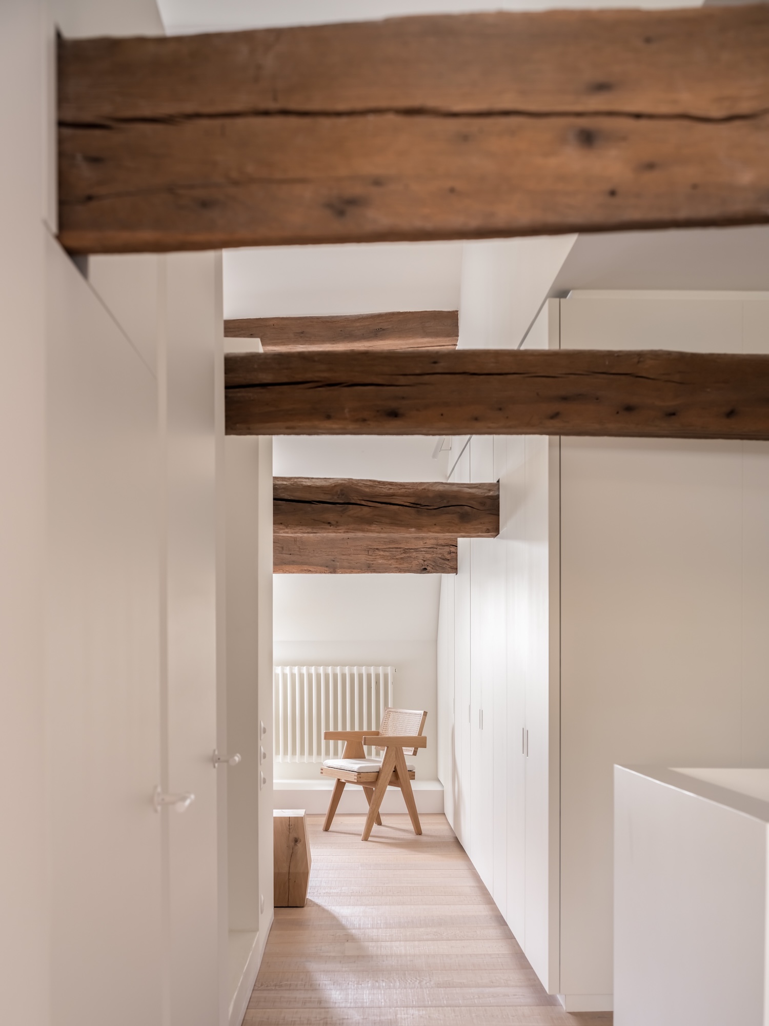 The project reveals a carefully restored historic residence where exposed wooden ceiling beams contrast with refined contemporary interventions. The original beams, displaying natural aging and character through visible cracks and weathering, remain as prominent architectural elements establishing connection to the building’s history. This preservation strategy demonstrates how renovation can celebrate rather than conceal structural elements that typically require hiding in contemporary construction, treating historic building fabric as design asset rather than constraint requiring correction.
