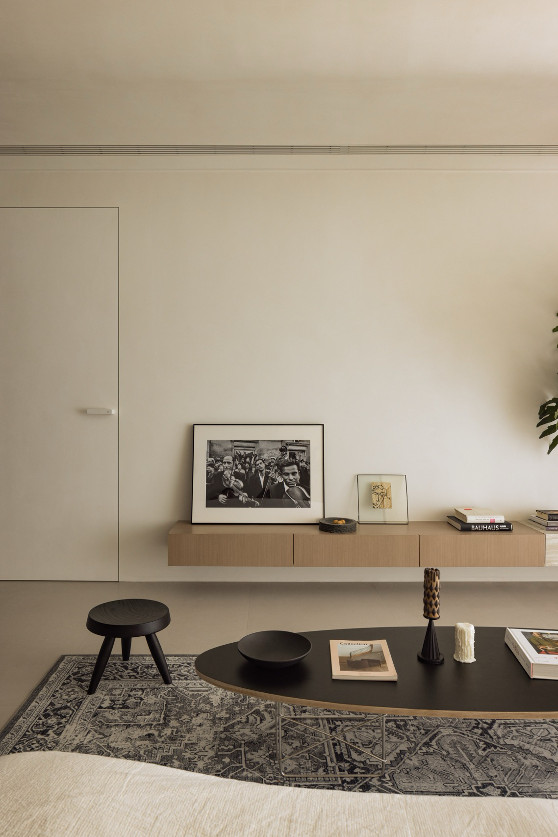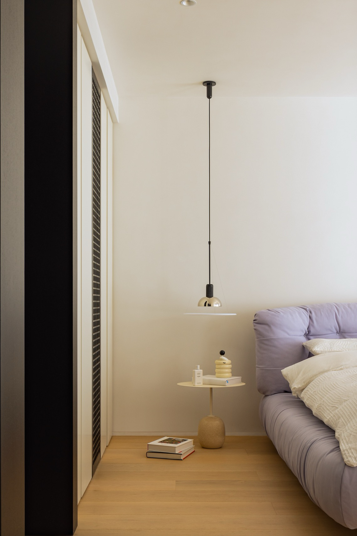 The designer’s material palette extends this logic of authentic expression throughout the residence. “I have always favored those real, natural materials – wood, stone, plaster – they are allowed to show their own texture and can age gracefully with time,” reflects the architect. This philosophy manifests in the repetition of travertine and wood veneer across both public and private domains, creating what she describes as her preference for “contrast” – the tension between rough and fine, matte and gloss, new and old that brings layers and subtle drama to space.