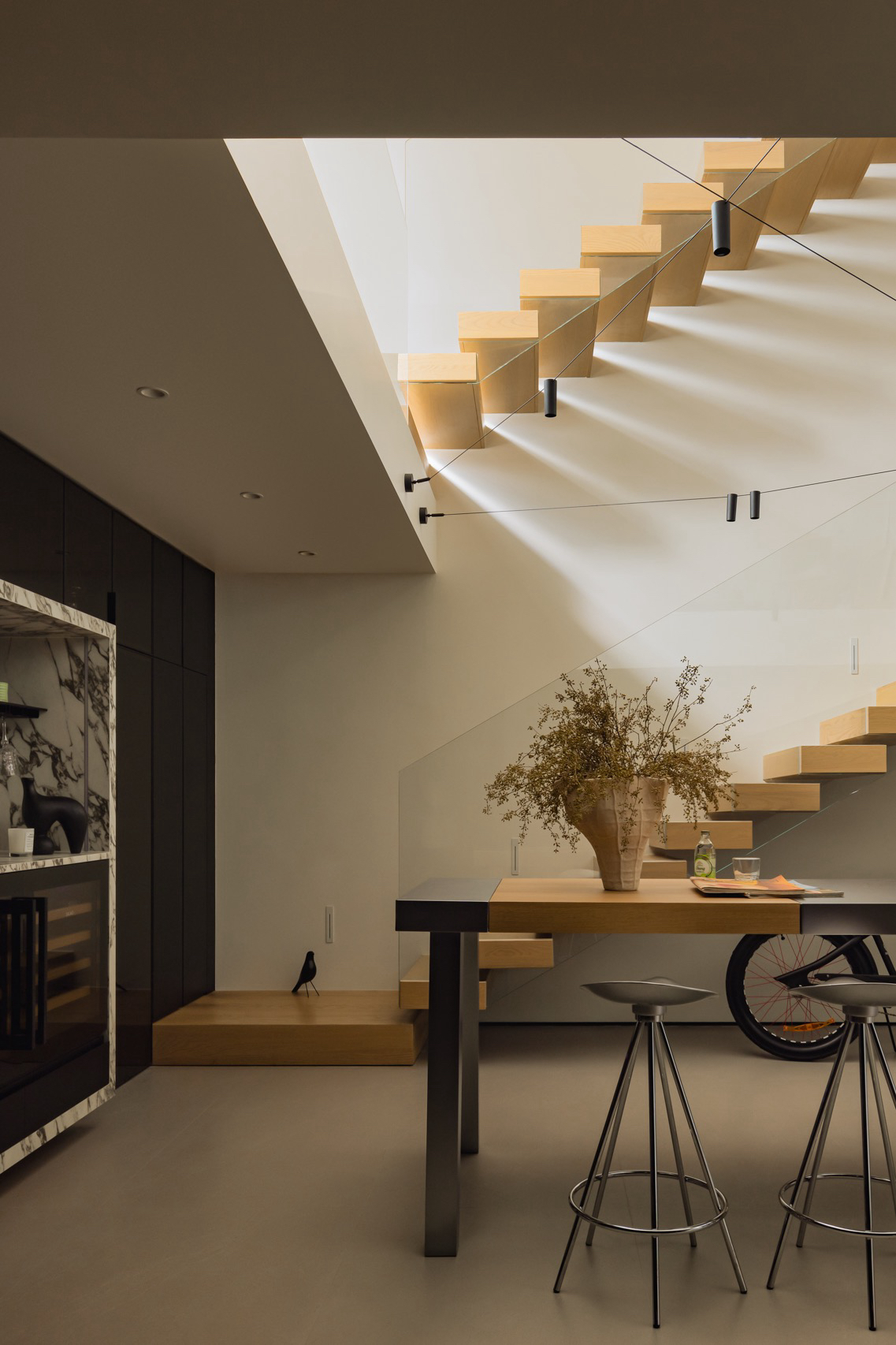 In the dining area, convention gives way to invention. The fusion of dining table and bar counter represents more than functional efficiency – it embodies a fundamental shift in how we understand domestic ritual. This hybrid form speaks to contemporary life’s blurred boundaries, where formal dining yields to casual gathering, where the kitchen island becomes the new hearth around which family life revolves. The structural logic of this intervention reveals itself gradually: what appears as bold gesture proves to be careful response to the inhabitants’ actual patterns of use.