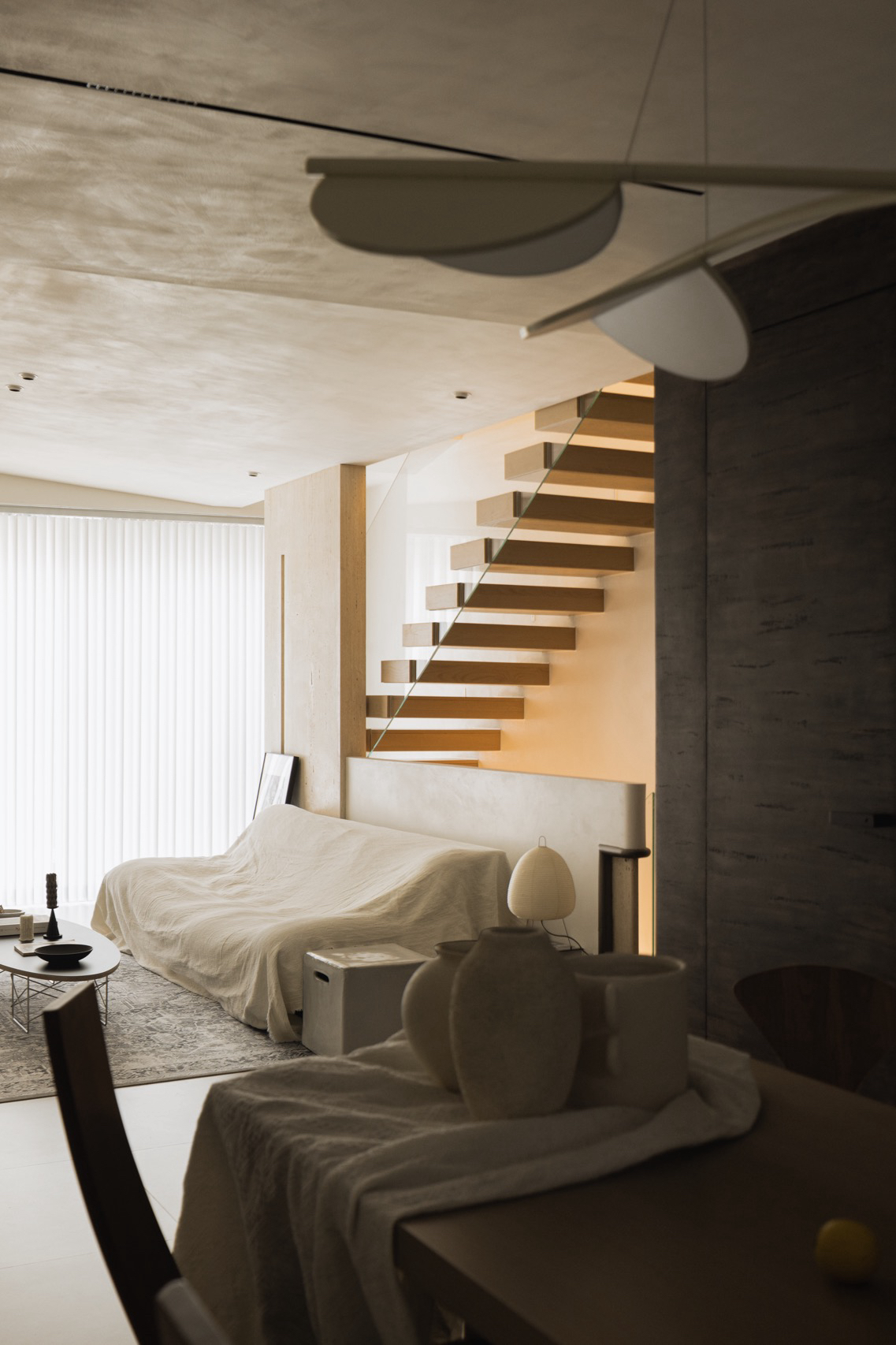 Habitat Atelier is a minimalist townhouse located in Hangzhou, China, designed by Jijia Space. The project stands as testament to the power of material restraint, where travertine walls and custom millwork speak in hushed tones rather than declarative statements. This is not the polished marble of corporate lobbies, but stone that wears its geological history openly. The natural pores and striations that mark its surface echo the weathered faces of ancient Roman monuments, yet here they serve a different purpose entirely. Against these textured planes, the designer has orchestrated a careful dance between rough and refined, allowing the stone’s inherent character to anchor spaces that might otherwise drift toward the precious or overwrought.