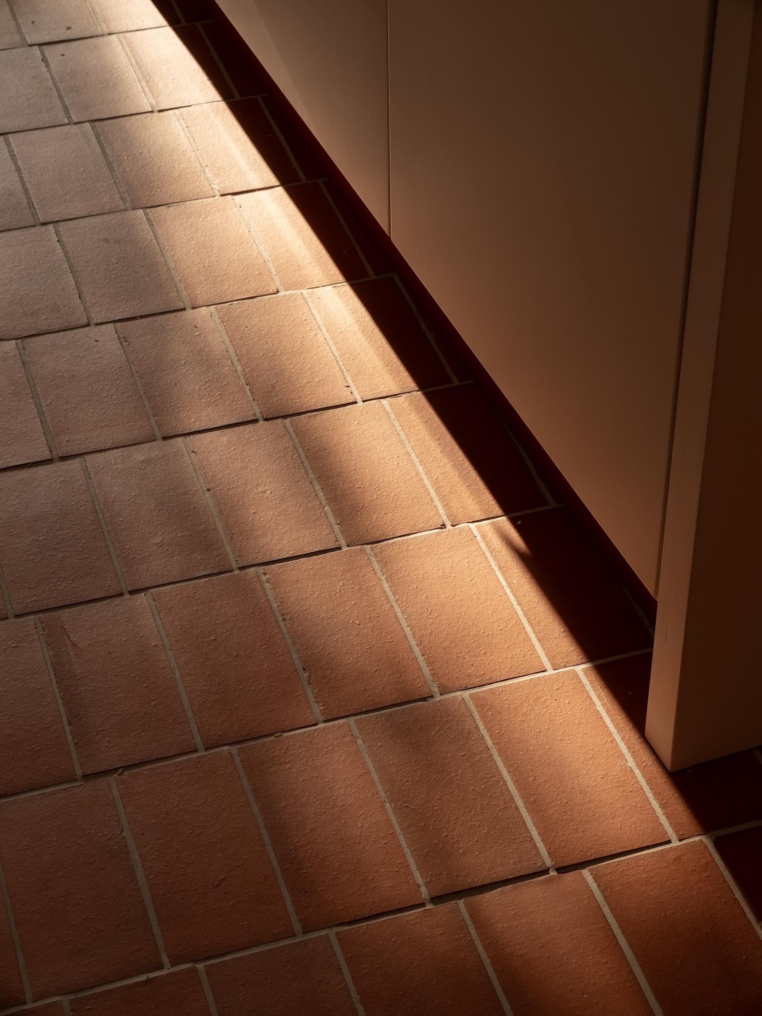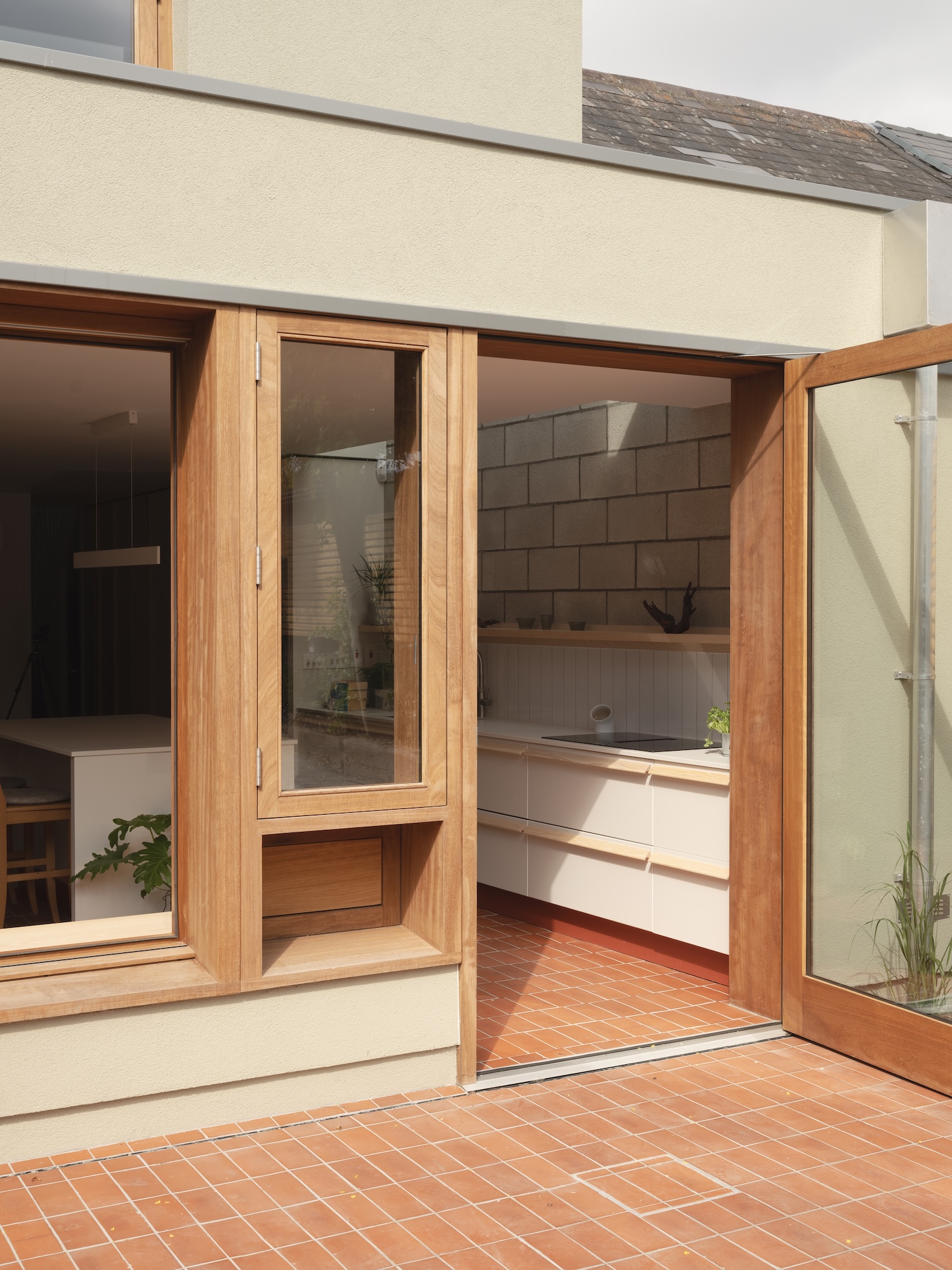While front house sits perpendicular to square, garden kinks to irregular angle at back with floor tiles shuffling playfully out of grid, their pattern gently nudged by cranked garden walls. This shift on plan subtly realigns kitchen and built-in furniture creating spatial quirks inviting display and personal touches, demonstrating how site irregularities can become design opportunities rather than problems requiring correction. The tile pattern responding to garden wall angles creates visual logic connecting interior floor treatments to exterior spatial conditions.