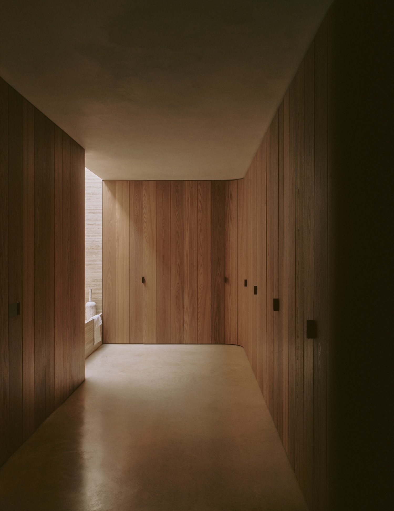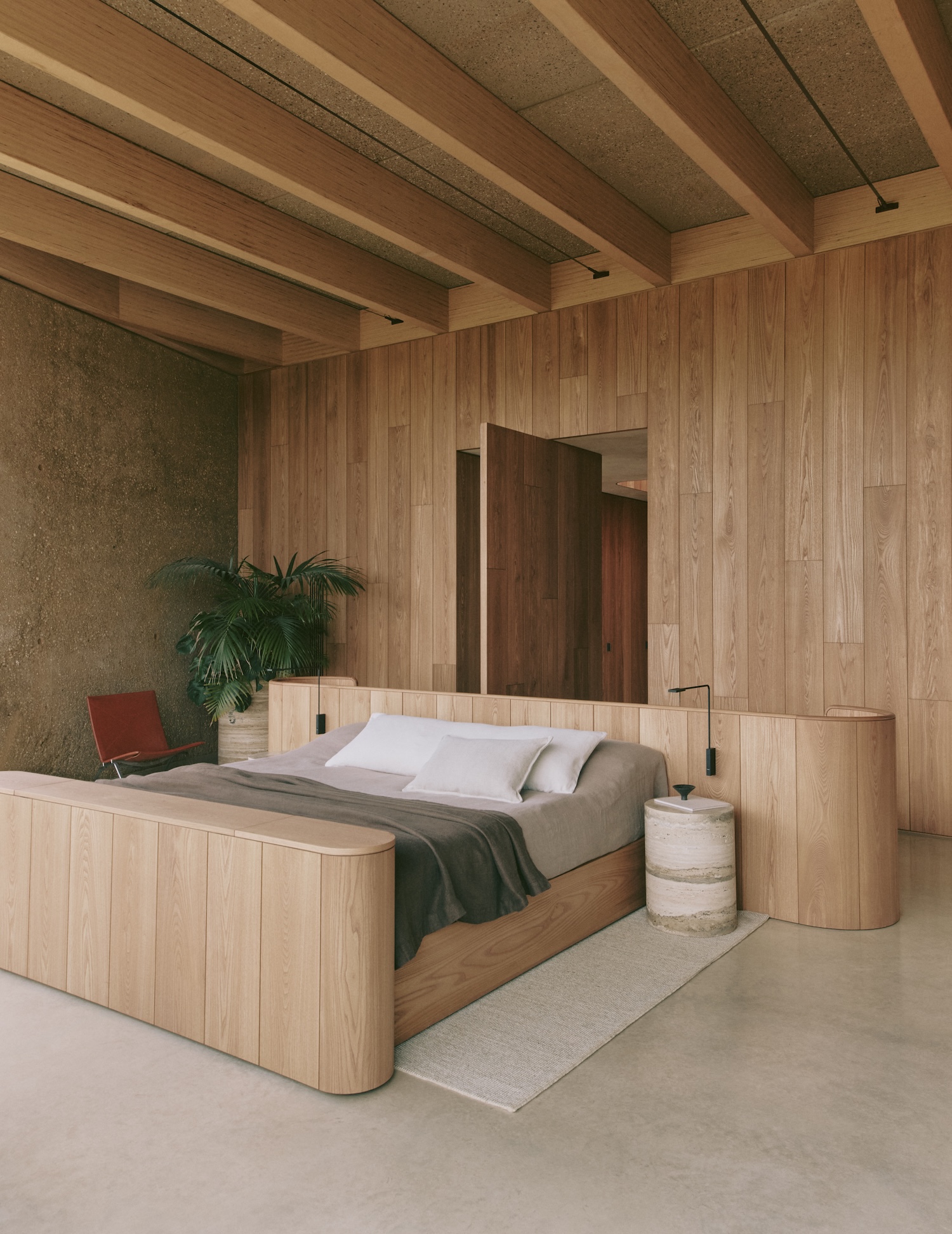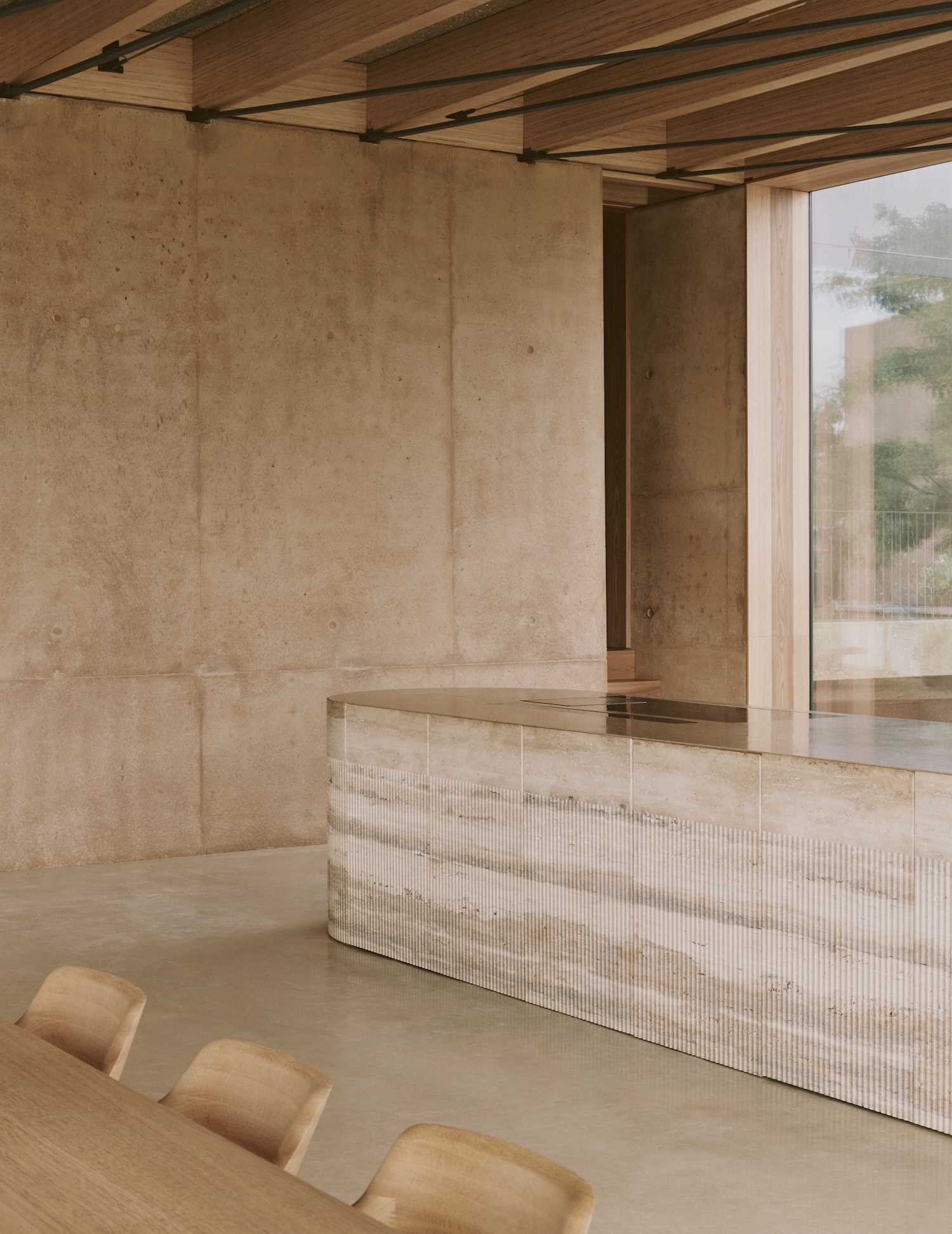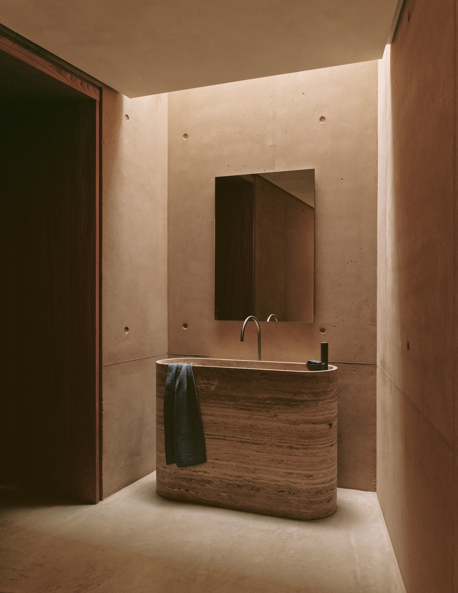Holt and McLaren Excell spent time at a quarry outside Rome hand-selecting six massive Noce travertine blocks, each mapped in three dimensions to become specific interior elements. The kitchen island, bath pedestals, and other substantial pieces were carved from single blocks, ensuring the stone’s natural strata and color variations remained legible rather than fragmented across multiple sources. McLaren Excell worked with European red elm and the Rome-sourced travertine cut across the grain to reveal its internal structure, creating surfaces that register light and shadow with the same directness found in the concrete walls.