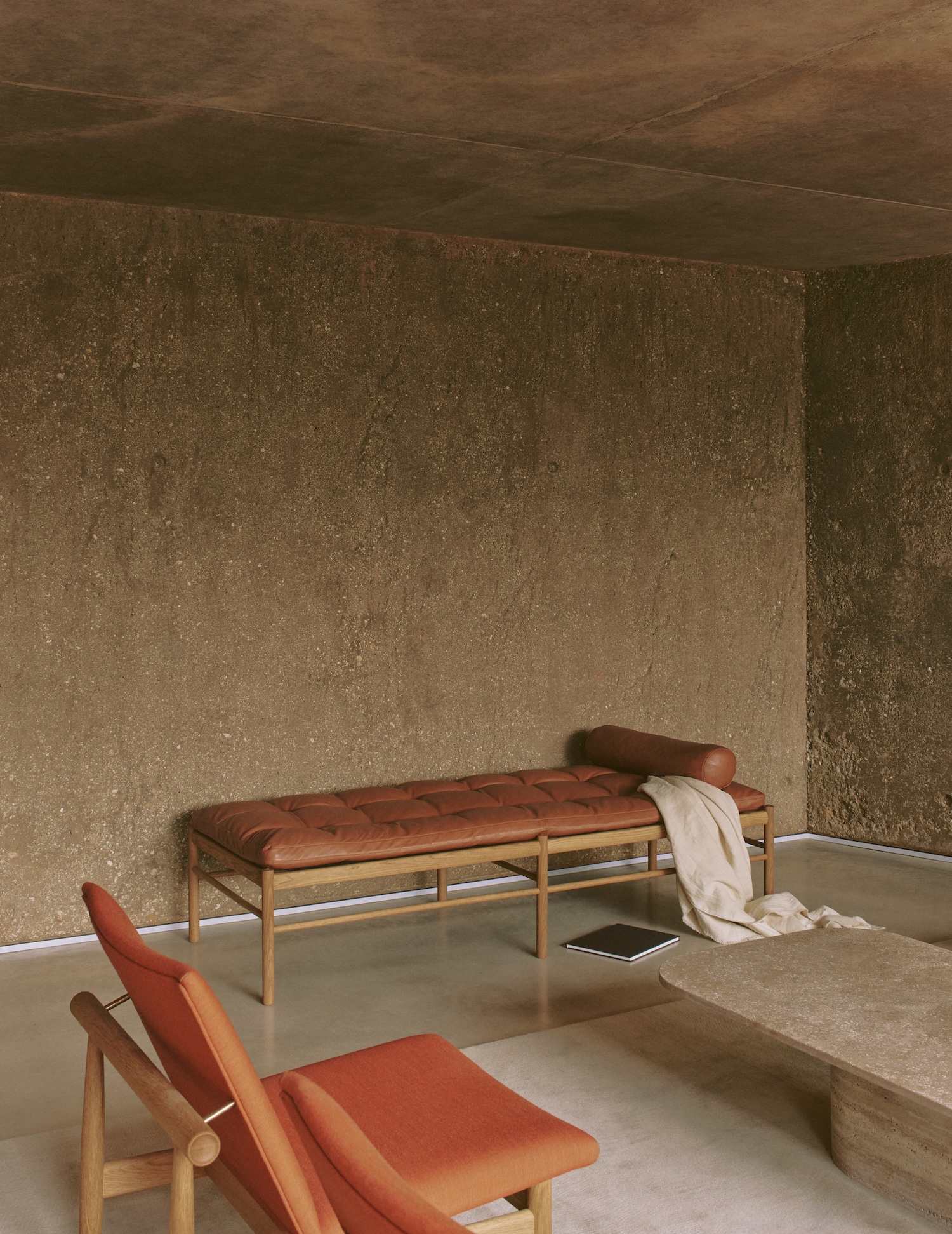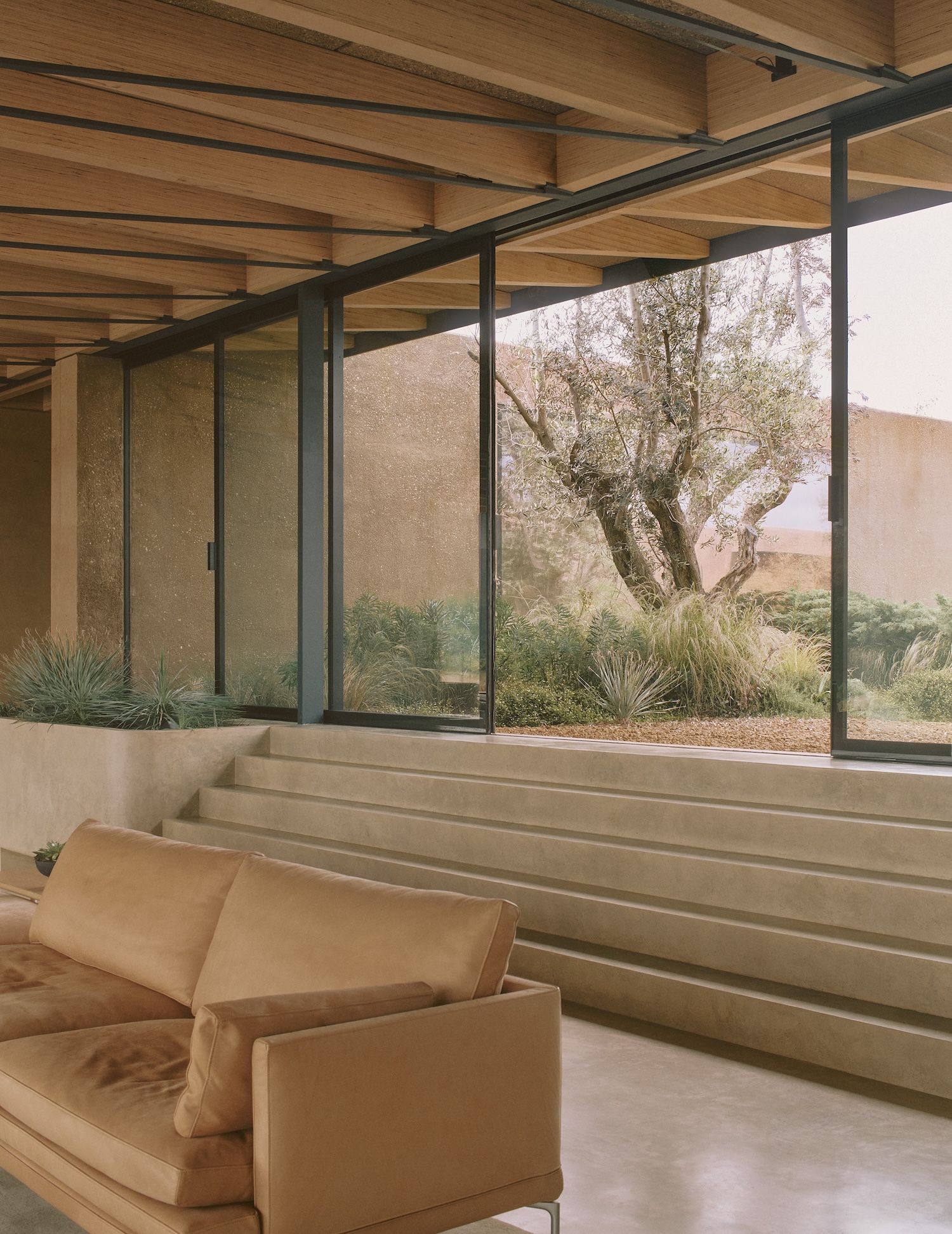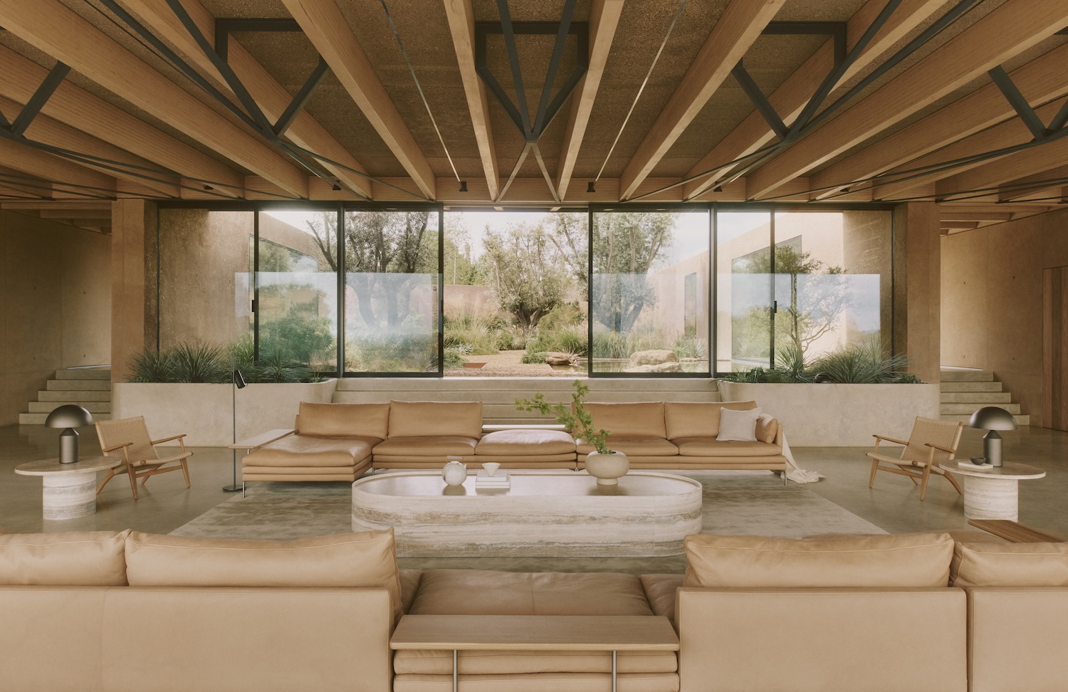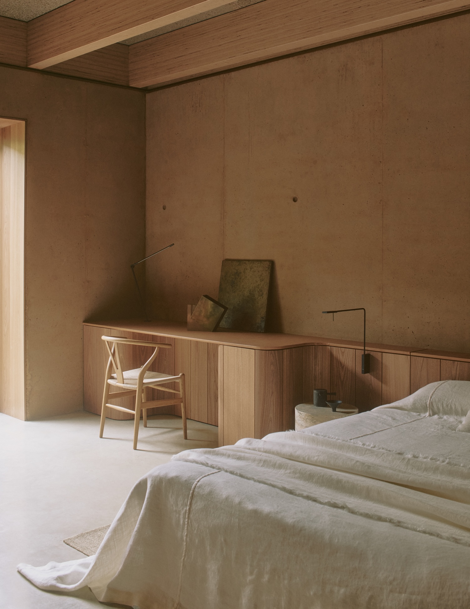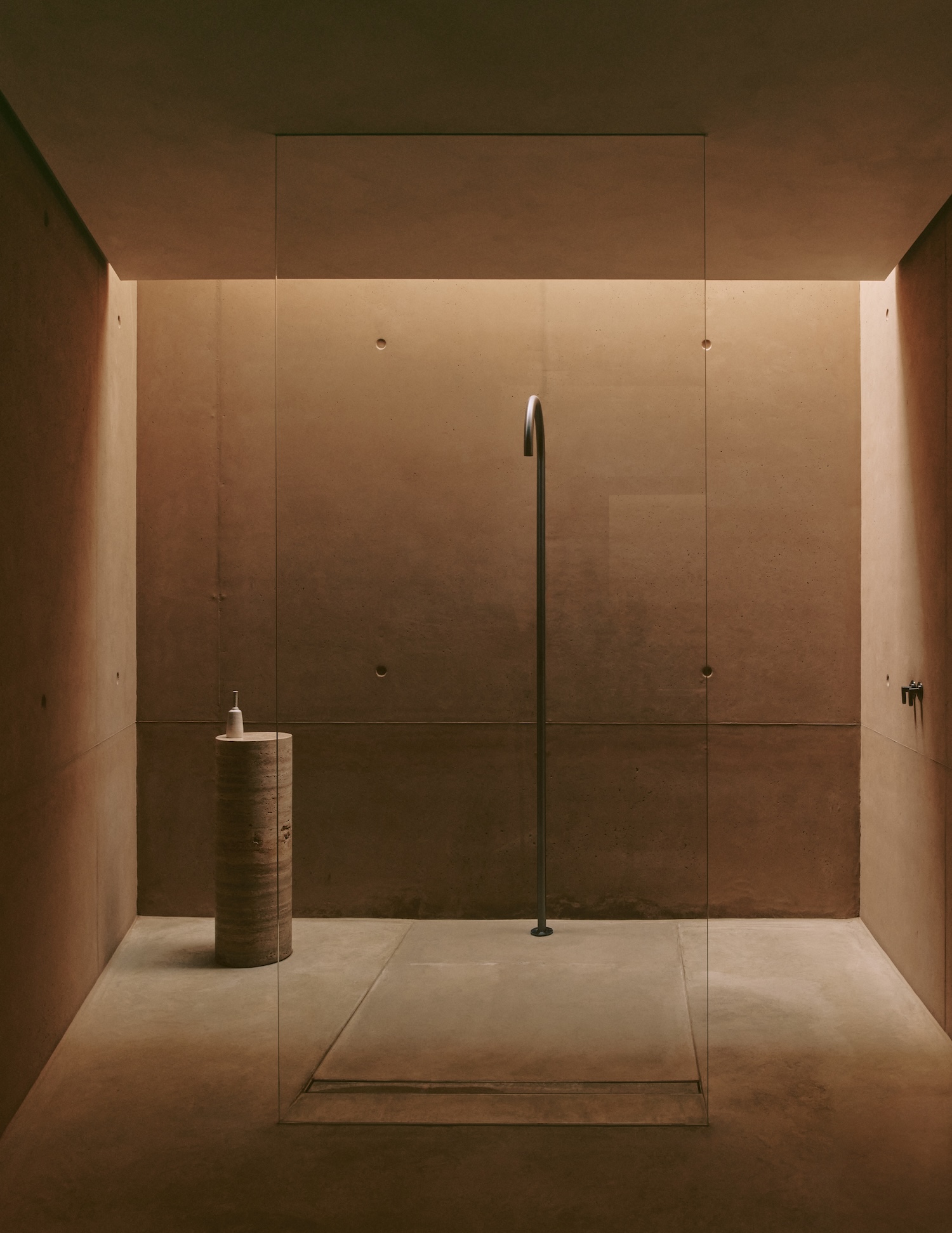 Holt and McLaren Excell spent time at a quarry outside Rome hand-selecting six massive Noce travertine blocks, each mapped in three dimensions to become specific interior elements. The kitchen island, bath pedestals, and other substantial pieces were carved from single blocks, ensuring the stone’s natural strata and color variations remained legible rather than fragmented across multiple sources. McLaren Excell worked with European red elm and the Rome-sourced travertine cut across the grain to reveal its internal structure, creating surfaces that register light and shadow with the same directness found in the concrete walls.