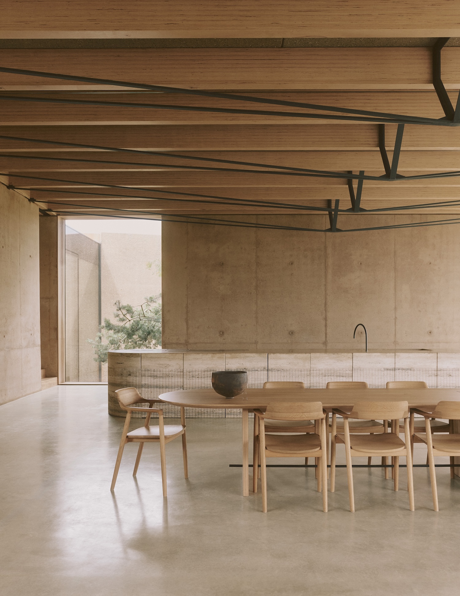 The project occupies an ironstone escarpment where farm buildings once stood, embedding the house into existing topography rather than imposing upon it. This geological condition became the conceptual foundation for all subsequent decisions. The ironstone seam’s burnt orange tones directly informed the concrete formulation used throughout the structure – not as decorative reference but as literal incorporation of the site’s sedimentary character.