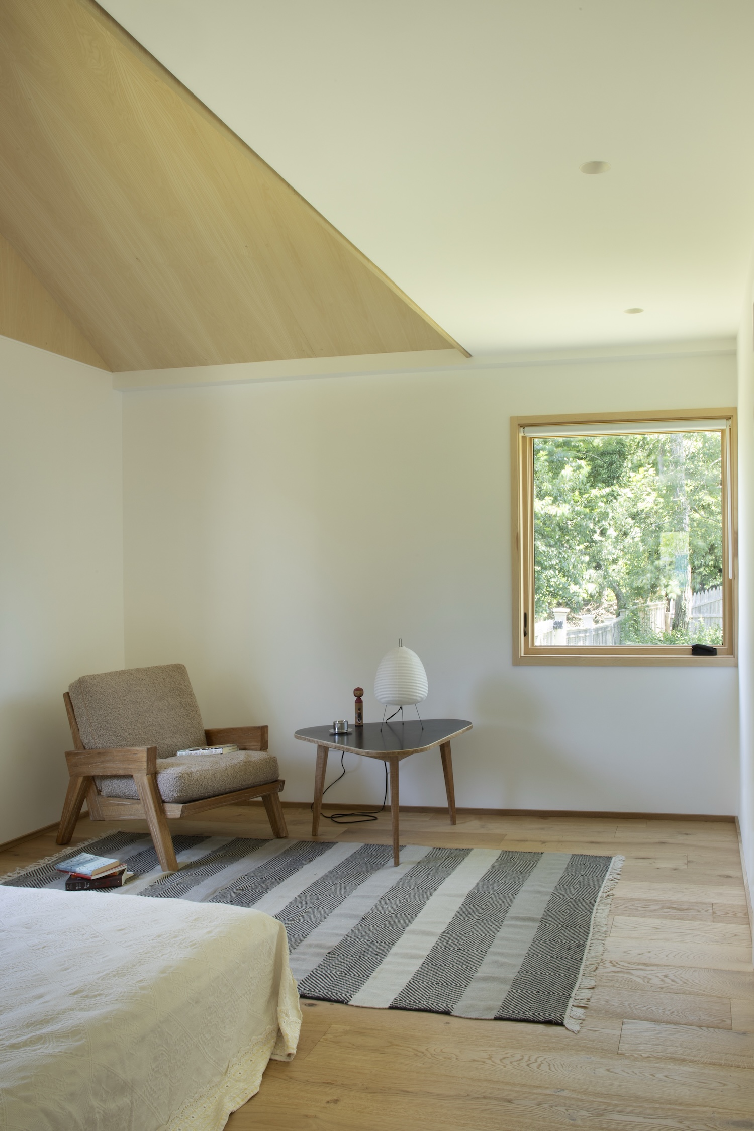 The materials and colors selected convey a sense of humble serenity, with a hint of playfulness; the ash plywood chosen for the ceiling is contrasted with and grounded by the oak used for the floors. The house follows a quiet color scheme: the soft green color in the kitchen area echoes the lush garden, which is omnipresent and brought inside by enlarged picture windows that frame trees in fragmentary compositions, linking the quiet shelter inside with the wide, green yard around it.