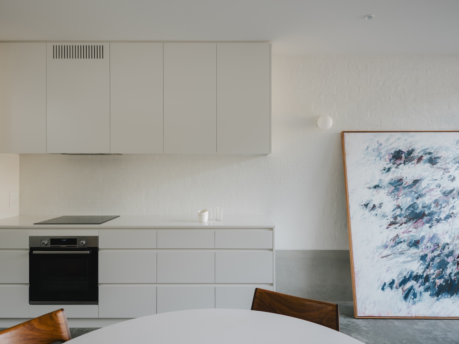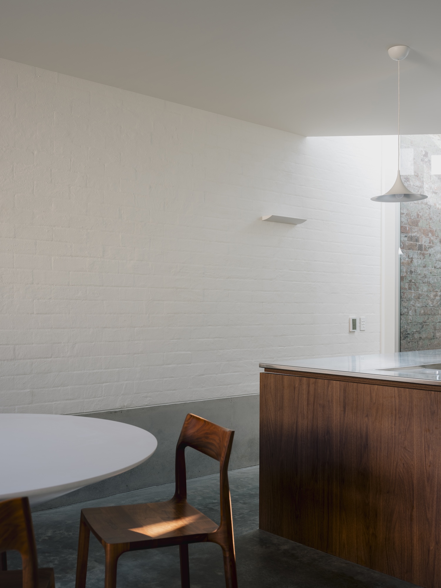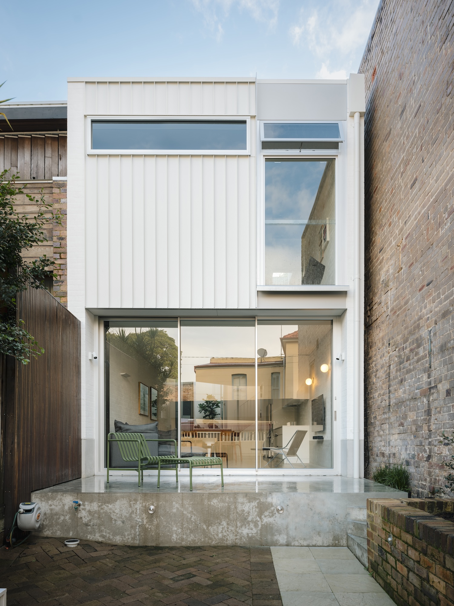 The rear façade was transformed with sleek, glazed sliding panels, allowing a strong visual and physical connection to the outdoor courtyard. To complement the surrounding heritage brickwork, the new elements of the home were kept intentionally simple. Exposed concrete floors extend upward to create a low wall that mirrors the courtyard’s level, integrating steps and built-in seating. Natural white brickwork and exposed steel structural elements reveal the building’s core, while the minimalist material palette aligns with the client’s preference for a low-maintenance, urban family home.House in Newtown II is a minimalist home located in Sydney, Australia, designed by Architect George.
