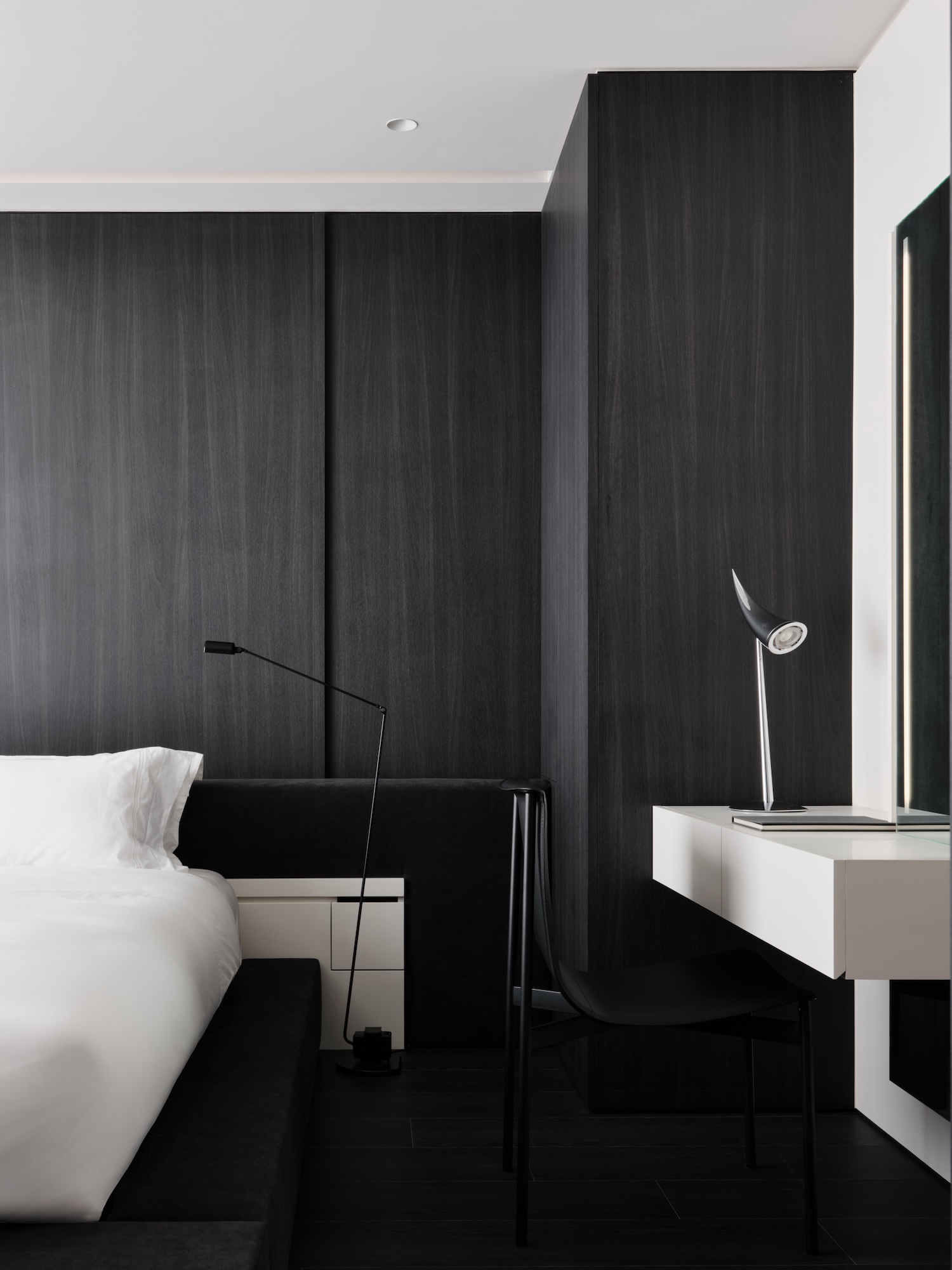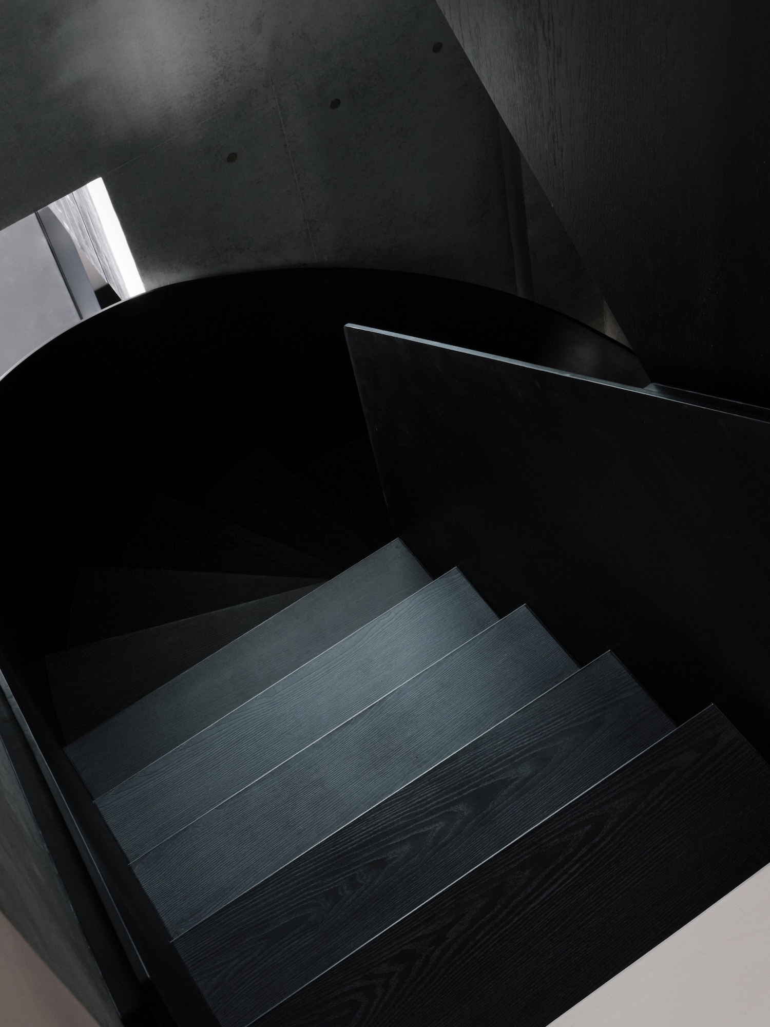 Surfaces that receive frequent tactile contact – door handles, handrails, cabinetry edges – are chosen for warmth and texture, reinforcing the grounded quality the client sought. At the deepest points of the plan, dark-toned surfaces absorb rather than reflect incoming light, preventing the sharp terminations that would otherwise create a sense of compression. The result is a light that settles rather than performs, which places the project within a current of contemporary Japanese and Taiwanese residential practice where restraint and atmosphere matter more than spatial drama.