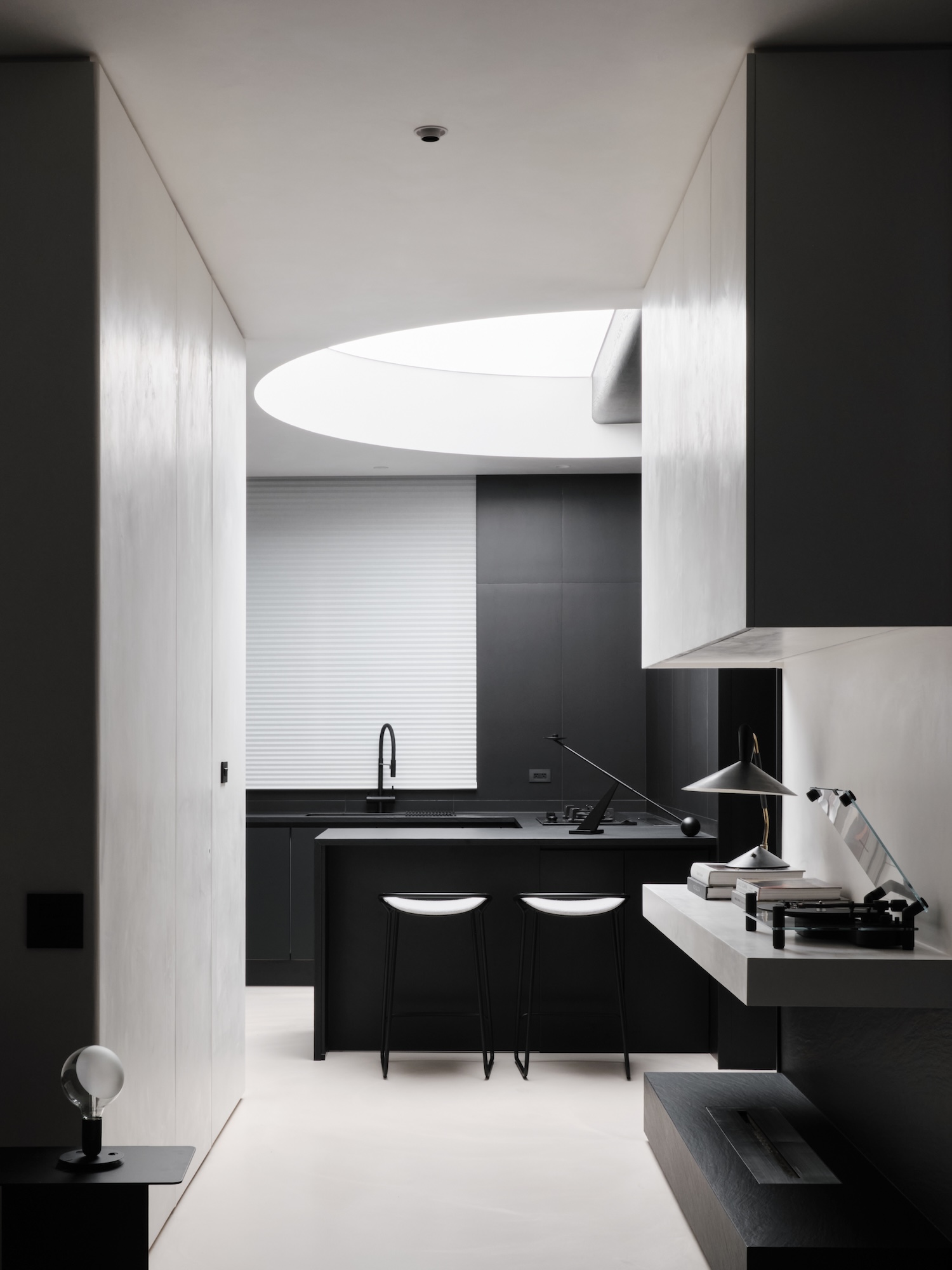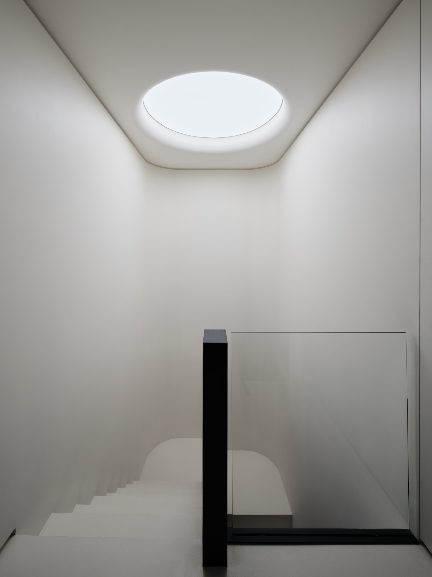The staircase anchors this strategy. Positioned to mediate between vertical light movement and horizontal spatial experience, it functions less as infrastructure and more as a spatial instrument – a form that simultaneously channels daylight downward and connects the domestic levels into a coherent atmosphere. Glass partitions extend this logic laterally, allowing light to travel across rooms without the visual interruption of opaque boundaries.