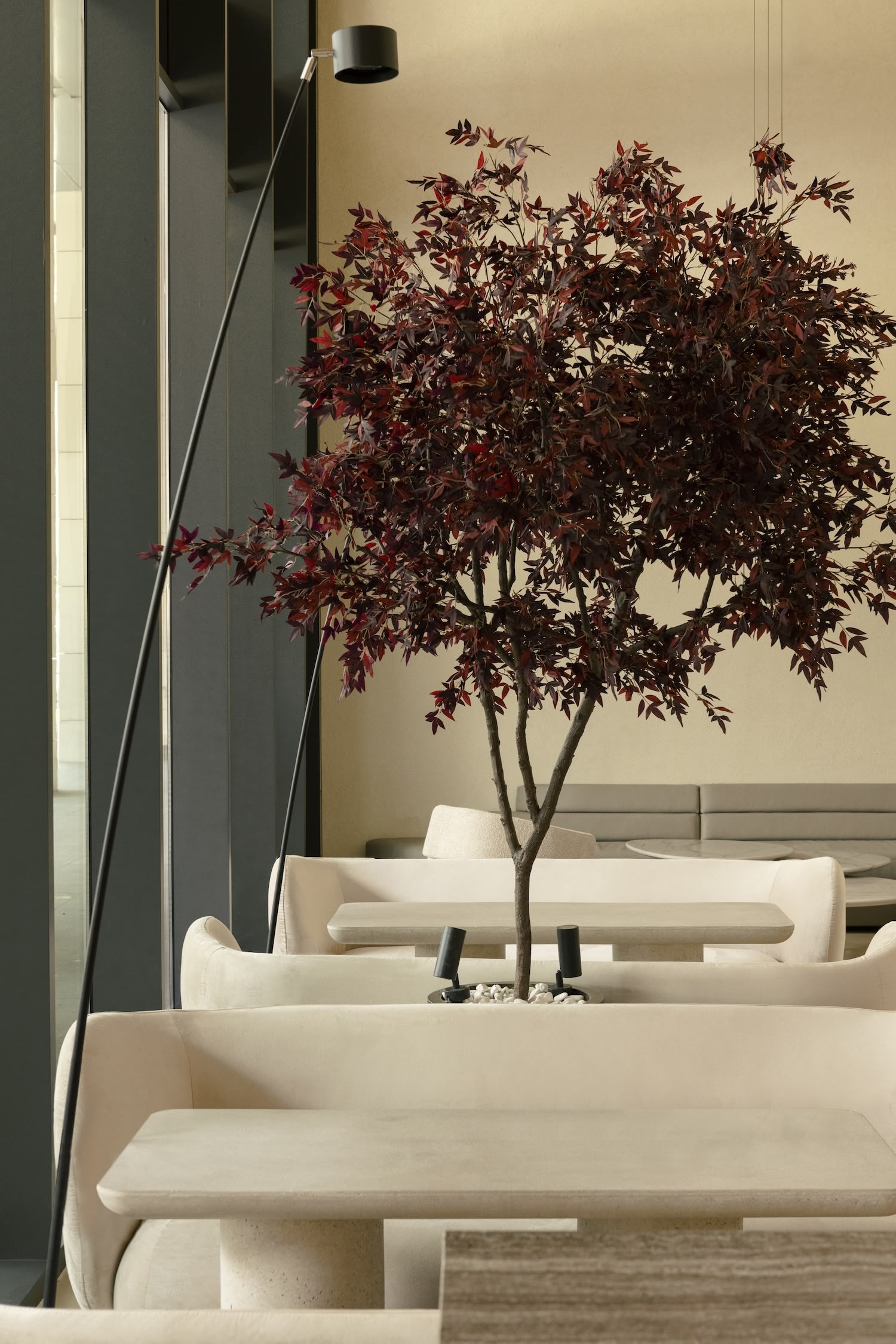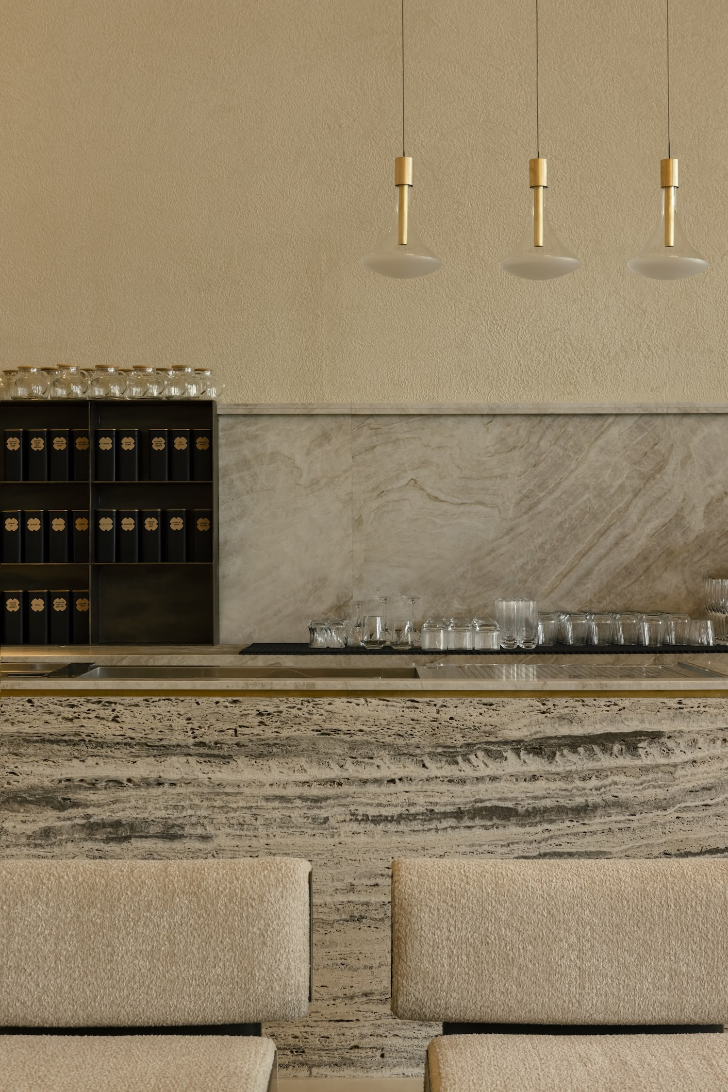 Hplace Cafeteria is a minimalist space located in Dubai, United Arab Emirates, designed by ATELIER PROTOTIPI. The genius of this interior lies in its deceptive simplicity. What appears as minimalist at first glance reveals itself as deeply textural upon closer inspection. Travertine blocks—some polished to a sophisticated sheen, others intentionally raw—create a visual dialogue between refinement and ruggedness. This materiality speaks to what one might call “the thinking hand,” where craft knowledge manifests not as decoration but as fundamental structure.