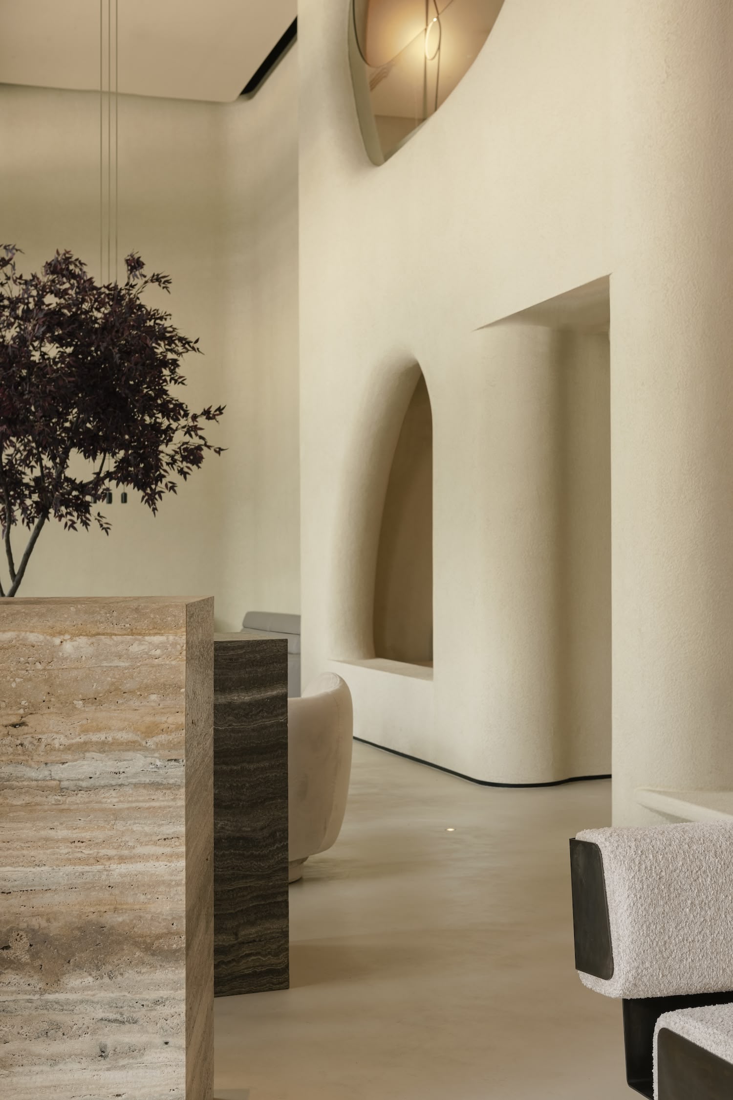 The space unfolds not through conventional thresholds but through carved tunnels and organic apertures, echoing the cave dwellings that have sheltered desert inhabitants for millennia. Much like how Carlo Scarpa reimagined architectural transitions in the mid-20th century, HPlace reformulates our understanding of interior progression. We don’t simply move through spaces; we experience a narrative of unveiling.
