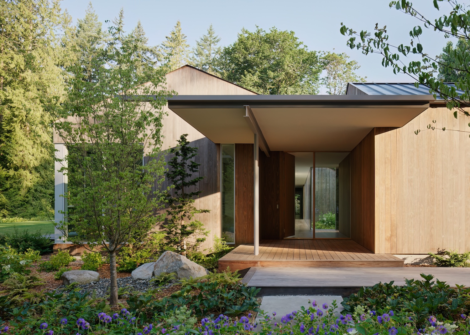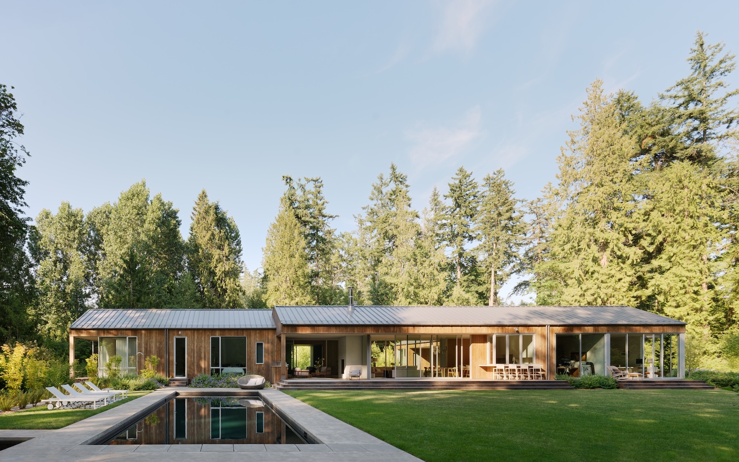 Interurban Residence is a minimalist house located in Seattle, Washington, designed by Heliotrope Architects in collaboration with Amy Baker Design. The house reveals its intelligence gradually, beginning with its tripartite organization. Three wood-clad wings unfold in an L-shaped configuration, each crowned with simple gable roofs that drain rainwater into those half-round gutters. This arrangement is neither arbitrary nor merely functional – it represents a sophisticated understanding of how families actually live. One wing cradles shared spaces where daily rituals unfold, another provides retreat into private sleeping quarters, while the third houses the practical necessities that support modern life: garage, exercise room, guest suite. The perpendicular arrangement creates protected exterior spaces while ensuring that woodland views penetrate every room.