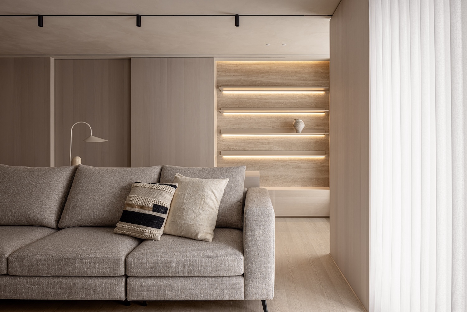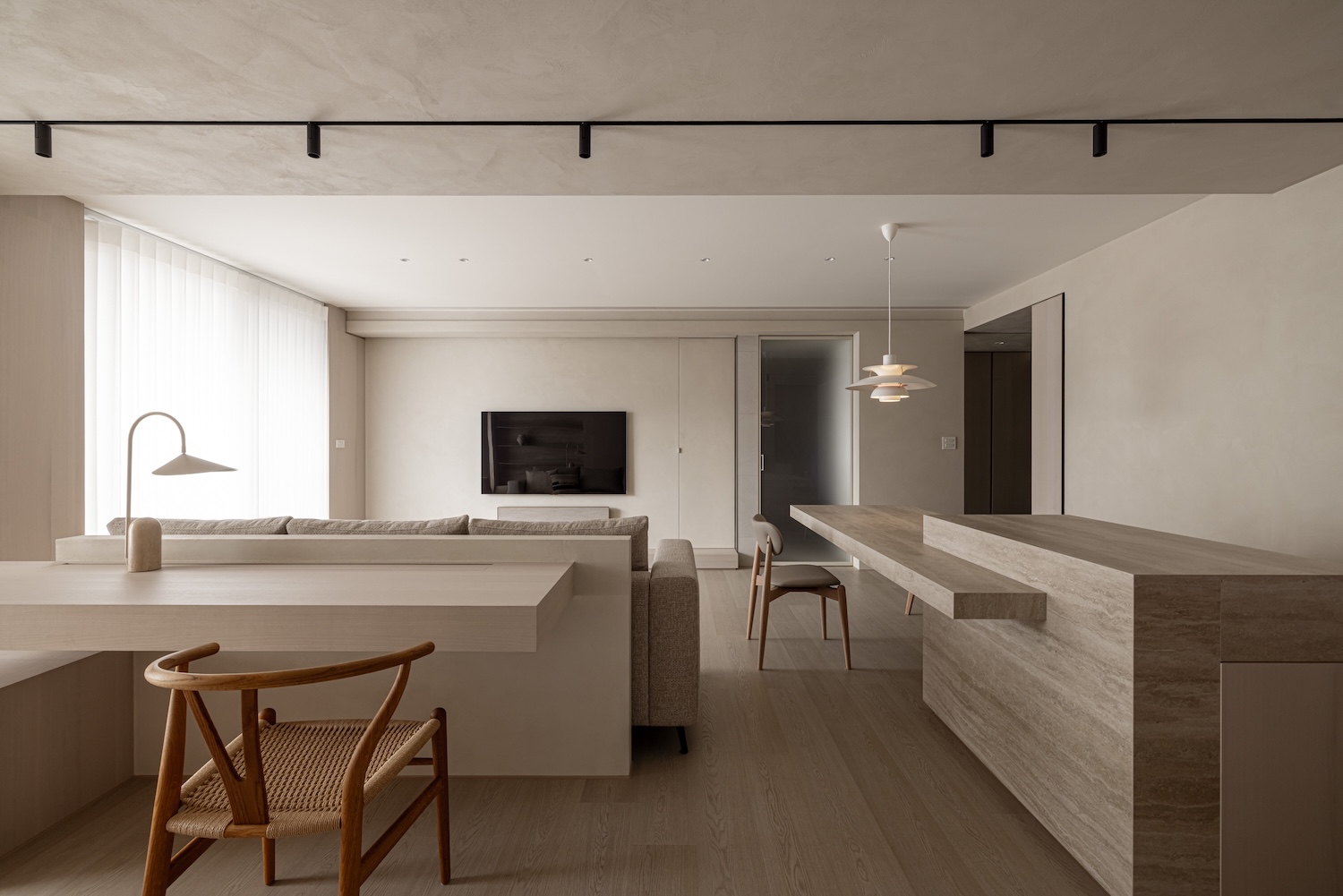 J House is a minimal apartment located in Hsinchu, Taiwan, designed by CJ.DE. The transformation of sand into silicon is both a technological process and a powerful metaphor that defines the architectural character of “Silicon Poetry” in Hsinchu. At the heart of this design narrative is a striking chandelier that captures the essence of this duality – its crystalline forms echo both the raw geological history of silicon and its refined technological future.