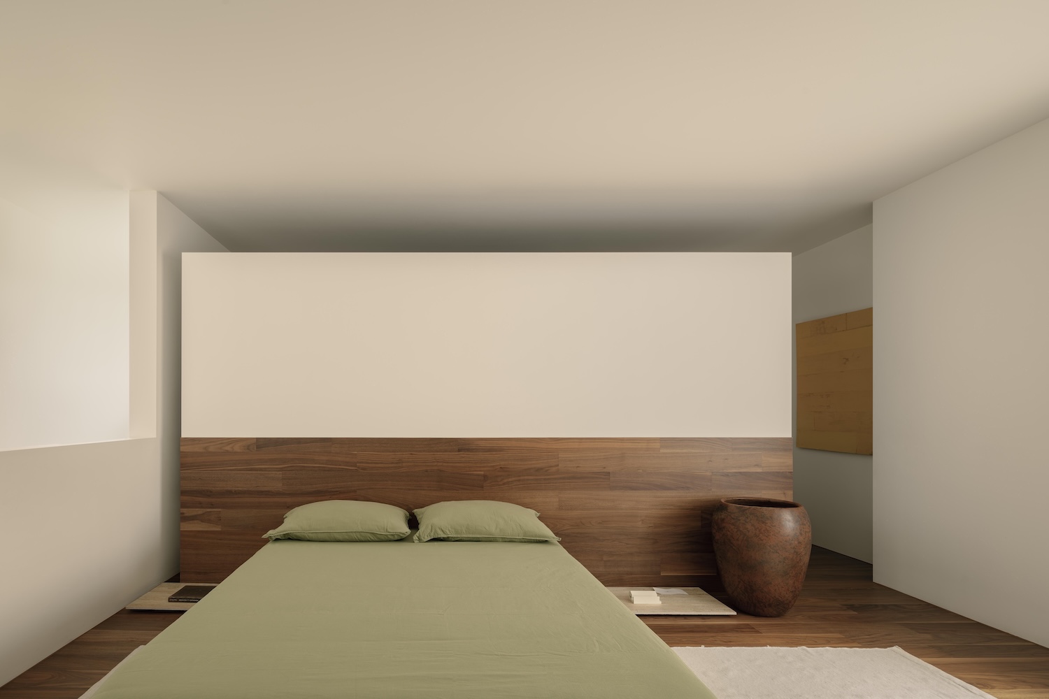 The bedroom sits above, compressed and intimate, with a single circular aperture directed at a tree planted at the garden’s center. Three small windows elsewhere in the house orient toward specific views – a mountain, a neighboring pine – while the remainder of the envelope remains closed. The entrance descends rather than ascends, a gesture that reads as both practical (the natural rock provided stable foundation without expensive earthworks) and ceremonial. Entering the house requires a literal lowering of the body, which HW Studio frames as an analogue to the humility encoded in passing through a torii gate.