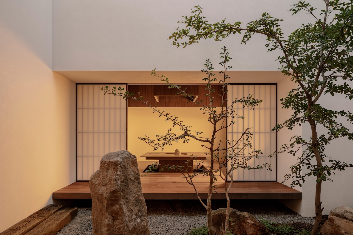 Shoji screens with rice paper control the boundary between interior and garden. Their function is perceptual as much as practical – light passing through them loses urgency, softening into something that registers more as duration than illumination. The effect is close to what Junichiro Tanizaki described in In Praise of Shadows: shadow treated not as the absence of light but as its most cultivated form.