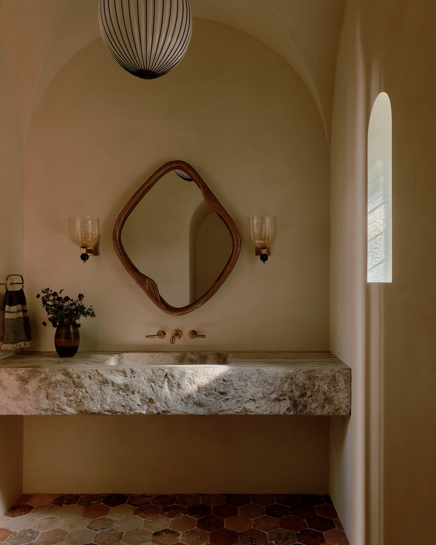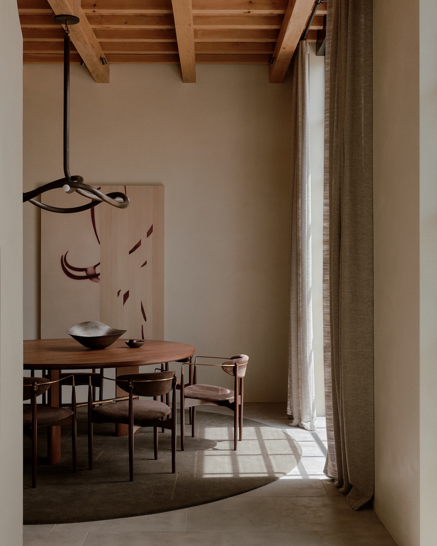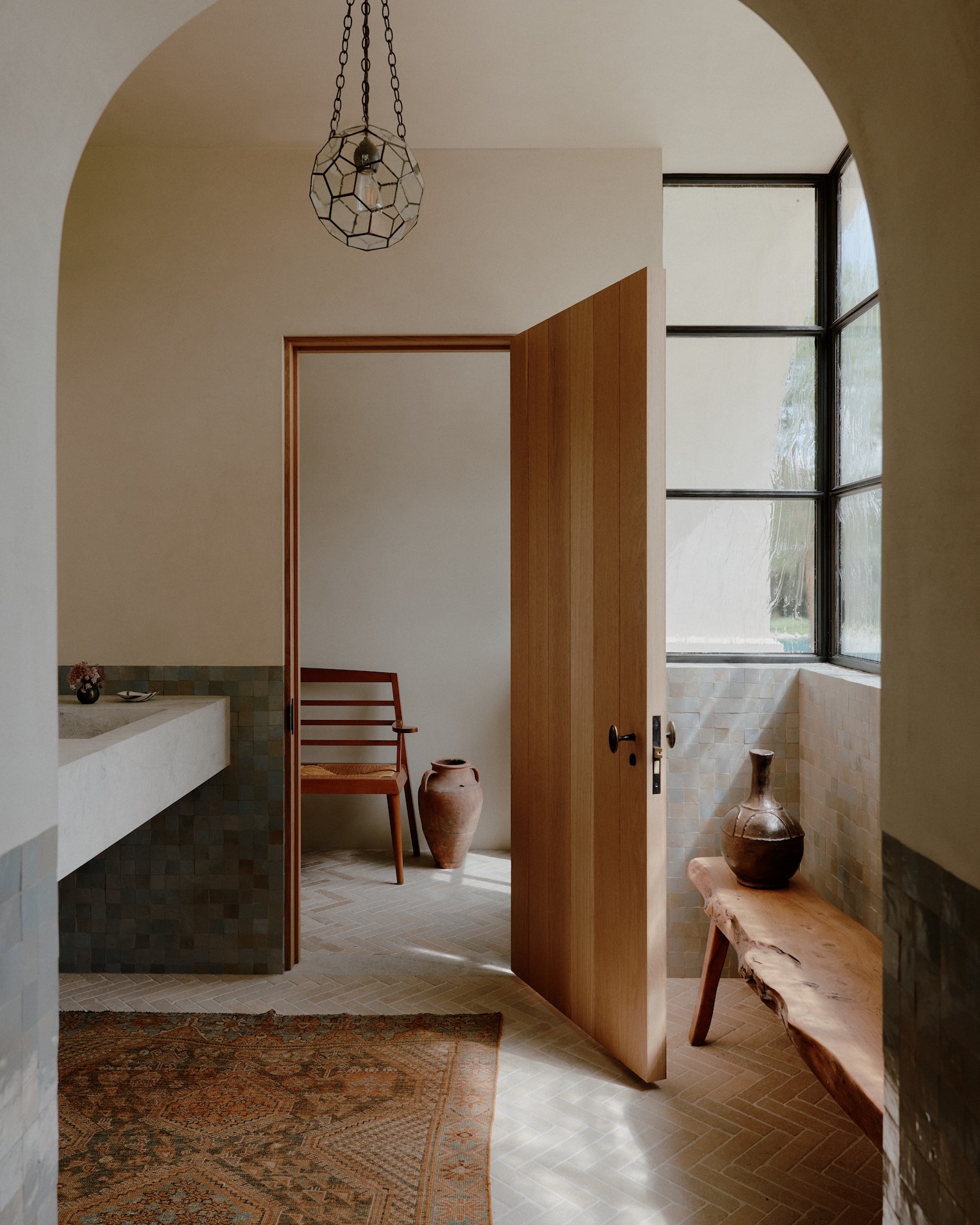 The multi-wing layout surrounds a central courtyard emphasizing indoor-outdoor harmony characteristic of Mediterranean residential typologies while responding to Austin’s climate conditions that support year-round outdoor activity. Terracotta-tiled roofs, light plaster walls, and expansive arched openings establish regional architectural character while custom stained glass details and hand-hewn locally sourced wood carpentry introduce craft specificity that distinguishes the project from generic Mediterranean revival approaches.
