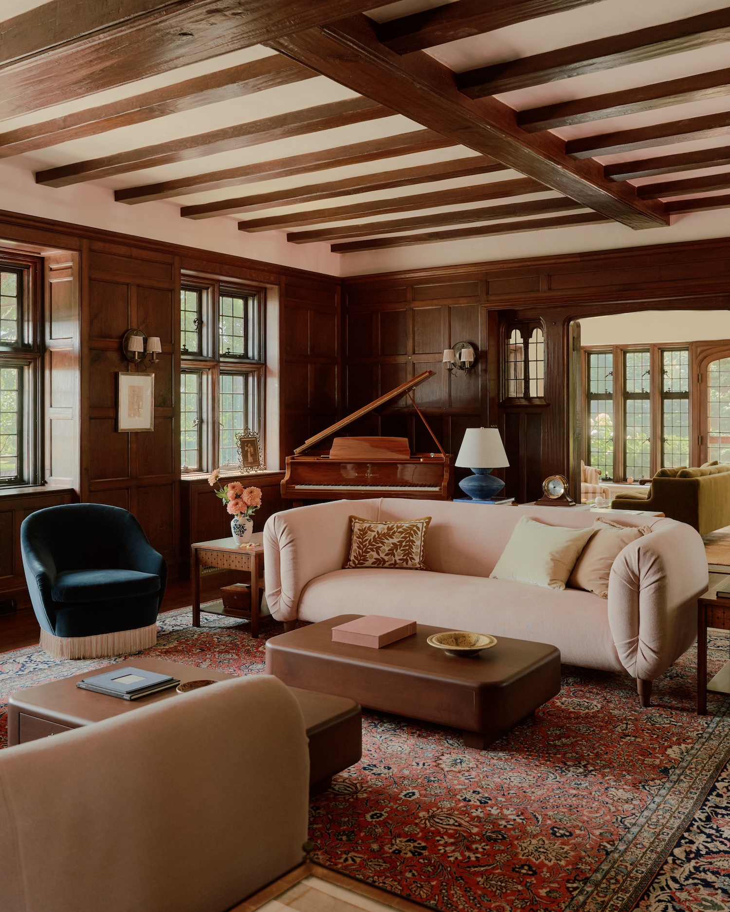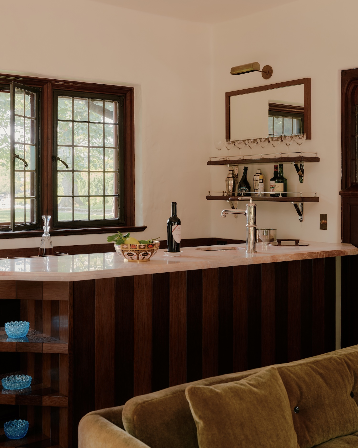 The sunken living room anchors this balance most vividly. Its original dark oak paneling and built-in shelving create an envelope of depth and warmth, and GA responded with generously proportioned organic sofas, Art Deco vintage chairs, and curved low coffee tables that suggest both mass and ease. The moody enclosure is punctuated by French doors opening onto a terrace facing Larchmont Harbor, a calibrated contrast that keeps the space from reading as interior theater. An enclosed sunroom with a custom bar at the far end extends the ground floor’s commitment to informal hospitality.