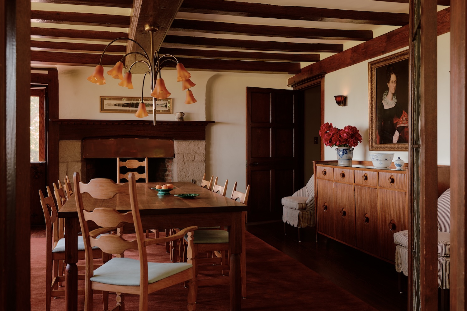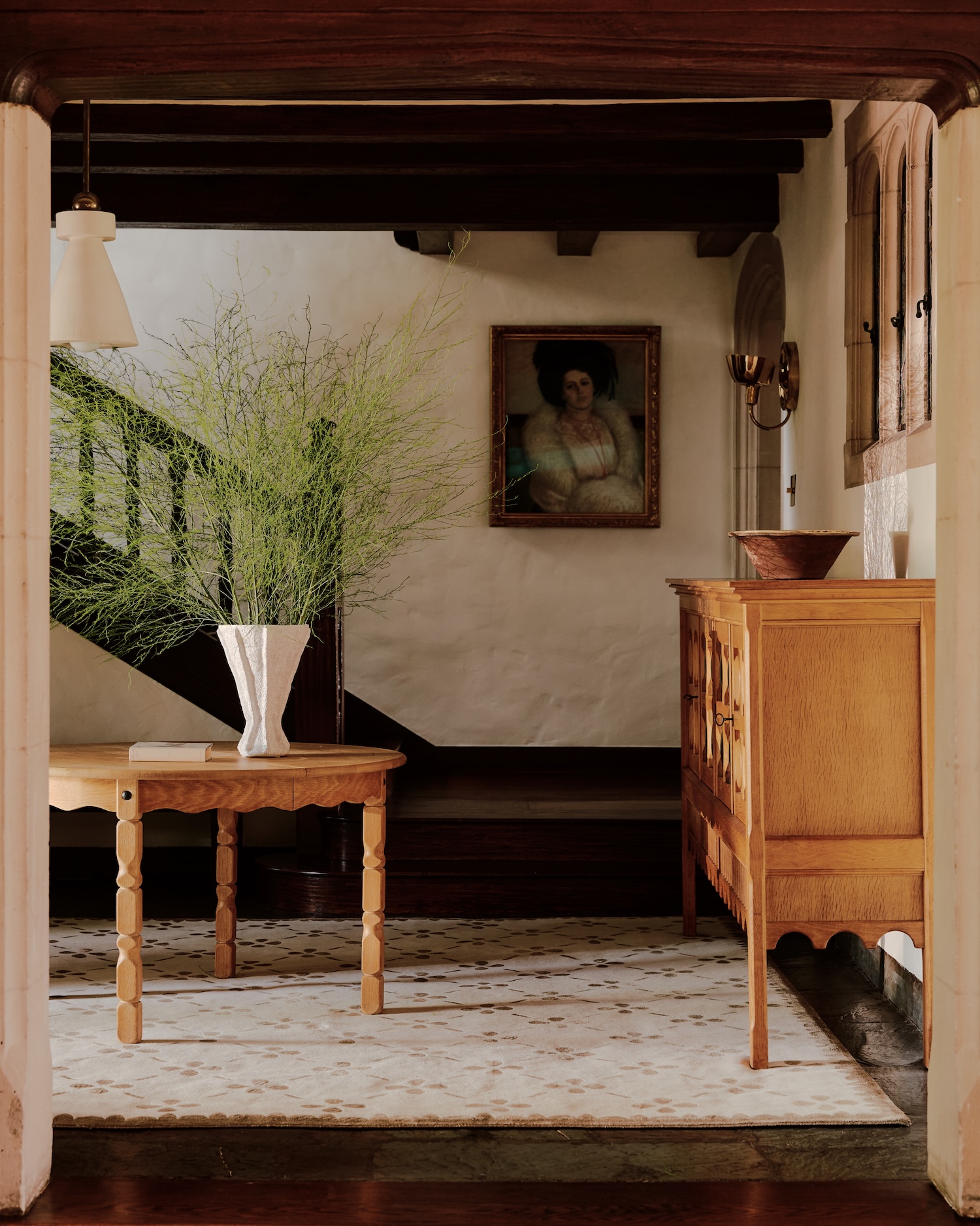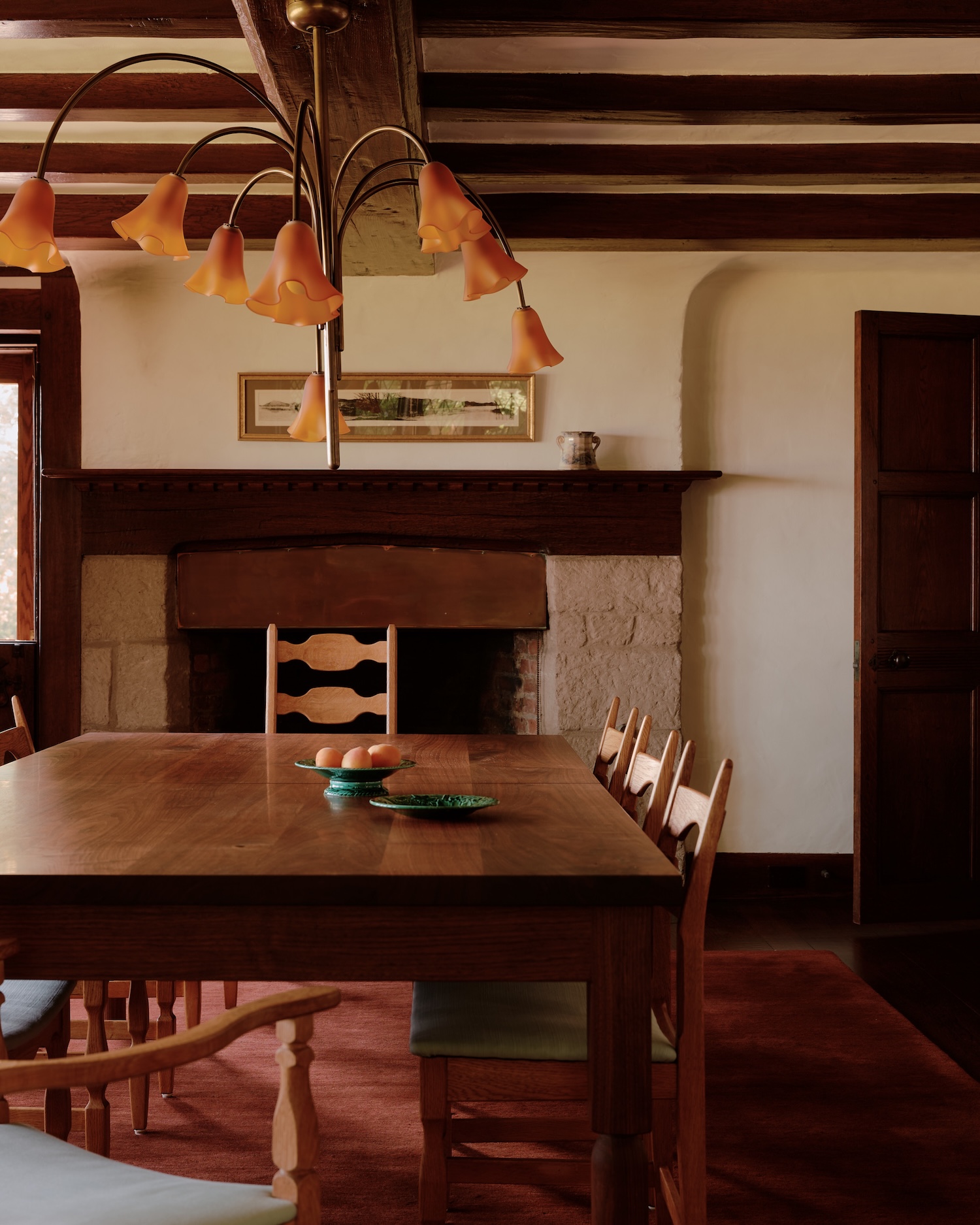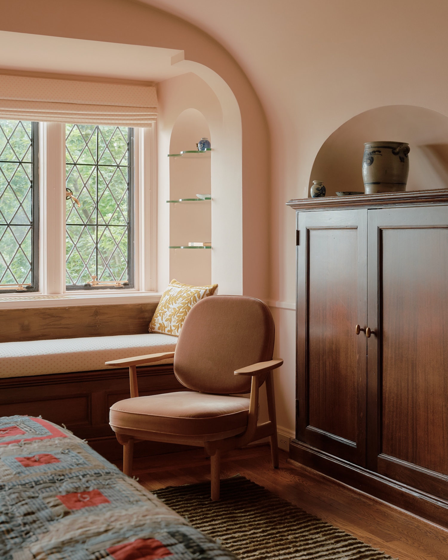 The Tudor Revival vocabulary of the home – asymmetrical floor plans, patterned brickwork, stained glass, and intricate millwork – operates as a kind of tonal score for the interiors. Rather than neutralizing these elements with a clean contemporary overlay, GA used them as generative material, reading the richness of pattern and surface already embedded in the architecture as permission to layer further. Limewashed walls, patterned wallcoverings, and handcrafted lighting find their logic in the ornamental density of the existing structure, while the overall palette remains grounded enough to support daily family life without tipping into period pastiche.