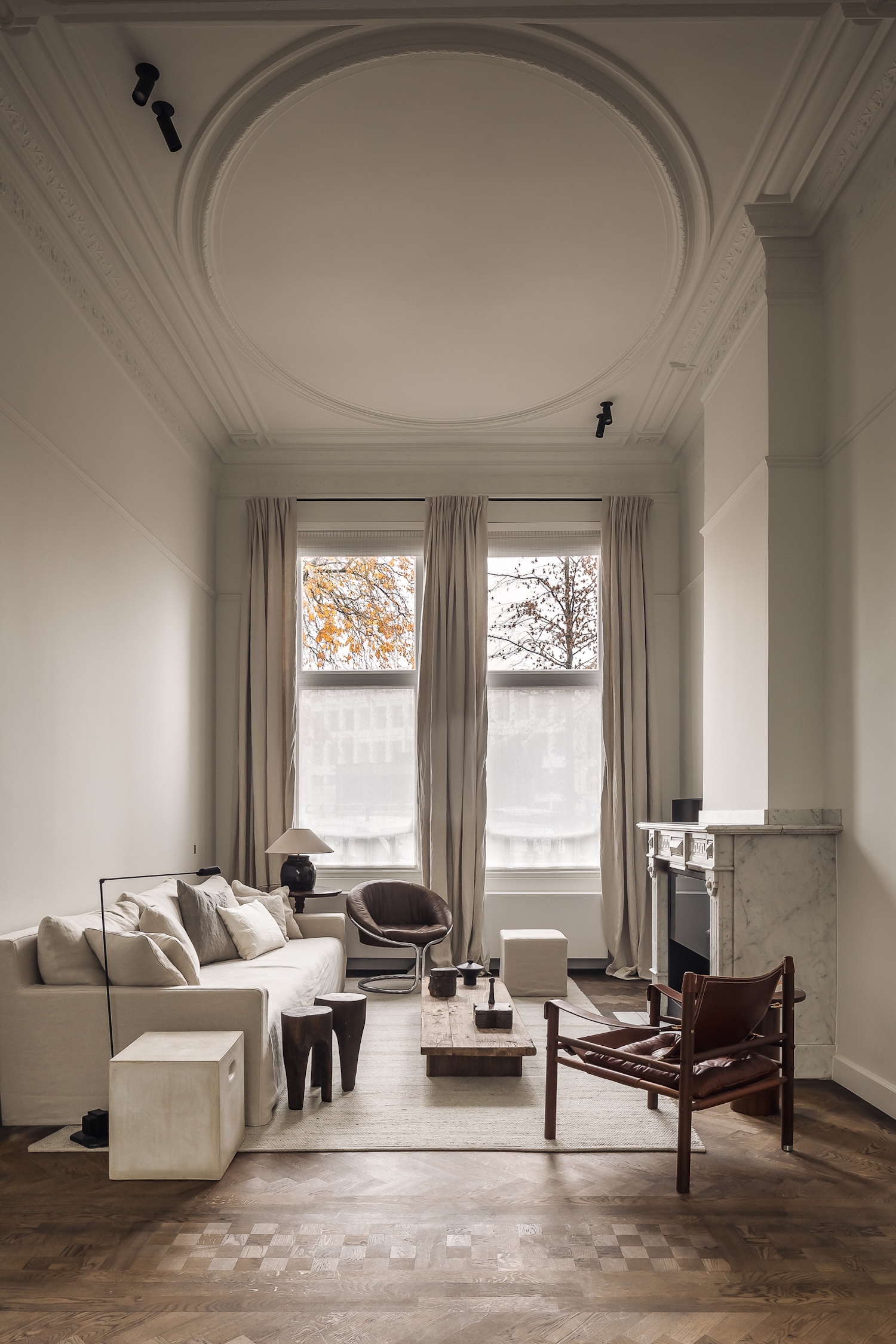 LH Residence is a minimalist townhouse located in Antwerp, Belgium designed by Jim Dierckx. The project confronts a challenge inherent to early 1900s urban housing: how to reconcile ornamental historical detail with the spatial needs of contemporary family life, particularly the chronic absence of natural light in narrow classical homes. The renovation strategy reveals itself most clearly in the transformation of the rear spaces.