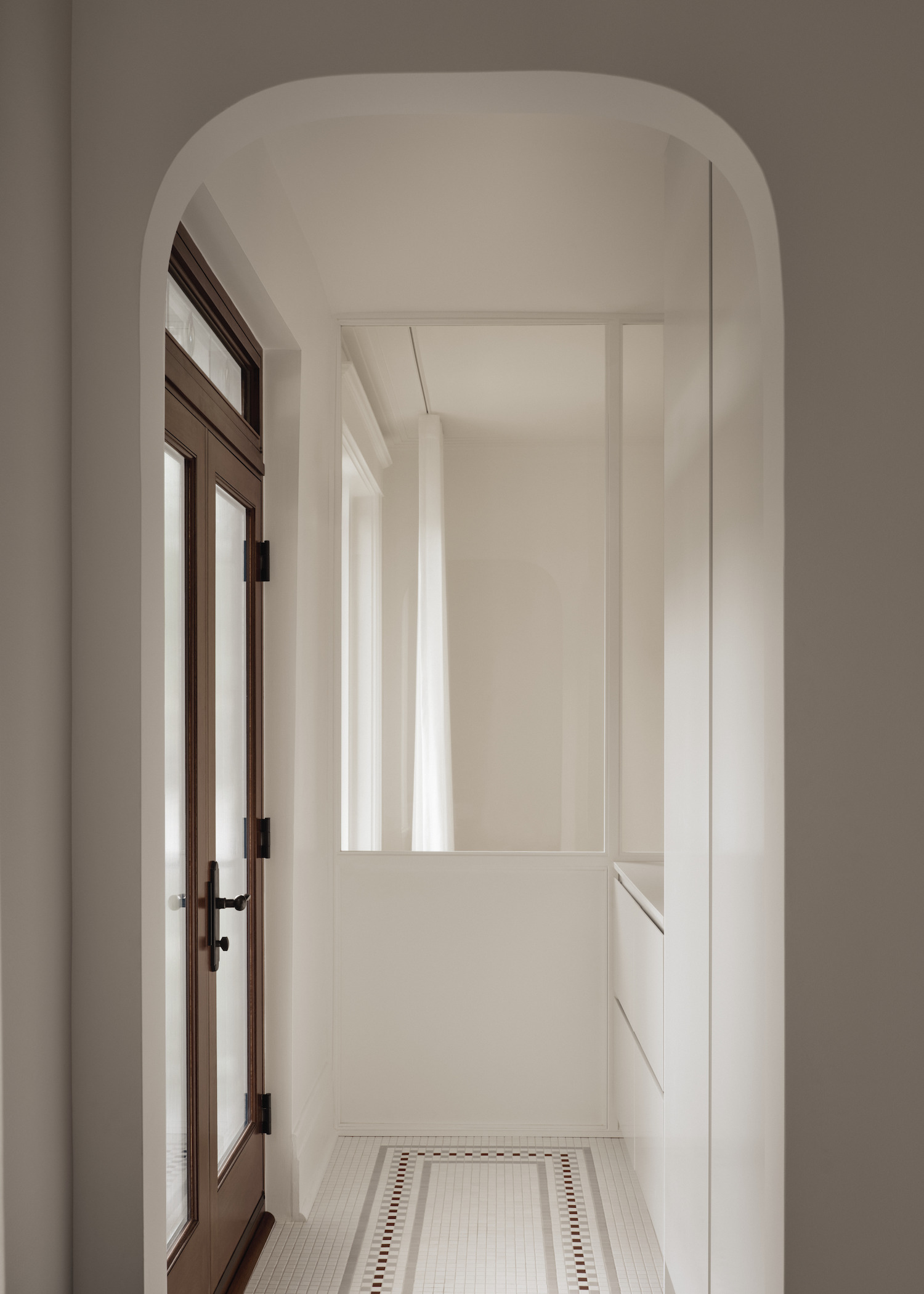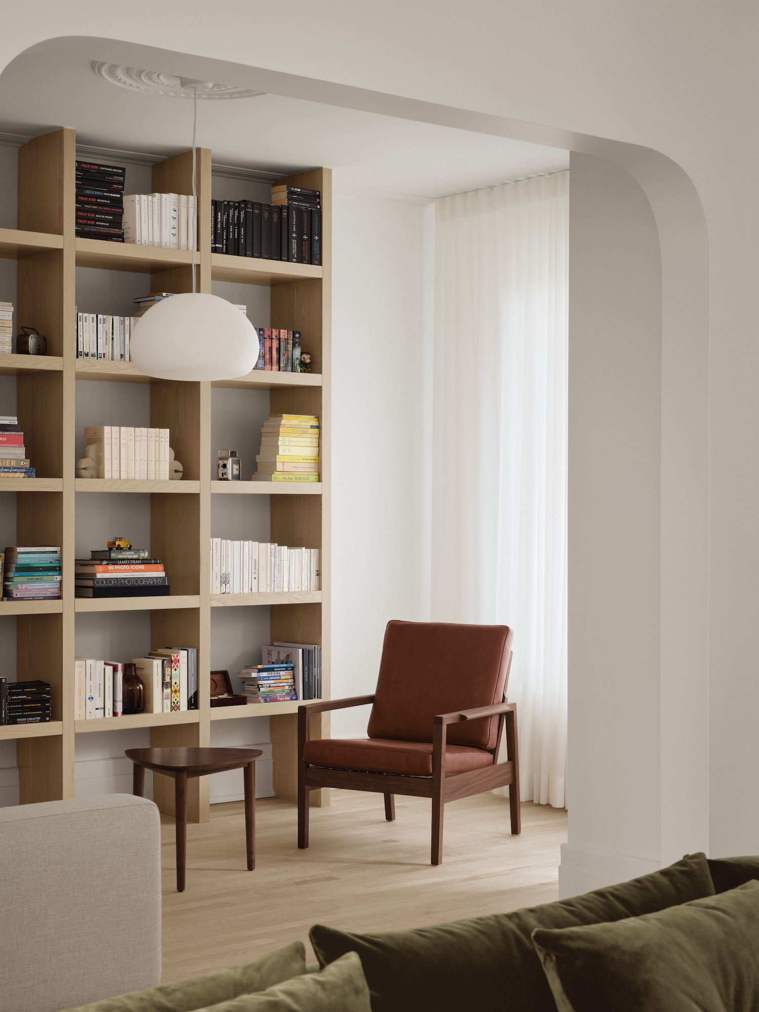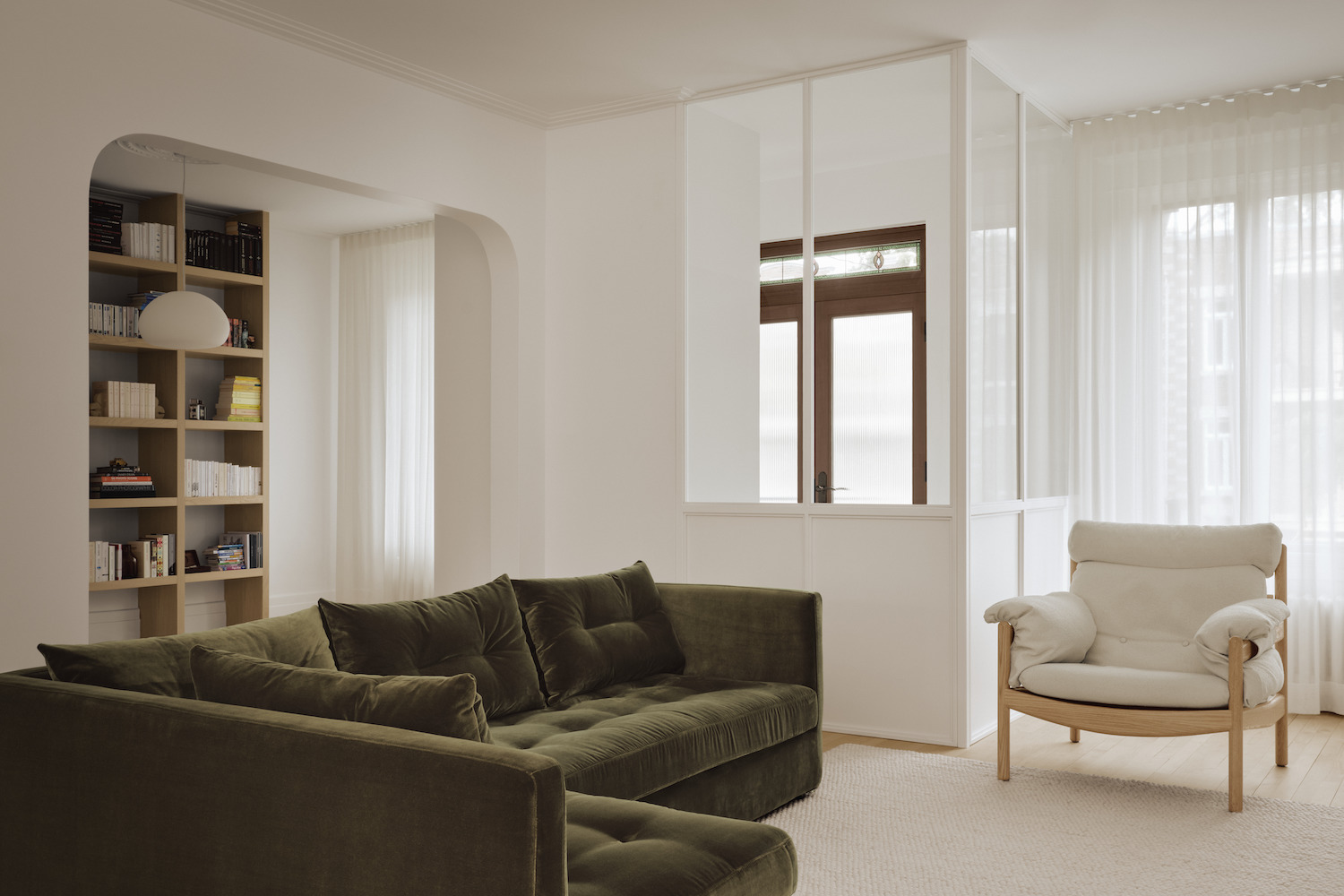 Louis-Hébert Residence is a minimalist house located in Montreal, Canada, designed by Vives St-Laurent. The architects took note of the Montreal plex’s specific spatial organization right from the entrance. A central vestibule provides access to rooms on either side of a corridor. The room near the entrance was transformed into a versatile living area with a wall-mounted bookcase, seating, and an integrated desk. A glass partition defines the space while allowing natural light to flood in. The renovation focused on preserving and enhancing the residence’s original elements. Arches were rounded to create smooth transitions between spaces, and the original flooring was carefully sandblasted to retain its authentic character.