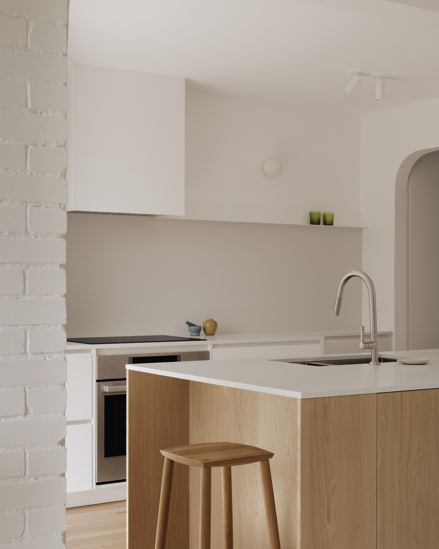An arch between the dining room and kitchen aligns with the white oak island, becoming a central element in the room. The kitchen, characterized by neutral tones, combines quartz and lacquer to create a serene tone-on-tone effect. A coffee corner and pantry discreetly store everyday items, maintaining both aesthetics and functionality. Moving to the second floor, skylights above the staircase and in the upstairs bathroom flood the space with soothing natural light. The design concept aims to create an airy and calming atmosphere, with a custom-made vanity unit echoing the kitchen’s aesthetic.