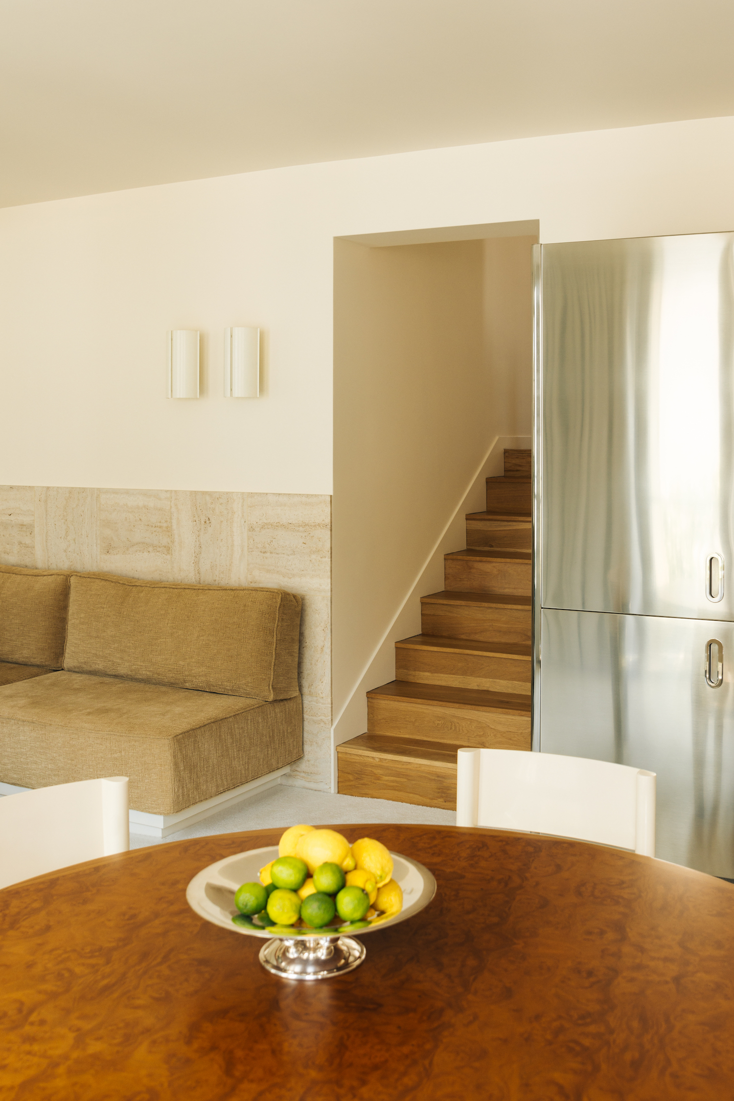 When the duo first encountered the apartment, it felt disjointed — fragmented into a series of small rooms in varying colors and dark finishes. “It was more like a doll house at the beginning,” shared Haddou. As a result, the renovation sought to introduce a sense of coherence by establishing a unified design language throughout: bright eggshell white walls and ceilings now amplify light across the residence’s two floors, while 1970s influences and vintage Italian furniture from the 70s, 80s, and 90s, runs throughout. “The design of the building’s entrance hall features a lot of stone and exotic plants, which is more common in cities like Milan,” Haddou explains. “It gave the space an Italian touch that we liked, and we wanted to develop that sensibility inside the apartment too.”