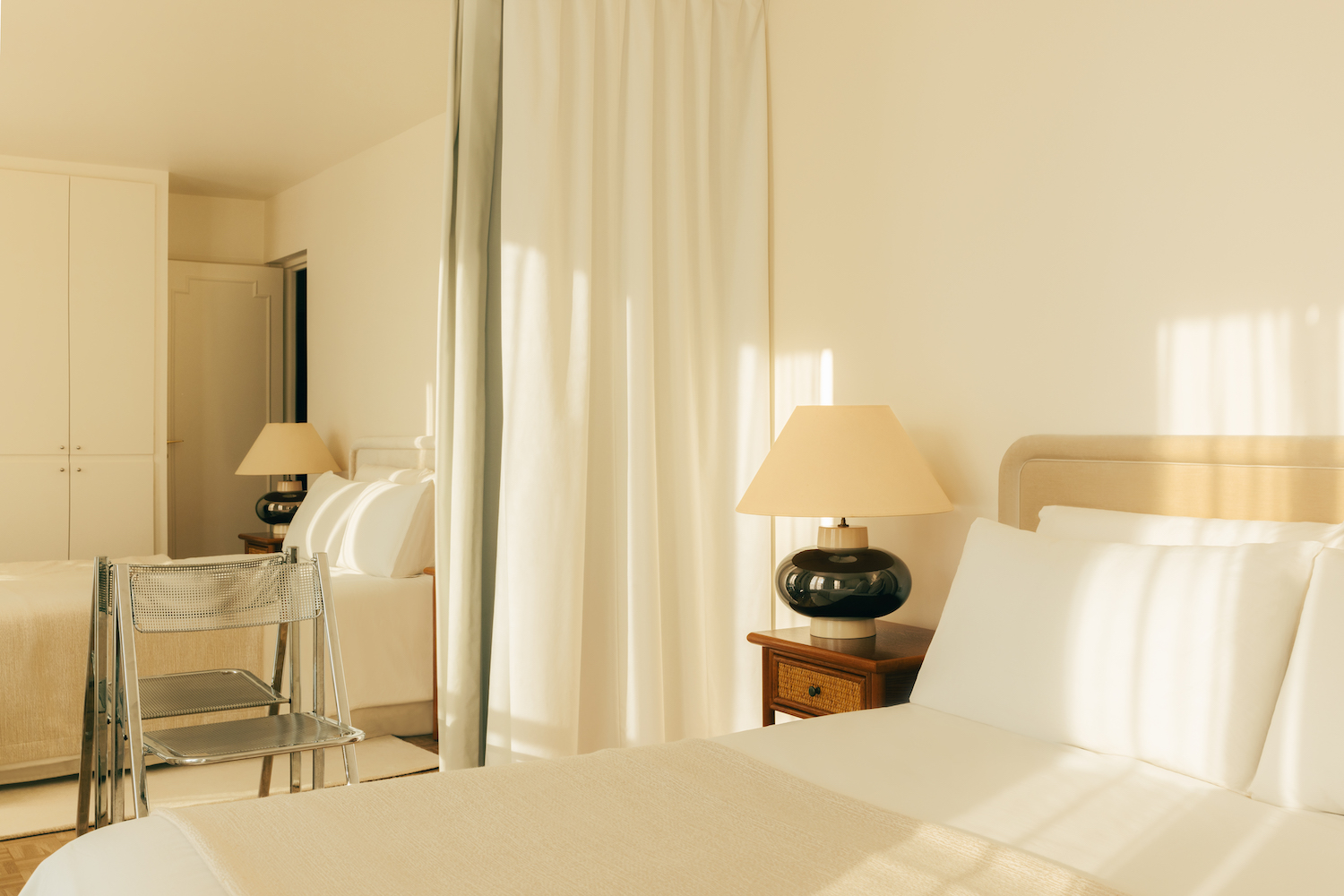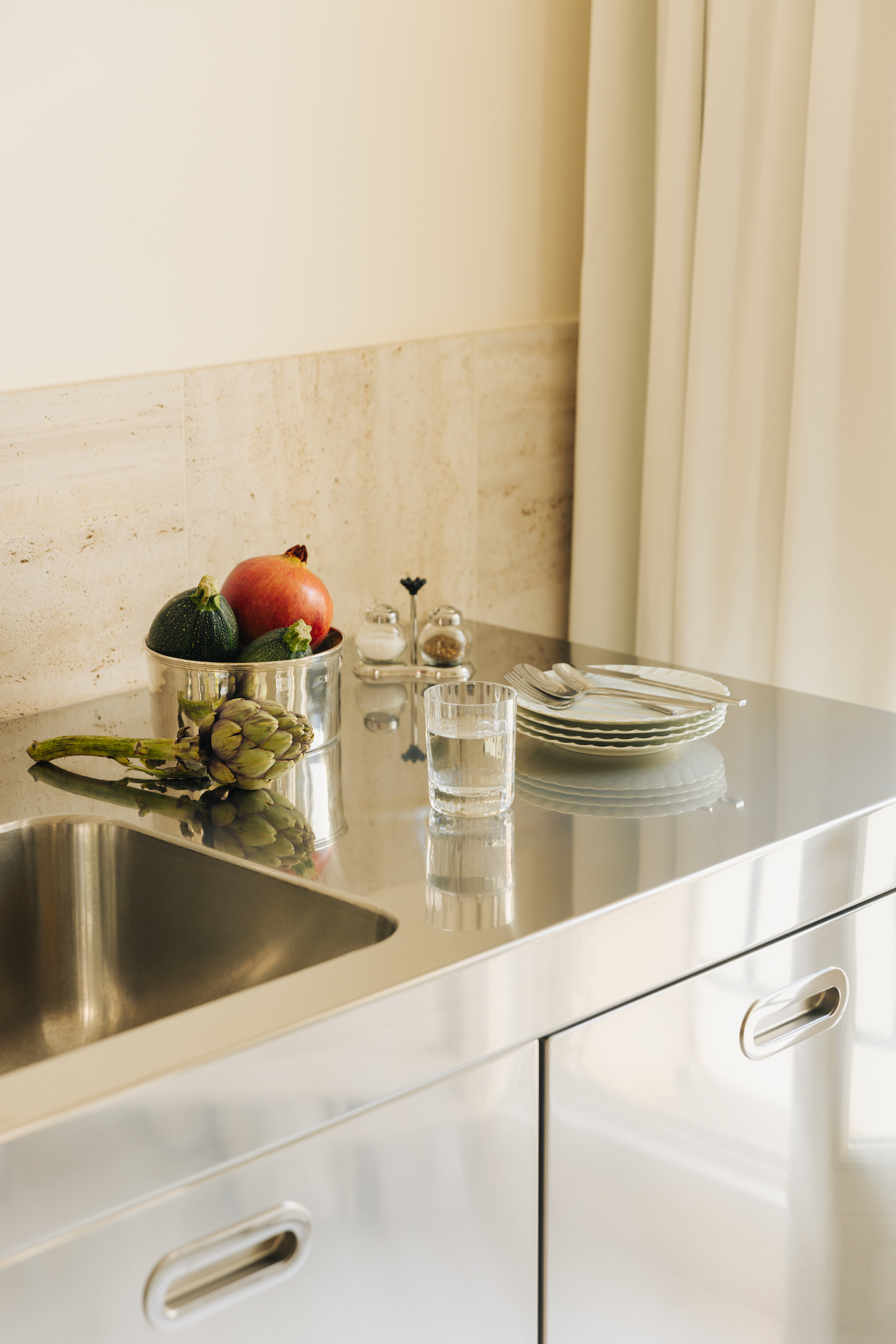 Meanwhile, a tactile material palette introduces balance. The softness of linens and carpeting throughout the home offer a brilliant contrast against “rough” materials such as the travertine stone accents on the walls and sharp touches of metal and mirrored surfaces in the open kitchen and living area.True to the studio’s broader practice, the Marais Apartment respects the building’s original architecture while carefully inserting contemporary elements to create a residence that stands the test of time. “It was important for us to make this a timeless space that we wouldn’t get tired of,” notes Haddou. “If you feel good in a space, you’re not tempted to change everything. We want to design spaces that last.”