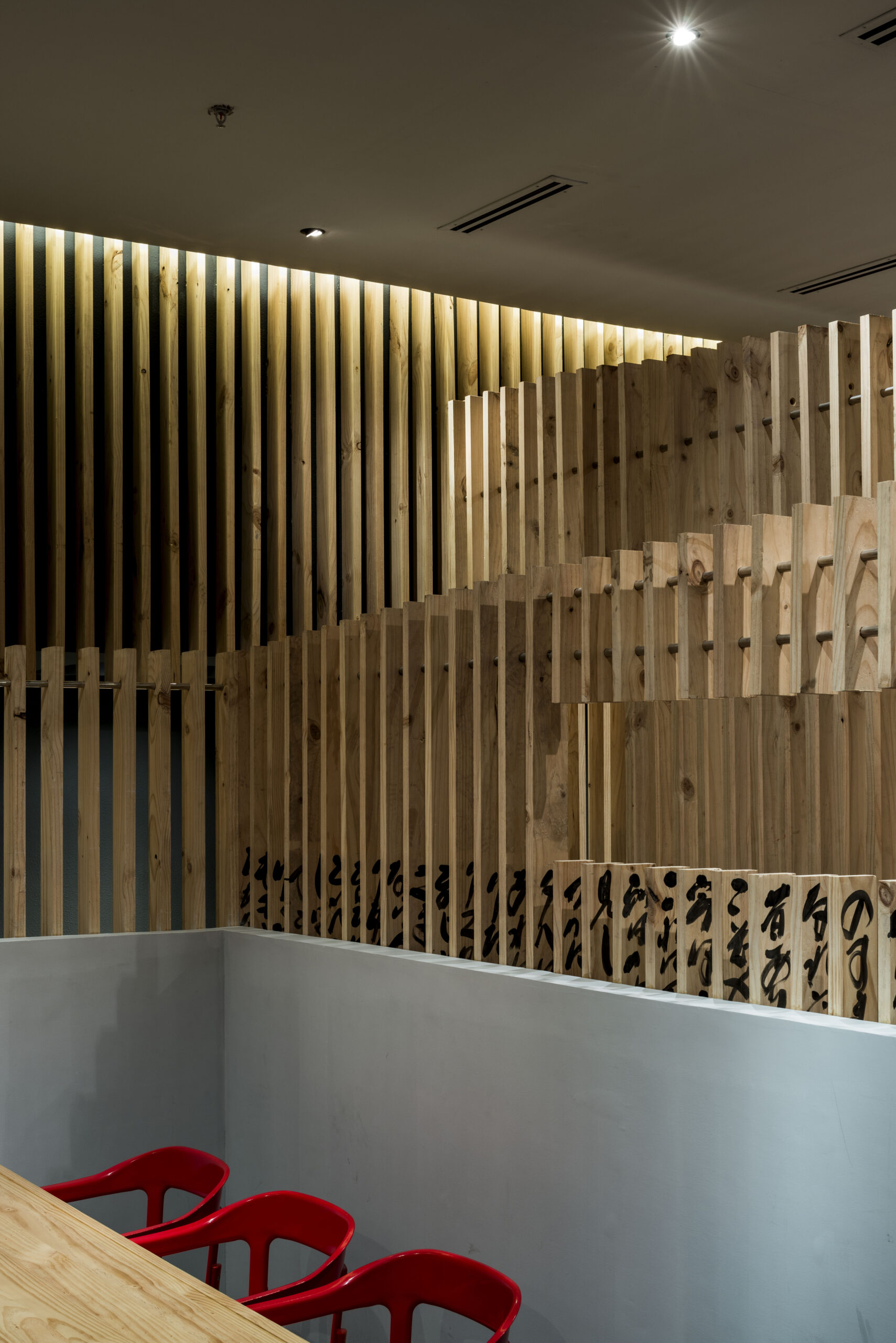 MERICAN BARBERSHOP is a minimalist space located in Hyogo, Japan, designed by RID Co., Ltd.. The clients requested the space to be as open as possible. As a result, the designers decided to use pillars to separate the space. The interior features an exposed ceiling, revealing the piping and air ducts above – a direct contrast against the simplified floor plan and aesthetic of the salon. The wood material remains consistent throughout the space, and is utilized as a rest for the pillars as well as the reception desk.