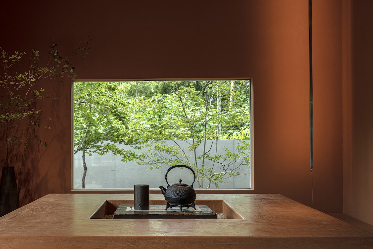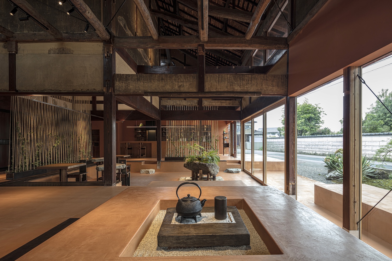 The goal was to maintain the historical essence of the building while adapting it for contemporary use. At the heart of the café is a doma, a traditional Japanese space where visitors can walk with shoes on, typically featuring an earthen floor. The doma is framed by steps and benches, creating natural zones for relaxation and interaction, while also blurring the boundary between indoor and outdoor spaces. A central art installation, composed of stones and timber unearthed during the renovation, serves as a focal point, connecting the café’s modern design with its past. Medicinal herbs planted within the artwork further tie the café to its roots in Chinese herbalism. Additionally, an ivy-covered rope partition around the doma offers a visual element that evolves over time, enhancing the café’s atmosphere.