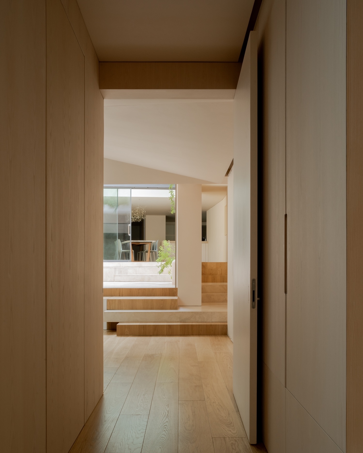The solution unfolds as an episodic architectural journey embedded within a sculptural excavation of the unusually deep rear garden. By carving two new floors downward and outward rather than upward, the studio preserved the integrity of the Georgian terrace while establishing an entirely new spatial world behind it. The 85 square meters of added accommodation – a master suite, dining area, bathrooms, and sunken courtyard – read as a discovery rather than an imposition, gradually revealing themselves through a sequence of interconnected spaces.