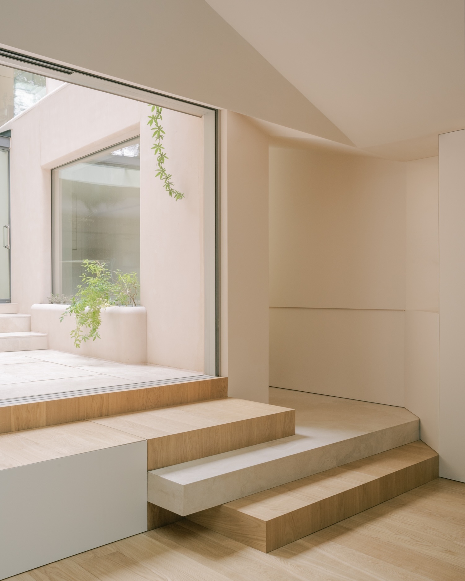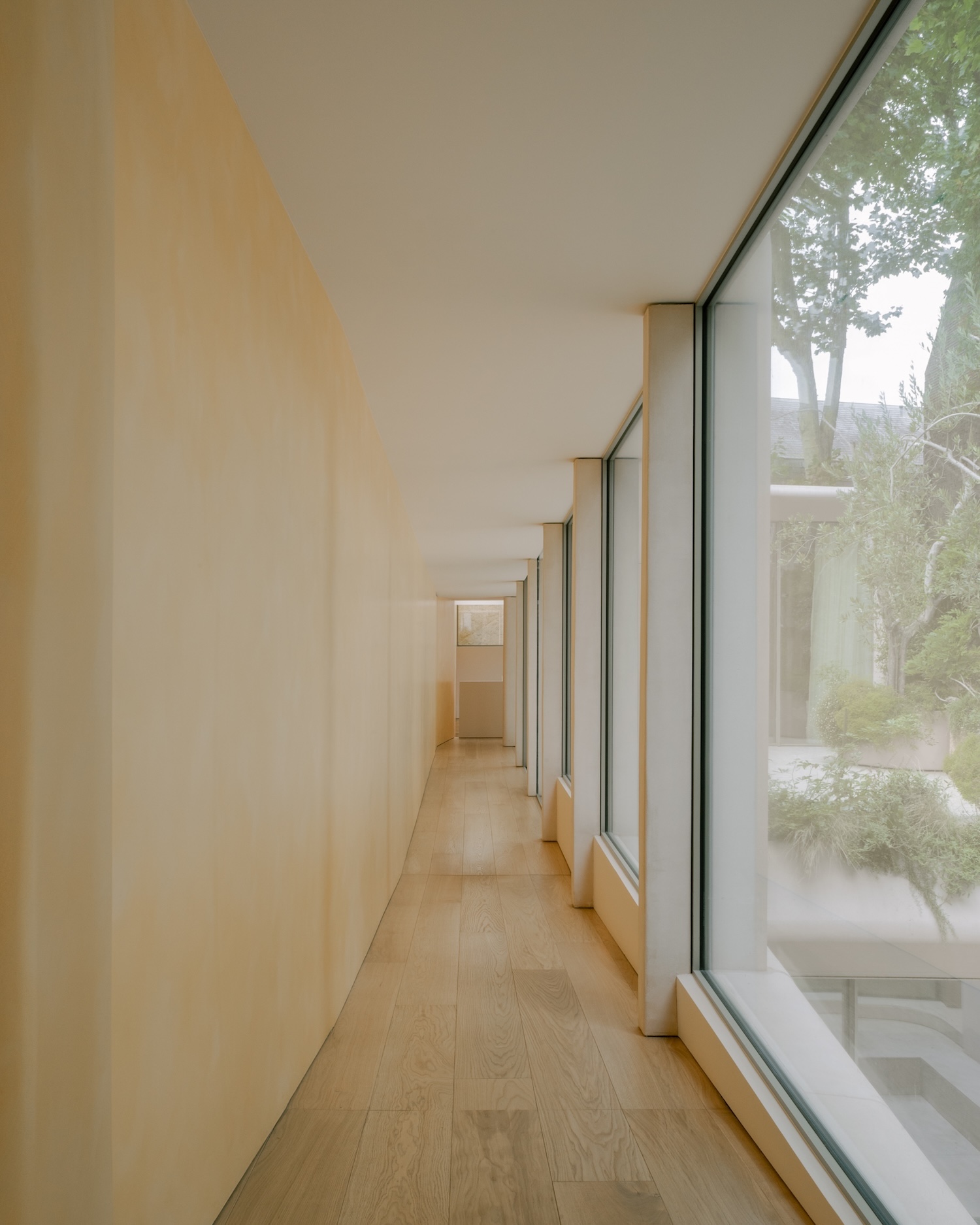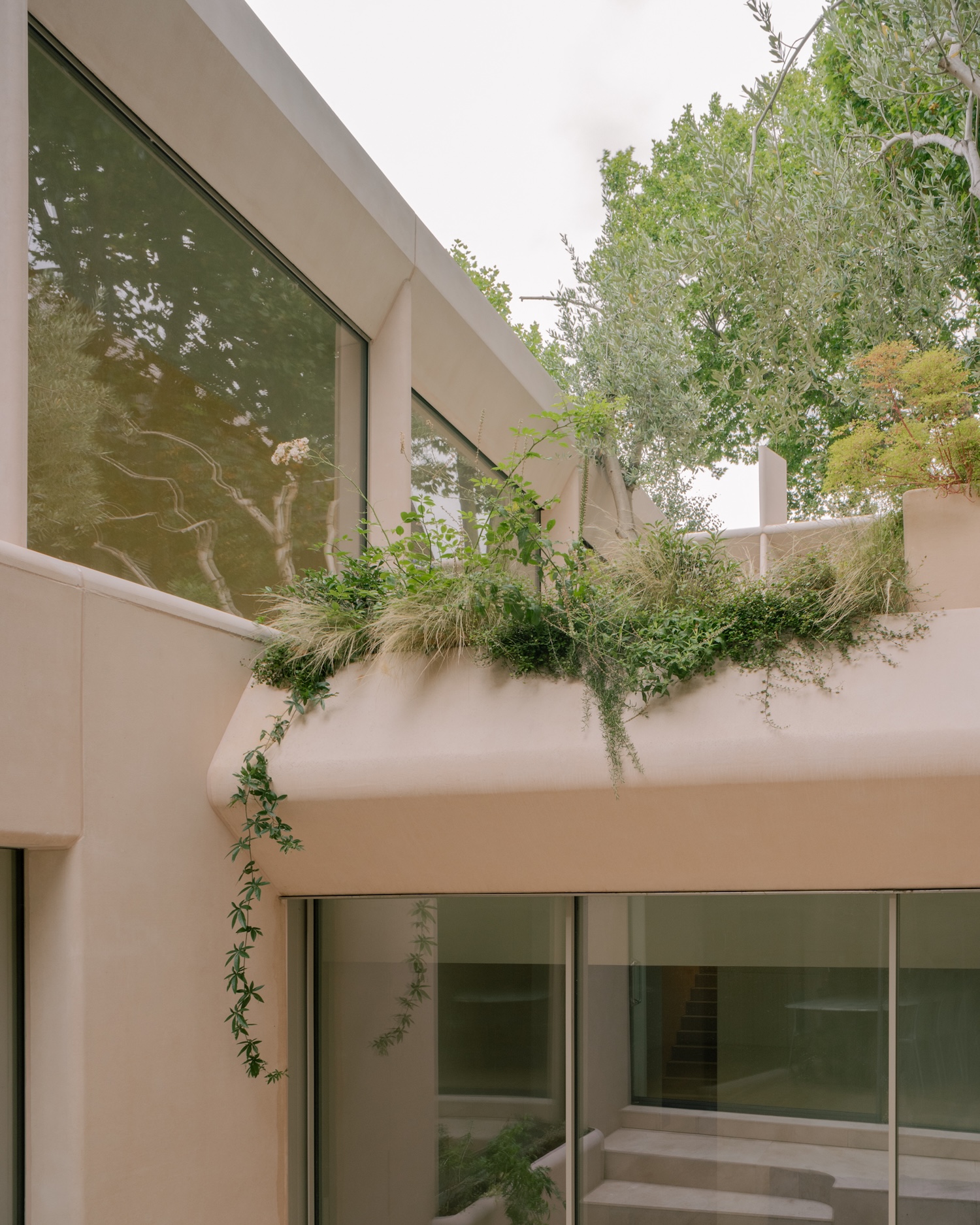 Central to this sequence is the relationship between light and material. A refined colonnade mediates the transition between lower and upper courtyards, framing shifting views of planting and sky in a manner that recalls Carlo Scarpa’s episodic approach to threshold and procession. A sculptural lightwell, finished in a lime-textured render piece by artist Guy Valentine, acts as a slow-motion timepiece – its surface catching and releasing light across the day in ways that animate the adjacent spaces without any mechanical intervention.