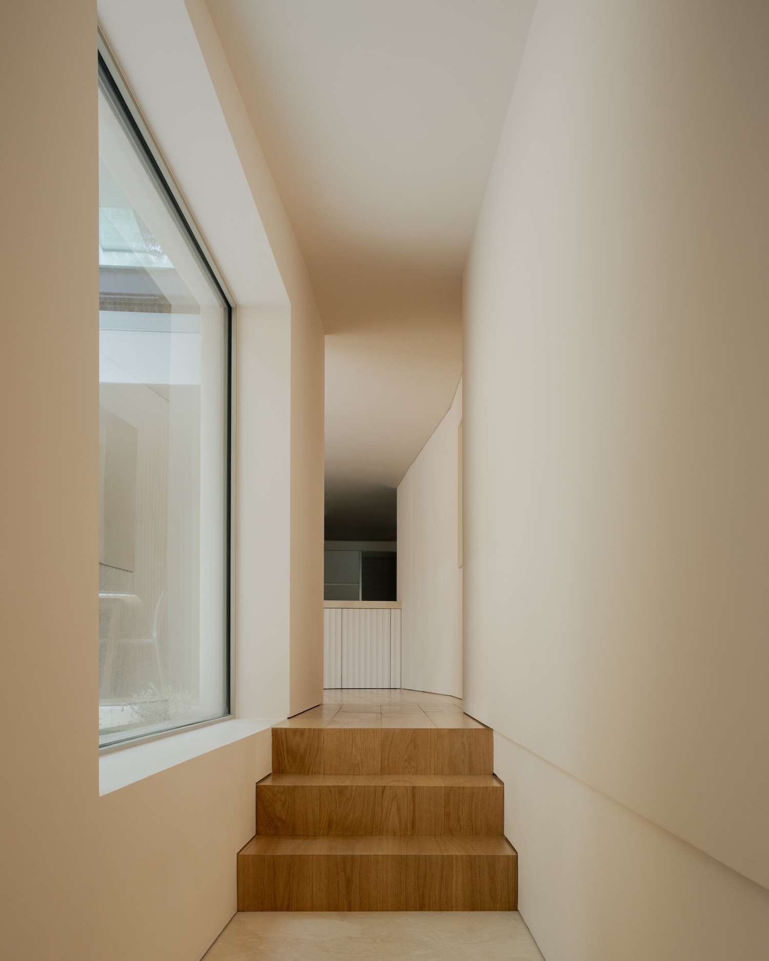 Travertine stone grounds the extension in geological permanence, its warm fossil-flecked surface absorbing and redistributing light in a way that GRC concrete panels – cool, crisp, and precise – deliberately contrast. Together they establish a dialogue between the ancient and the fabricated that has defined a certain strand of contemporary British residential architecture, from Carmody Groarke to Patel Taylor. Soft timber linings layer additional warmth into the interiors, while bifold openings, skylights, and courtyard windows ensure the spaces remain responsive to London’s characteristically muted and shifting light conditions.
