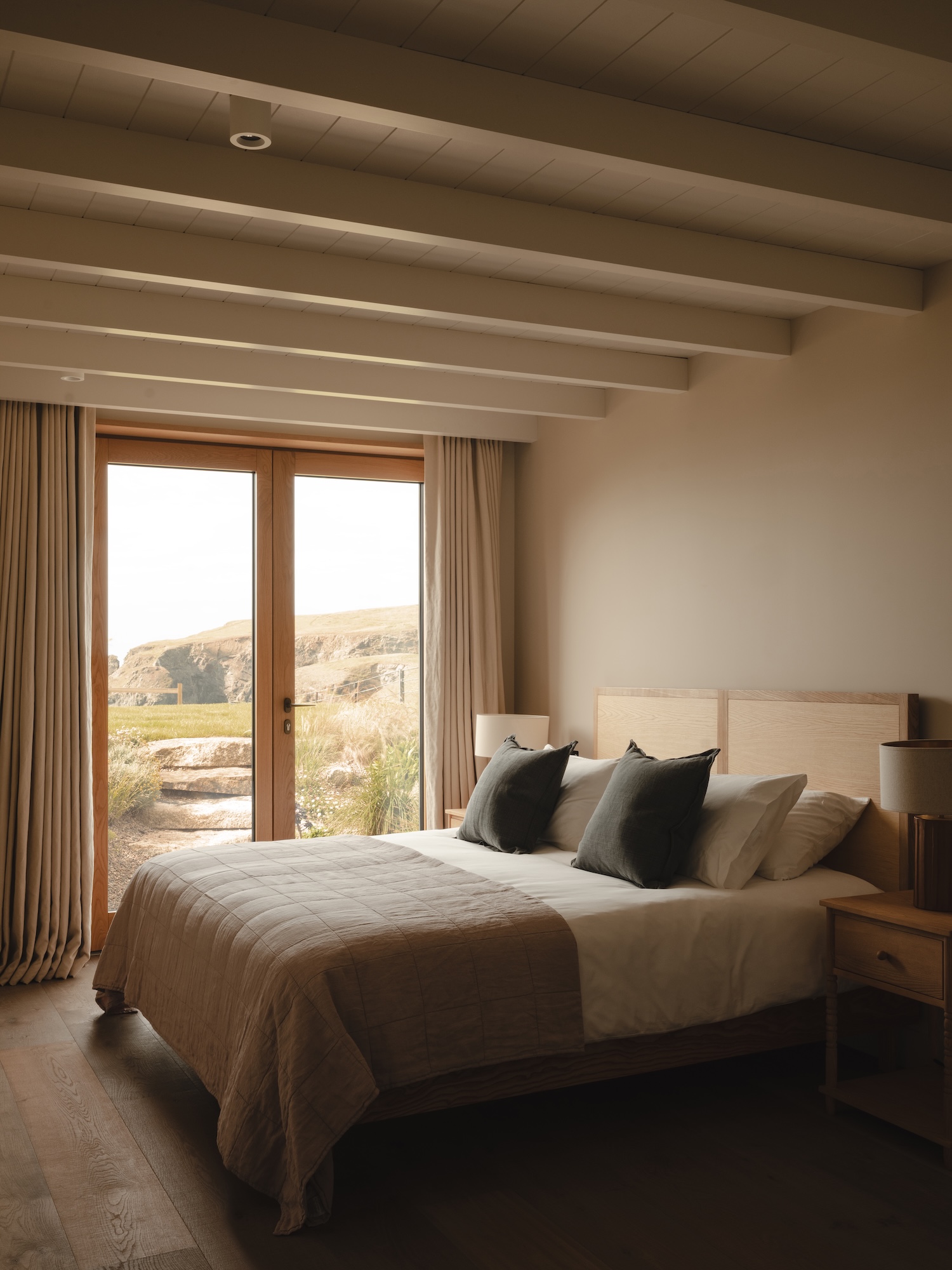 Inside, the material palette shifts from concealment to revelation. Breathable clay and lime paints – including Little Greene’s Rolling Fog and Clay Pale alongside Bauwerk limewashes in Cassava and Witch Hazel – layer tones drawn from sand, stone, and driftwood. These finishes are not merely decorative; clay regulates interior humidity, and lime paint allows walls to breathe, making both choices as functional as they are atmospheric. Timber-lined ceilings replace conventional plaster throughout, bringing warmth and acoustic softness to spaces that might otherwise read as cool or austere. Wide oak boards ground the interior in a material that ages visibly and well.