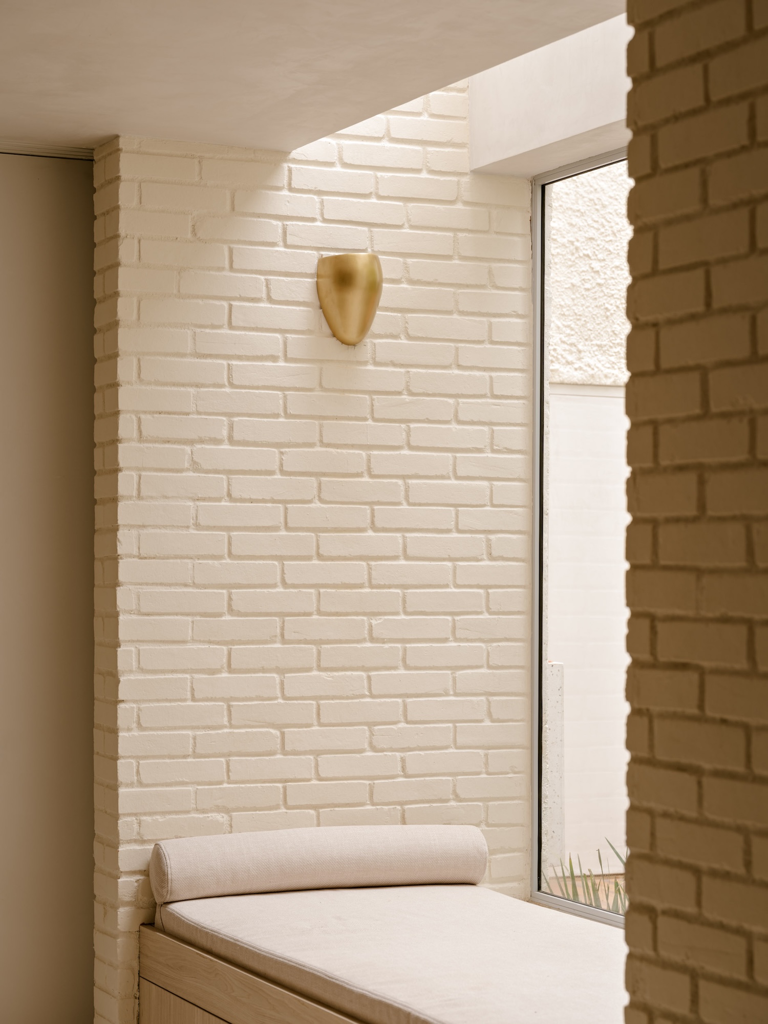 The architectural strategy divides the program across two volumes connected by a central courtyard. This courtyard operates as more than circulation – it creates cross ventilation, frames garden views, and establishes visual continuity between front and rear. The primary two-story volume addresses the street in white-painted brick, a material choice that references São Paulo’s modernist heritage while providing thermal mass and textural depth. At strategic points, this brick continues into interior spaces, dissolving the boundary between envelope and inhabitation. Wood appears selectively – entrance door, facade windows, rear deck – warming the composition without overwhelming the material hierarchy.