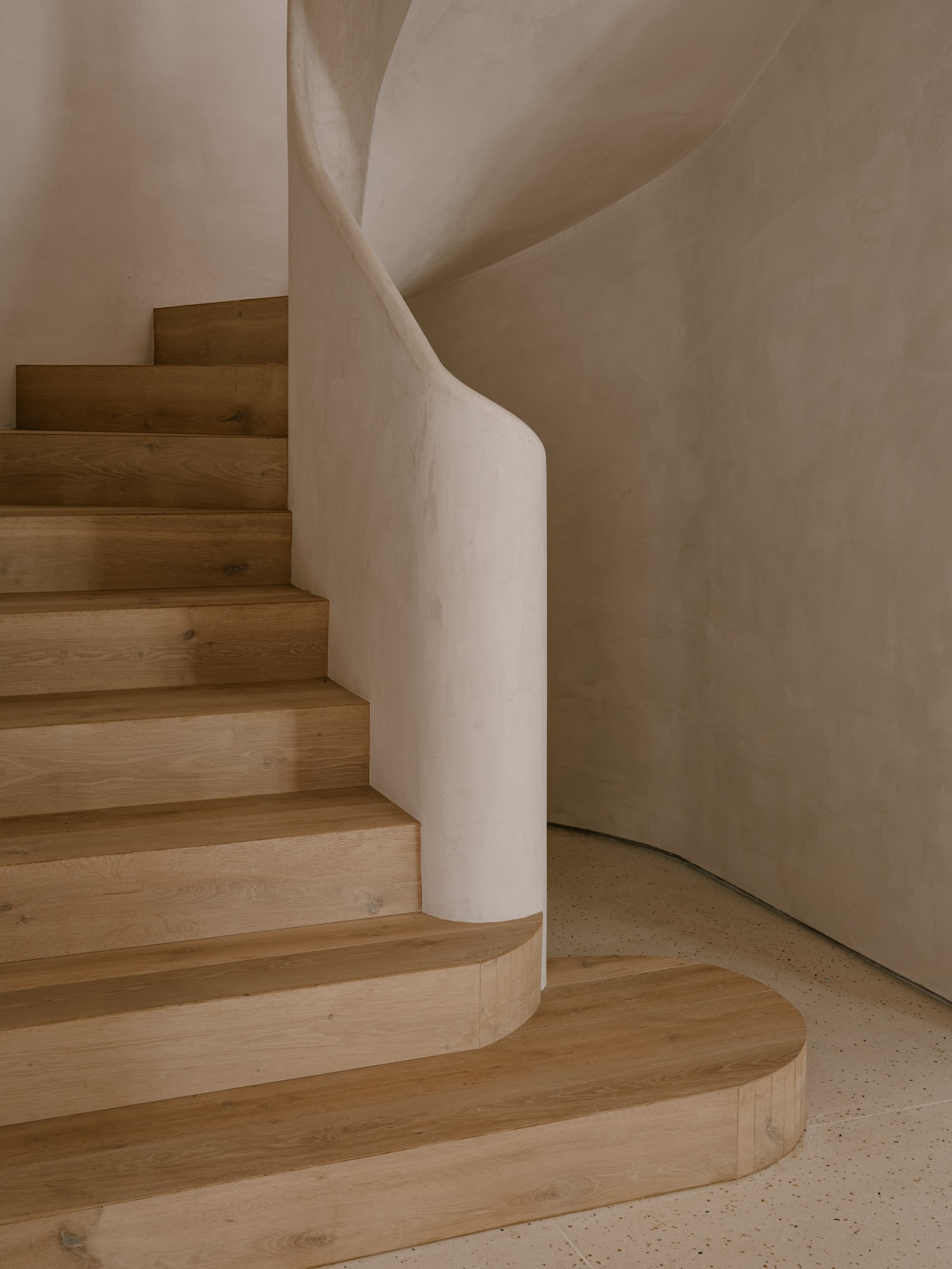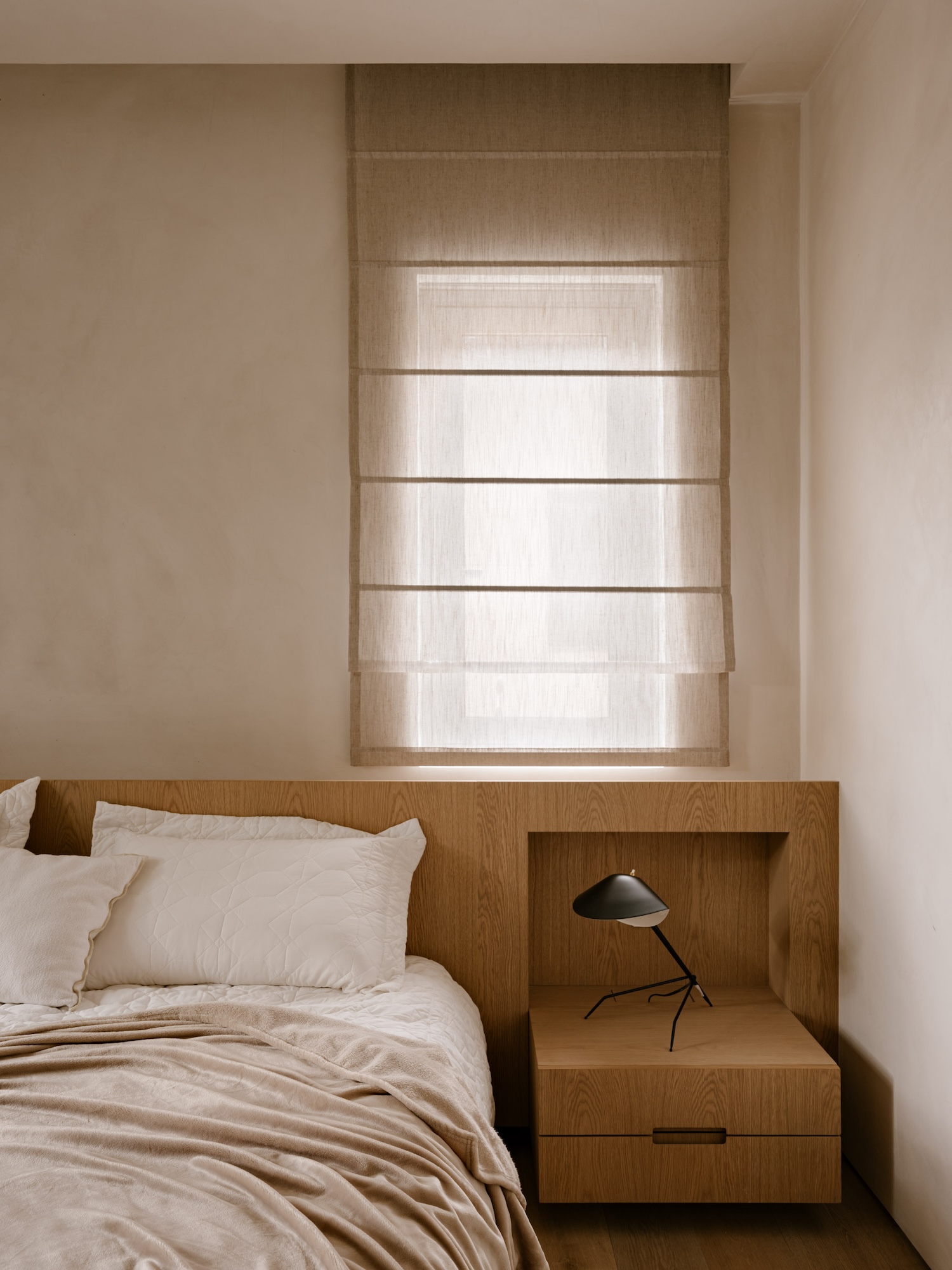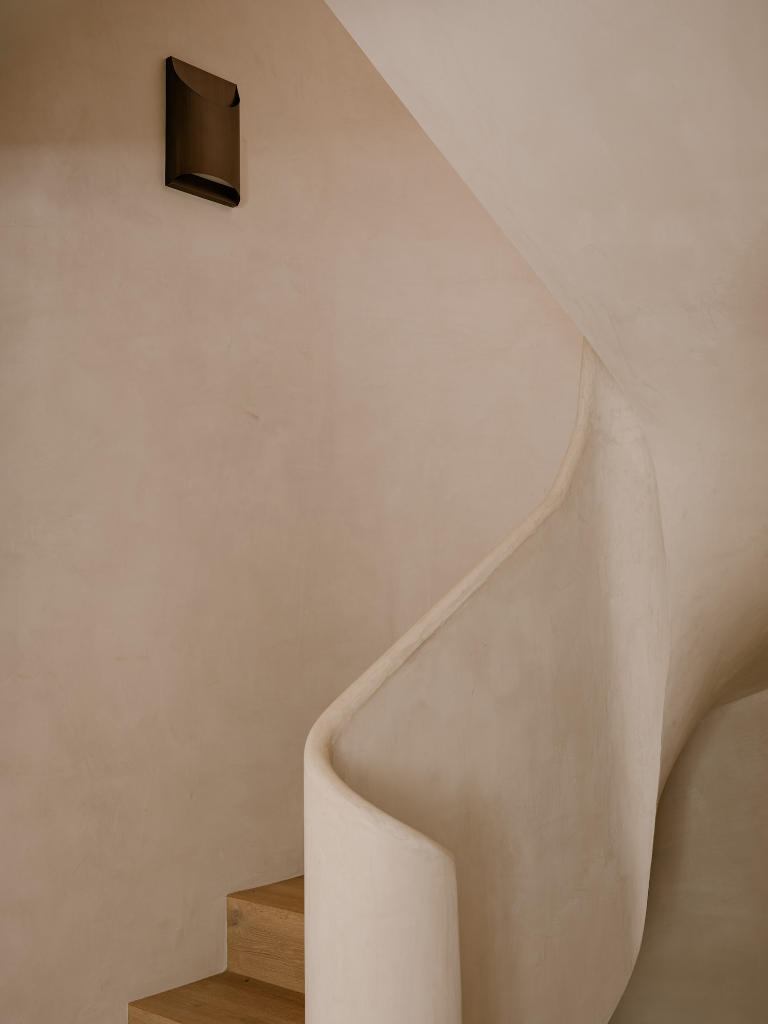 Inside, the ground floor social spaces unfold with deliberate fluidity. The kitchen abandons conventional isolation, splitting into two linked zones: a social area with casual dining counter and a technical preparation zone concealed by built-in sliding doors. Large openings flood these spaces with daylight, while a linear bench beneath the window transforms the kitchen into a place for lingering rather than mere function. Curved ceiling edges eliminate hard transitions, reinforcing the home’s continuous spatial language.