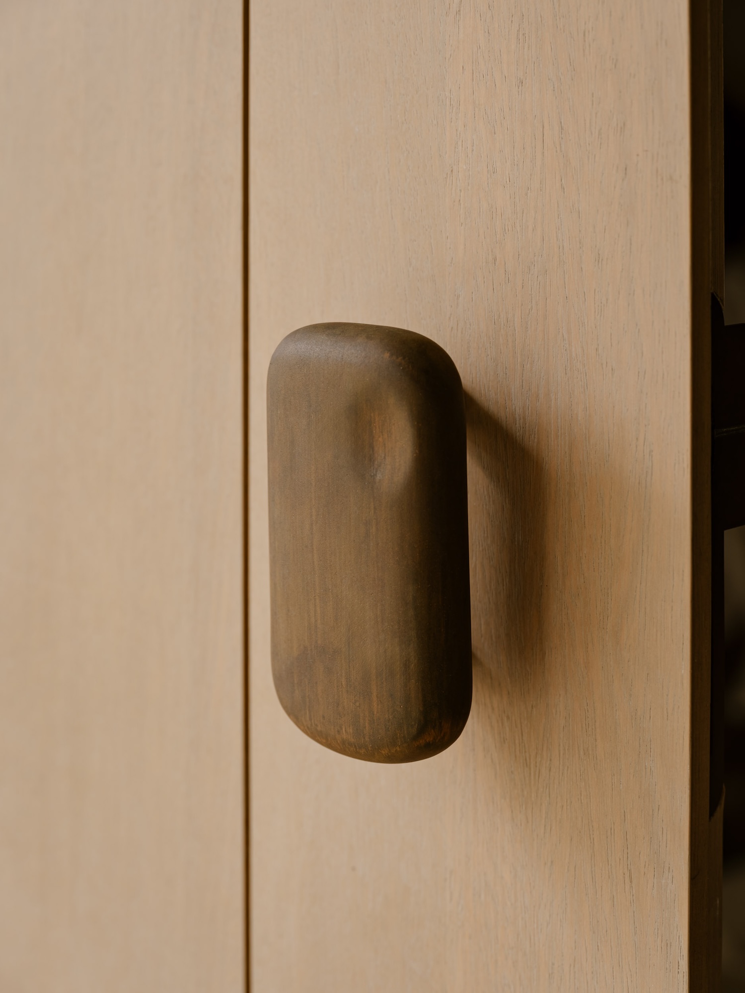 The living room ceiling punctures with circular apertures that diffuse daylight like suspended light wells. This manipulation of natural illumination recalls the spatial strategies of Luis Barragán, where light becomes both material and atmosphere. A central floor fireplace with exposed flue anchors one wall, flanked by suspended wooden-slat shelving that organizes the family’s collection with measured intimacy. The furniture selection curates modern and contemporary icons – Jorge Zalszupin’s Ondine armchairs, Jean Gillon’s Jangada chair, Ini Archibong’s Atlas Dining Chair – each piece chosen for formal rigor rather than decorative impulse.