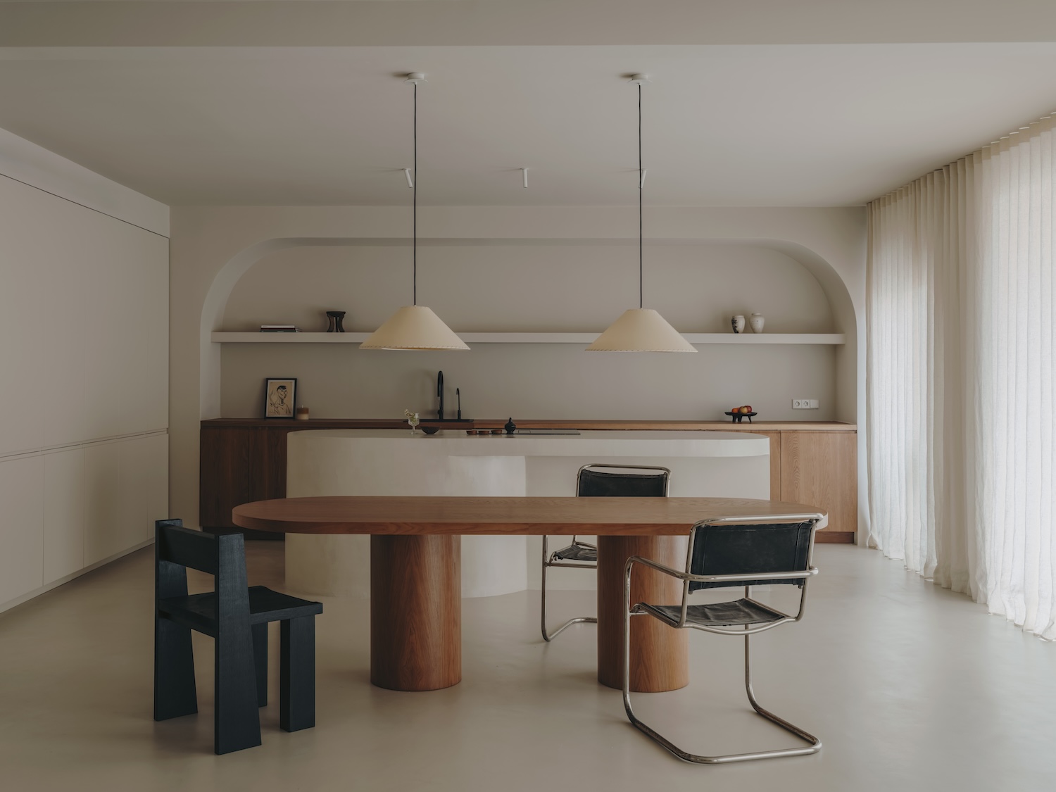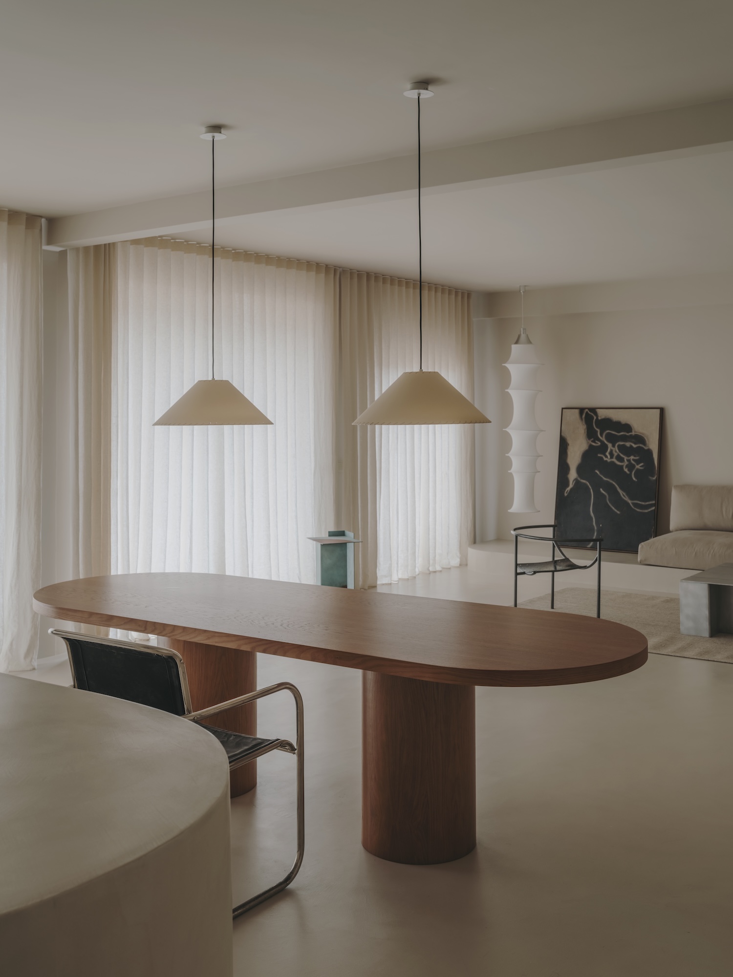 “We designed the interiors as a living gallery,” the designers explain, and their approach reflects a curatorial sensibility that transcends mere aesthetic arrangement. The space becomes a carefully orchestrated collection where stories unfold through a thoughtful integration of past and present. Contemporary pieces from Vasto Gallery establish a compelling conversation with vintage treasures from Fenix Originals and Polop Store, creating temporal layers that enrich the experience of the space.